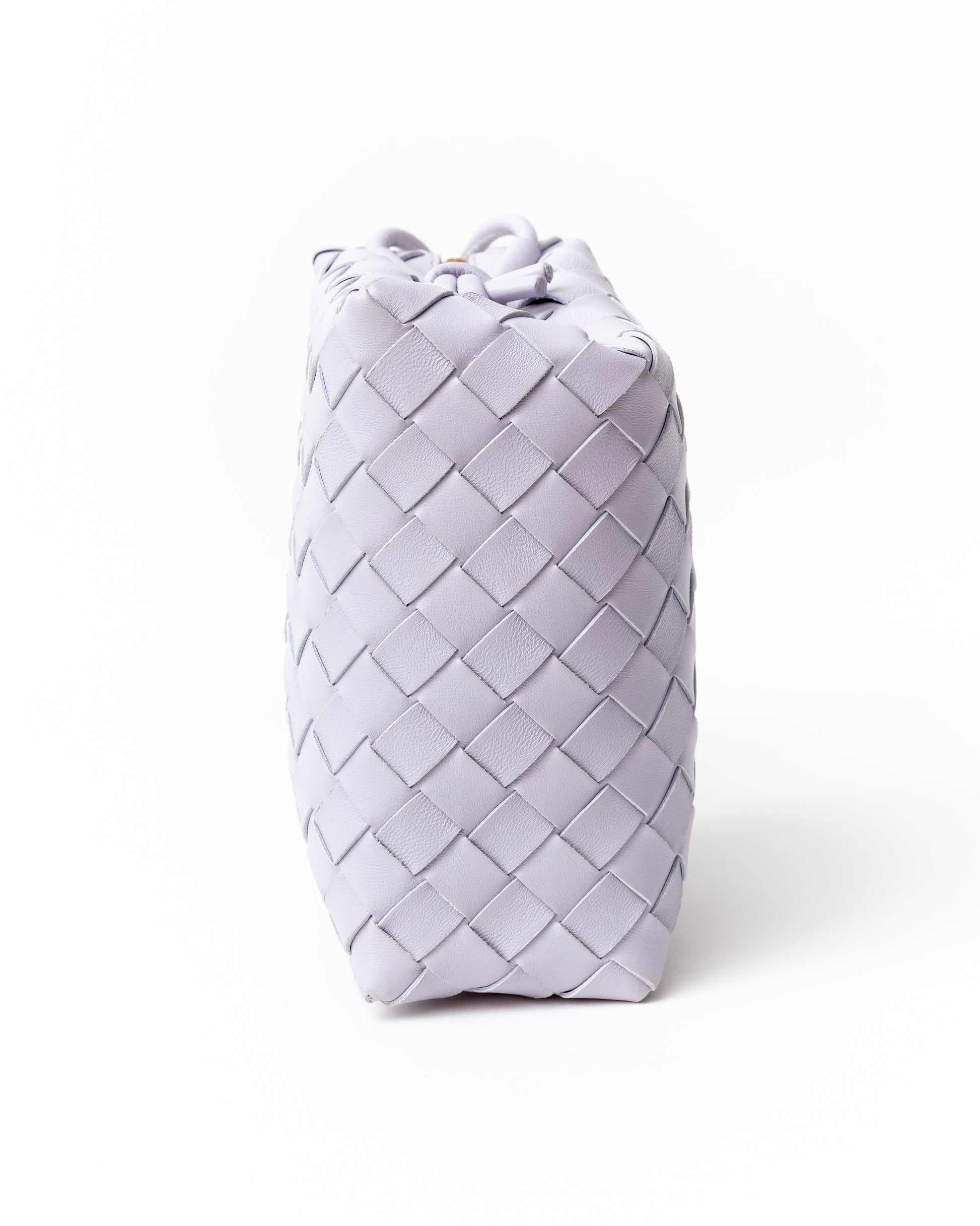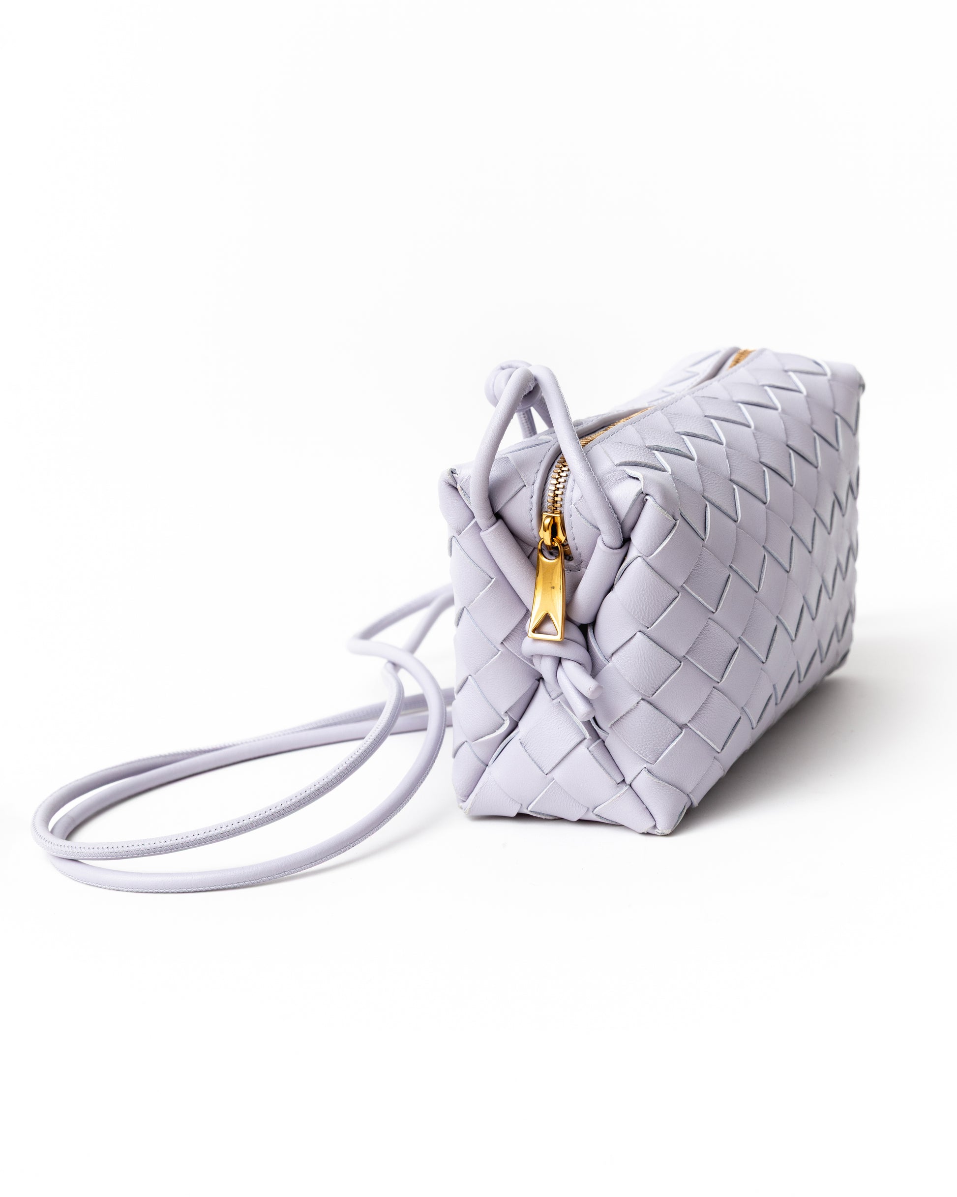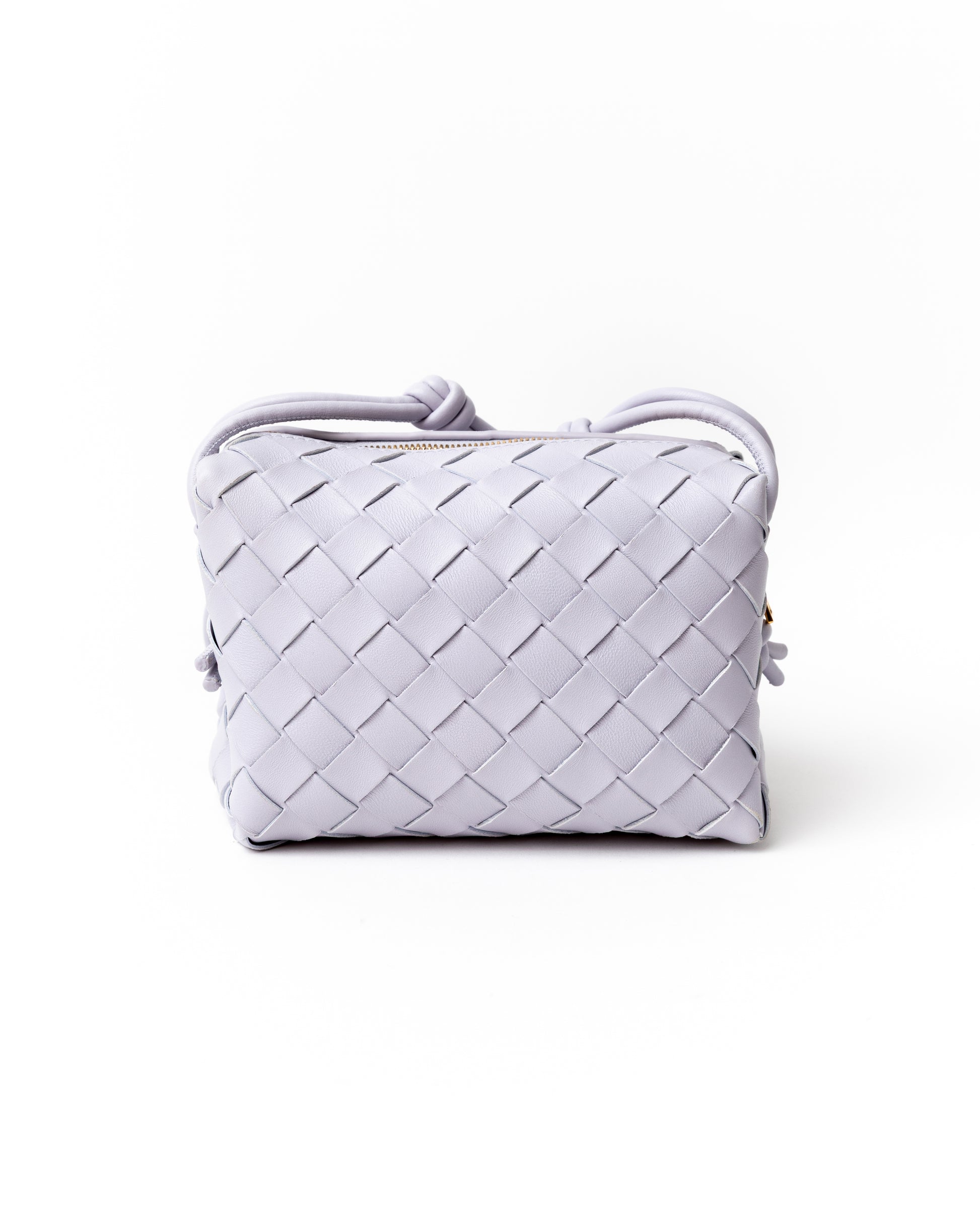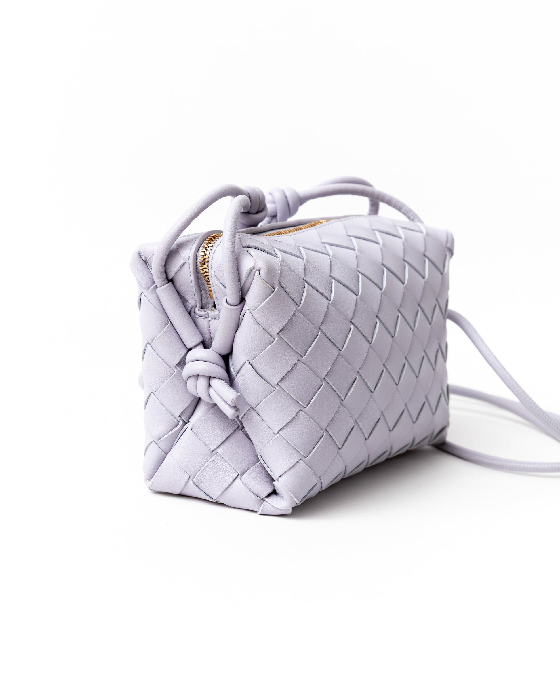 - The bag features a light purple lambskin woven leather trim and a long leather crossbody strap.