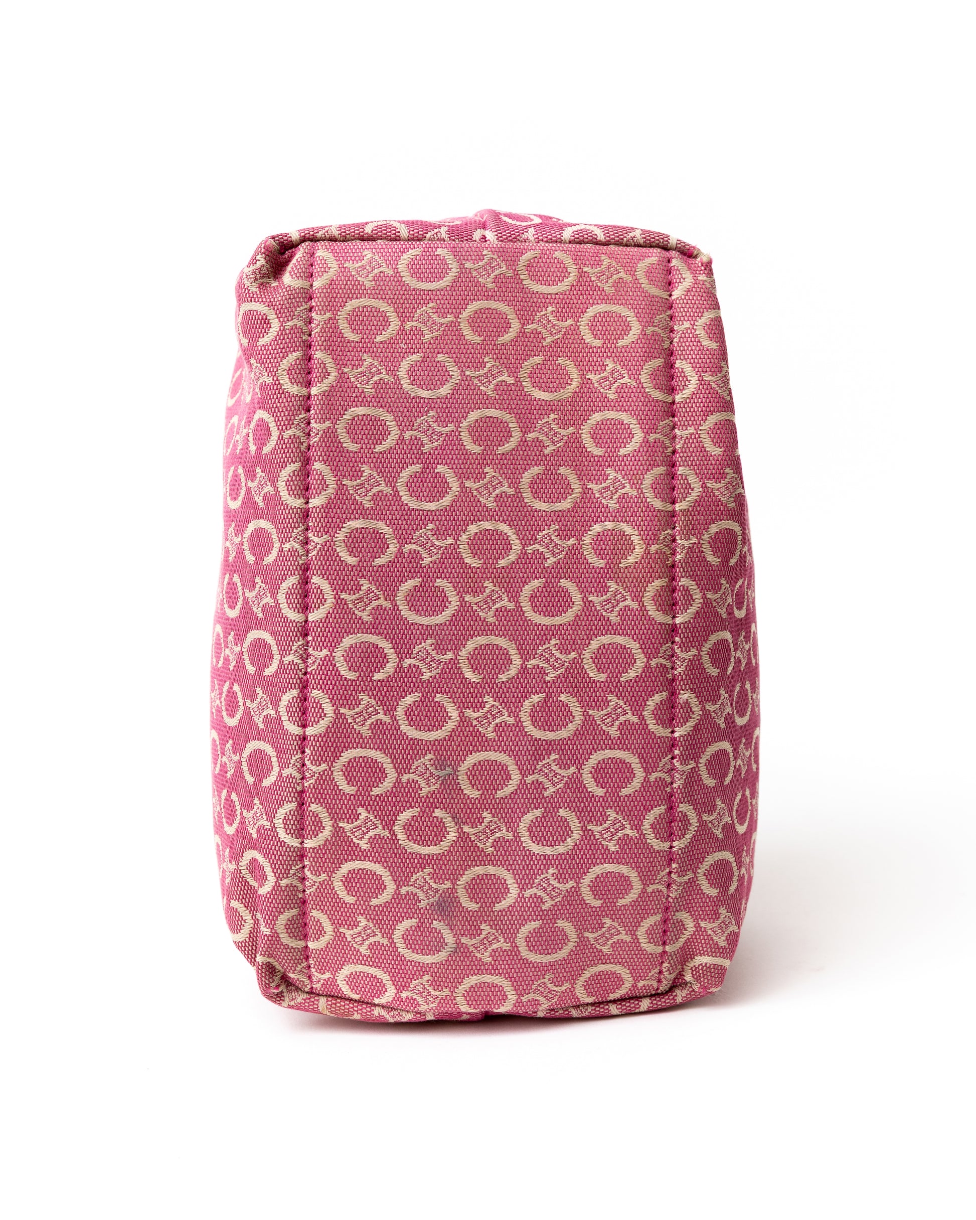- The bag features a pink canvas triomphe macadam exterior and a pink patent leather strap.