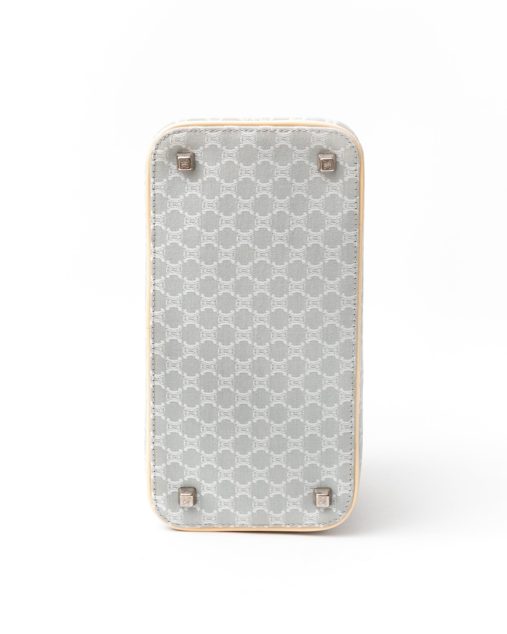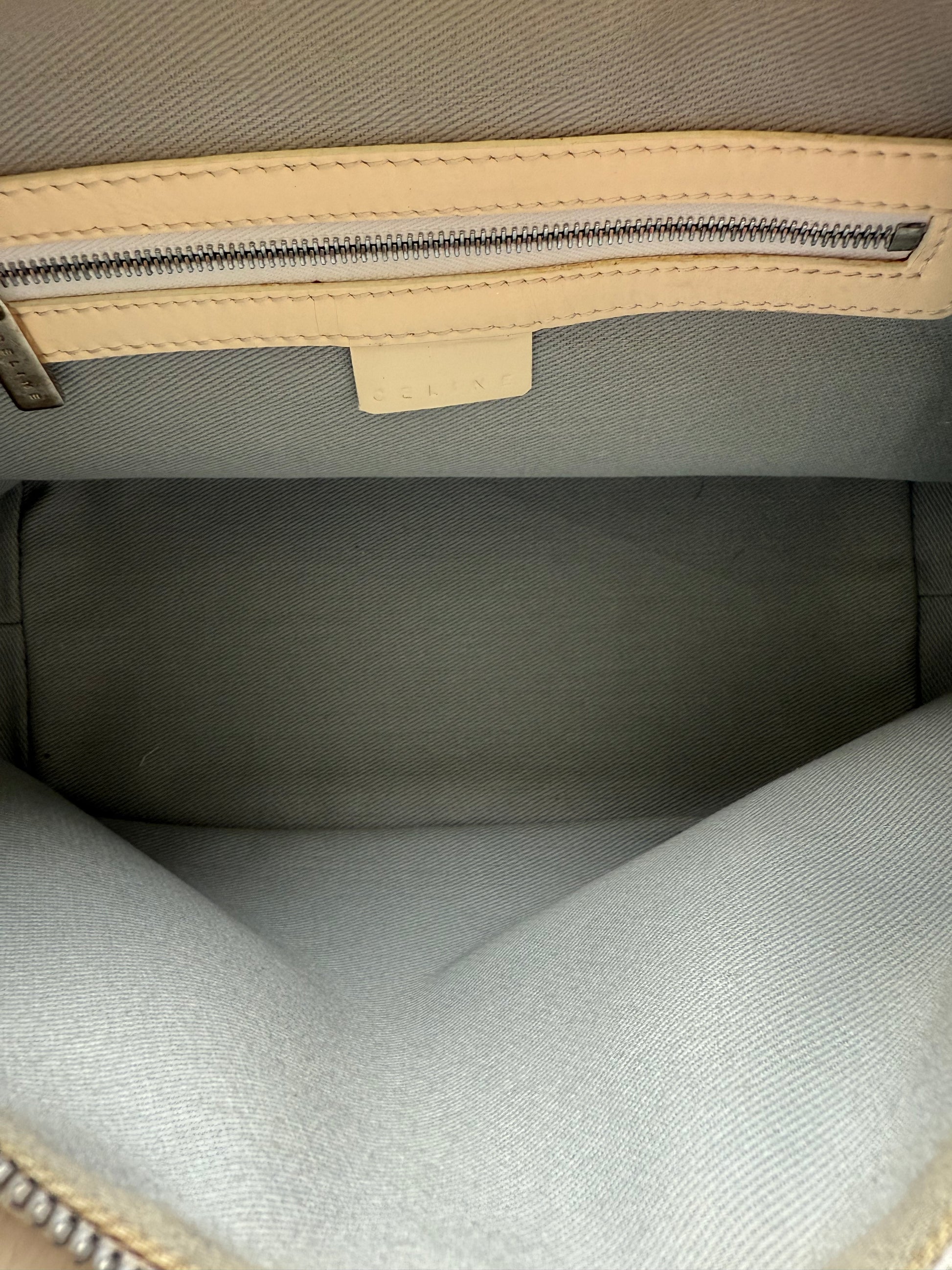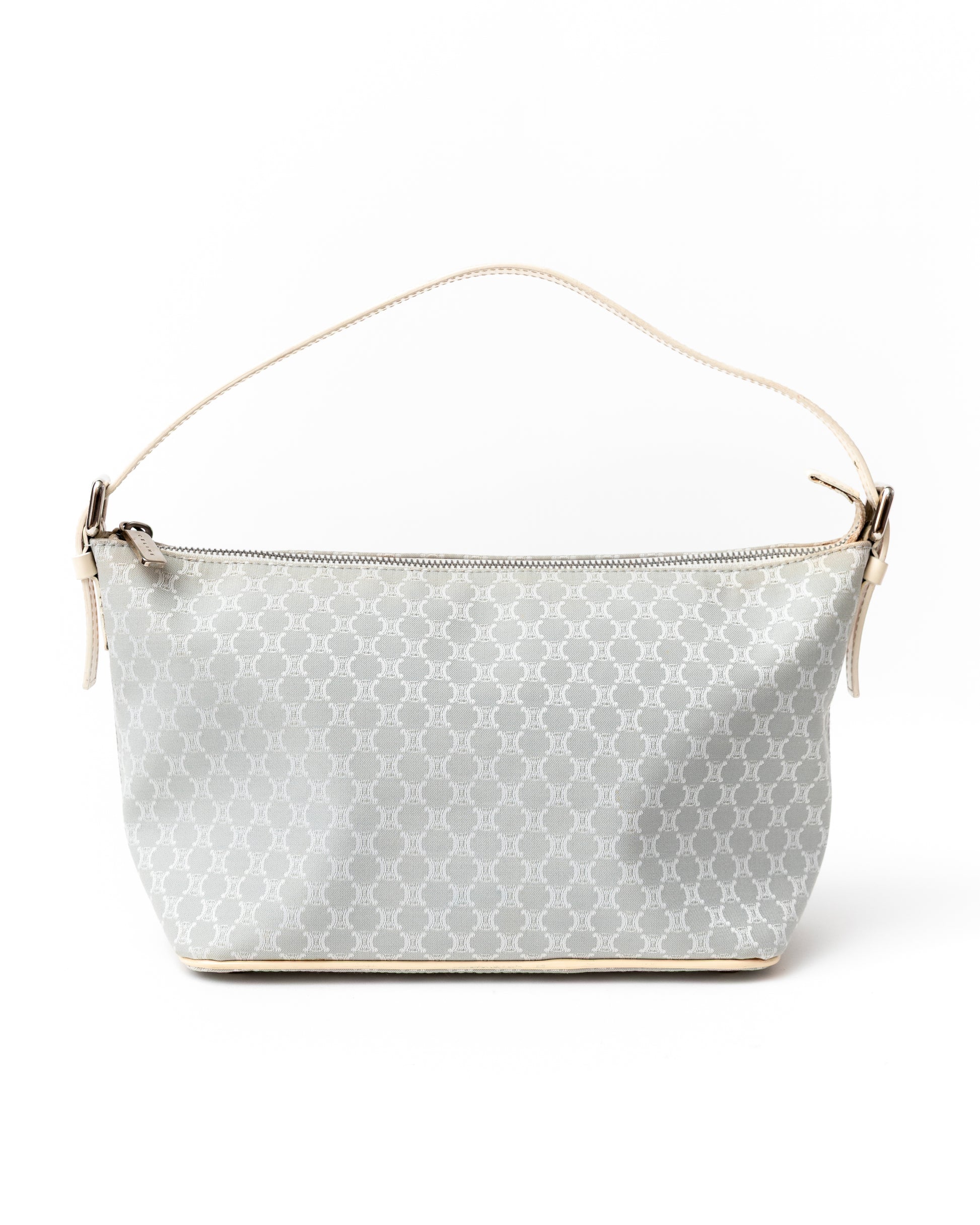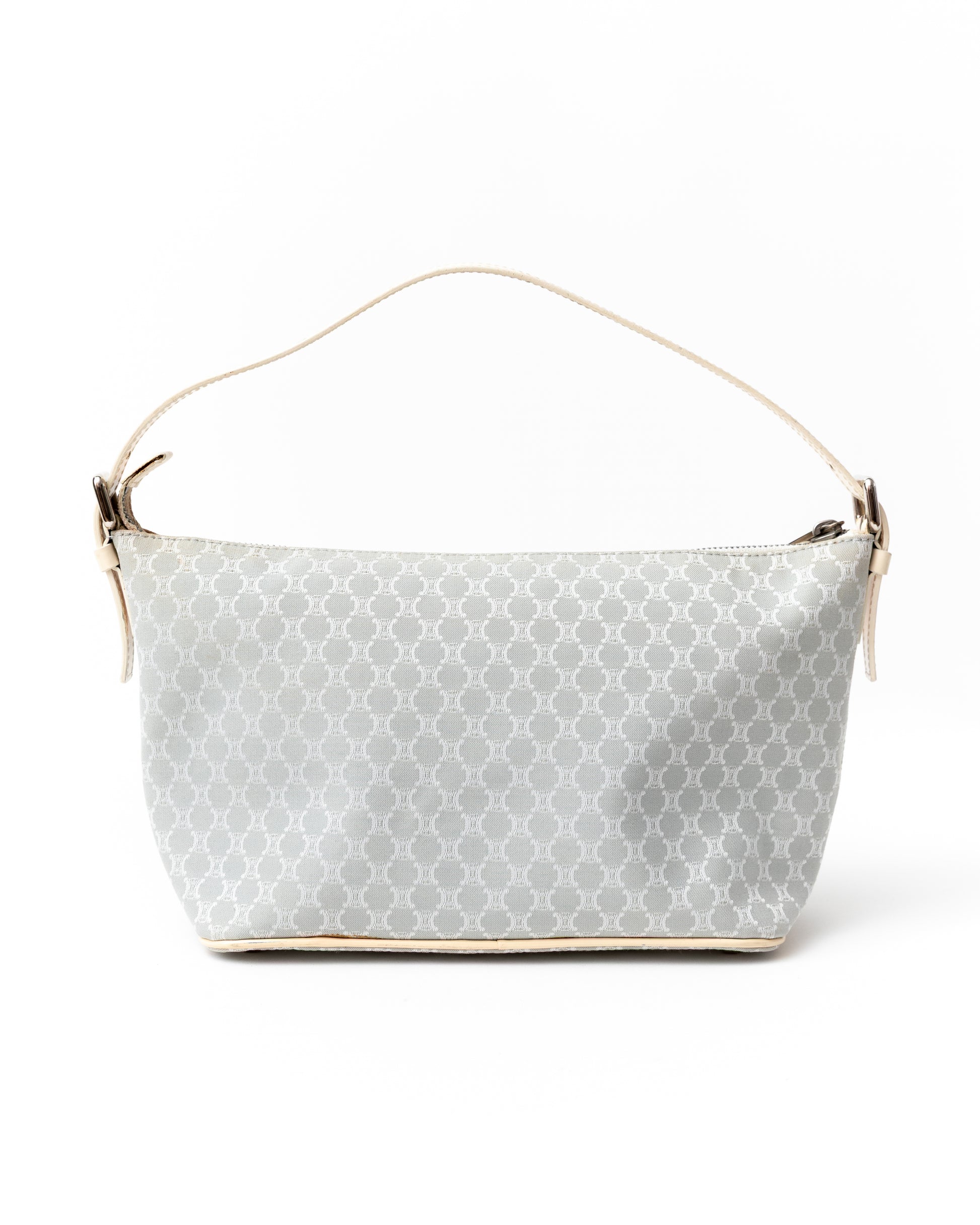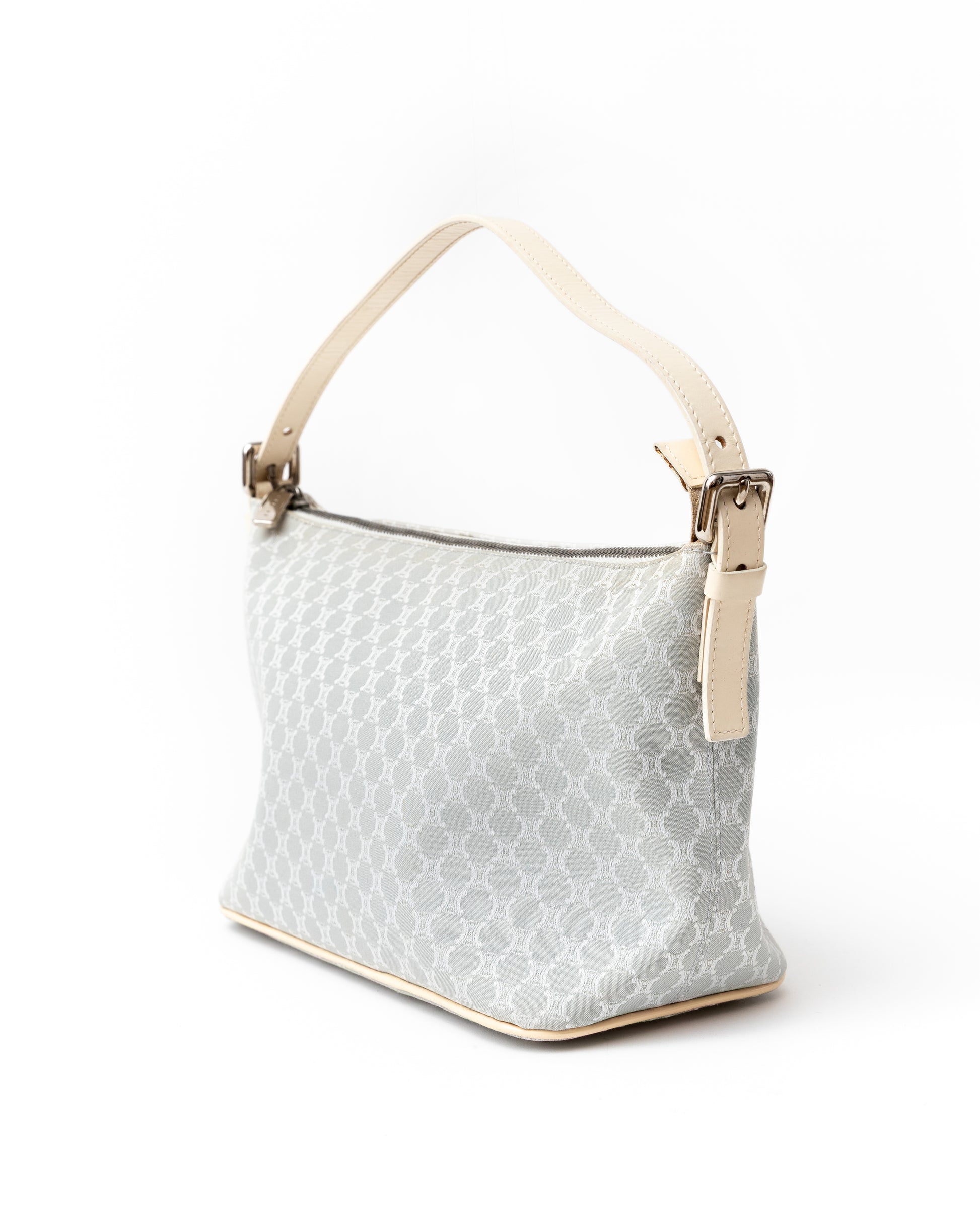- The bag features a light blue canvas exterior, with an off-white, creamy leather strap that is adjustable. Can be worn over the shoulder or as a handbag.