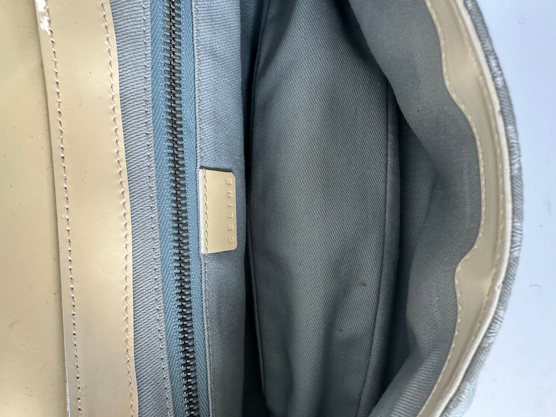 - Features: snap flap closure, triomphe light blue denim, spacious interior with zippered pocket, cream patent leather.