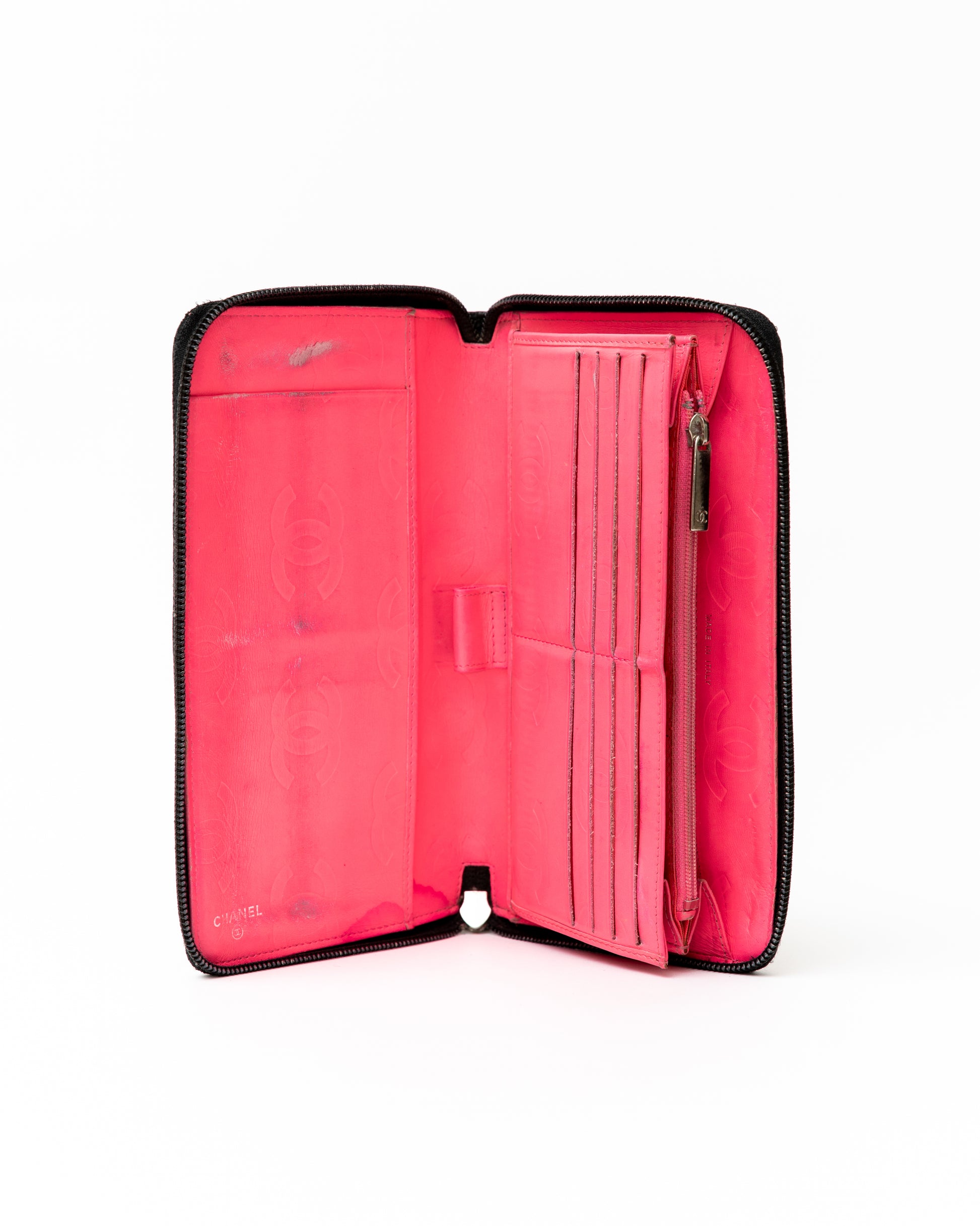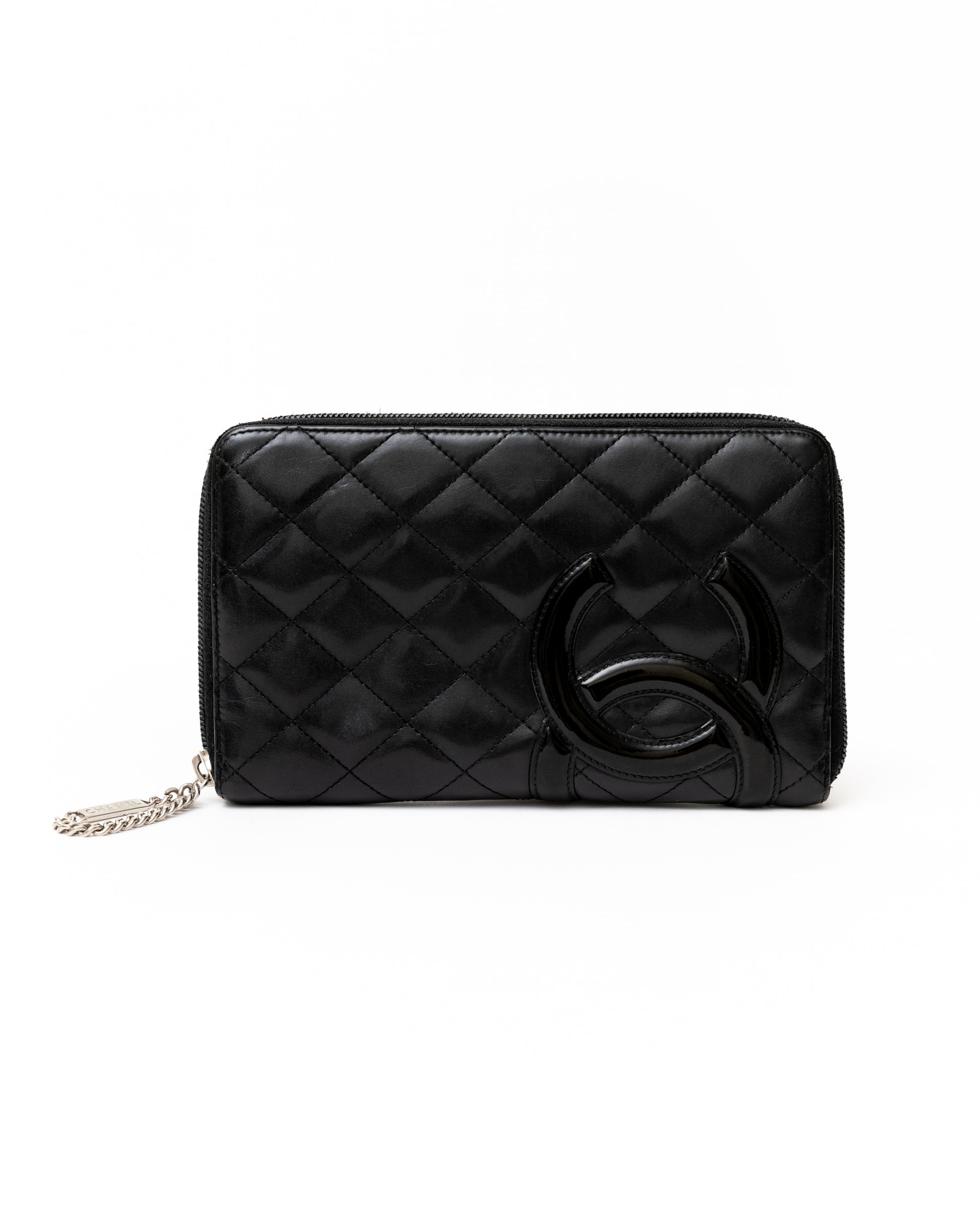 - This wallet features the iconic Chanel quilted leather and patent CC logo in excellent condition with an adorable Chanel plaque zipper pull.