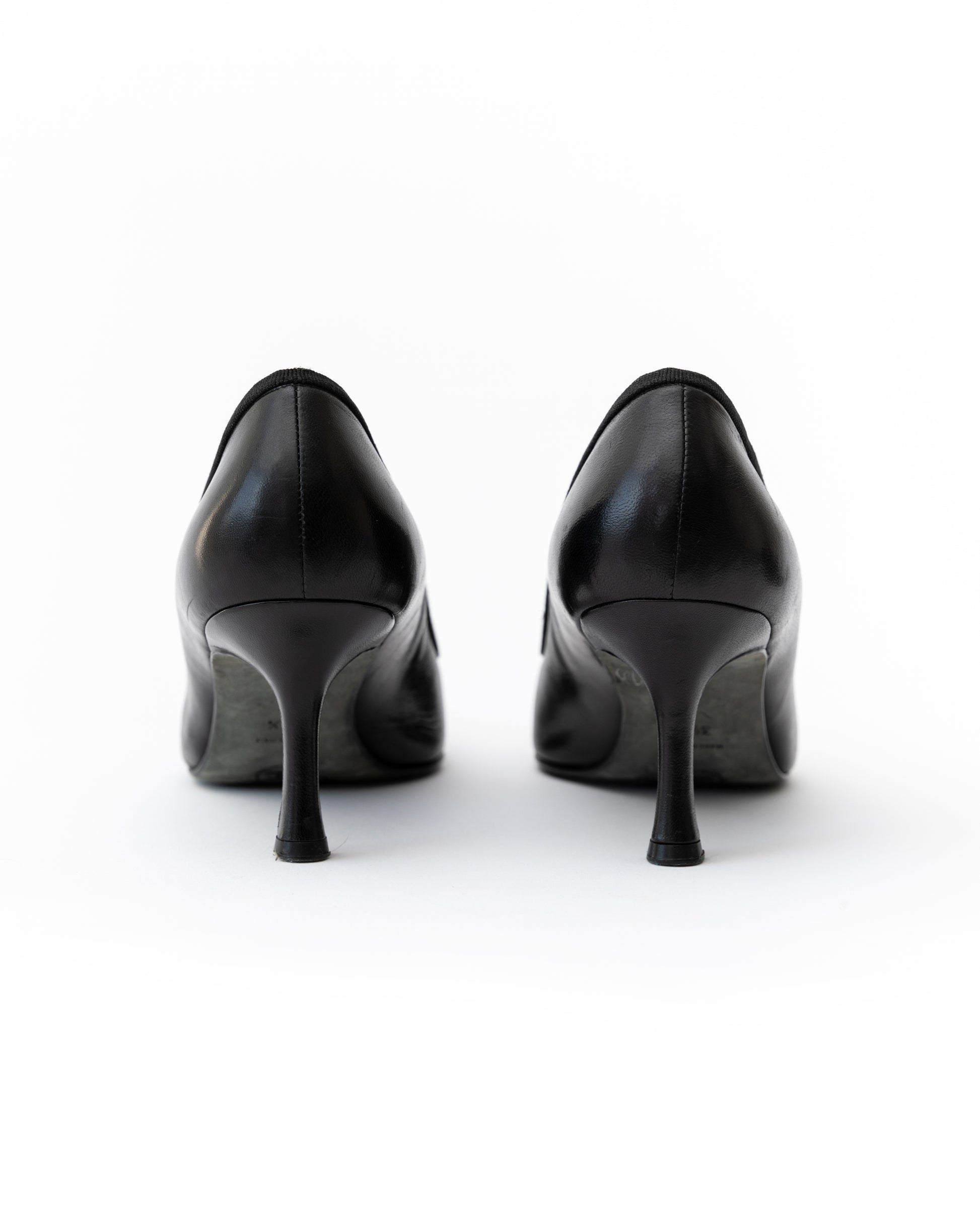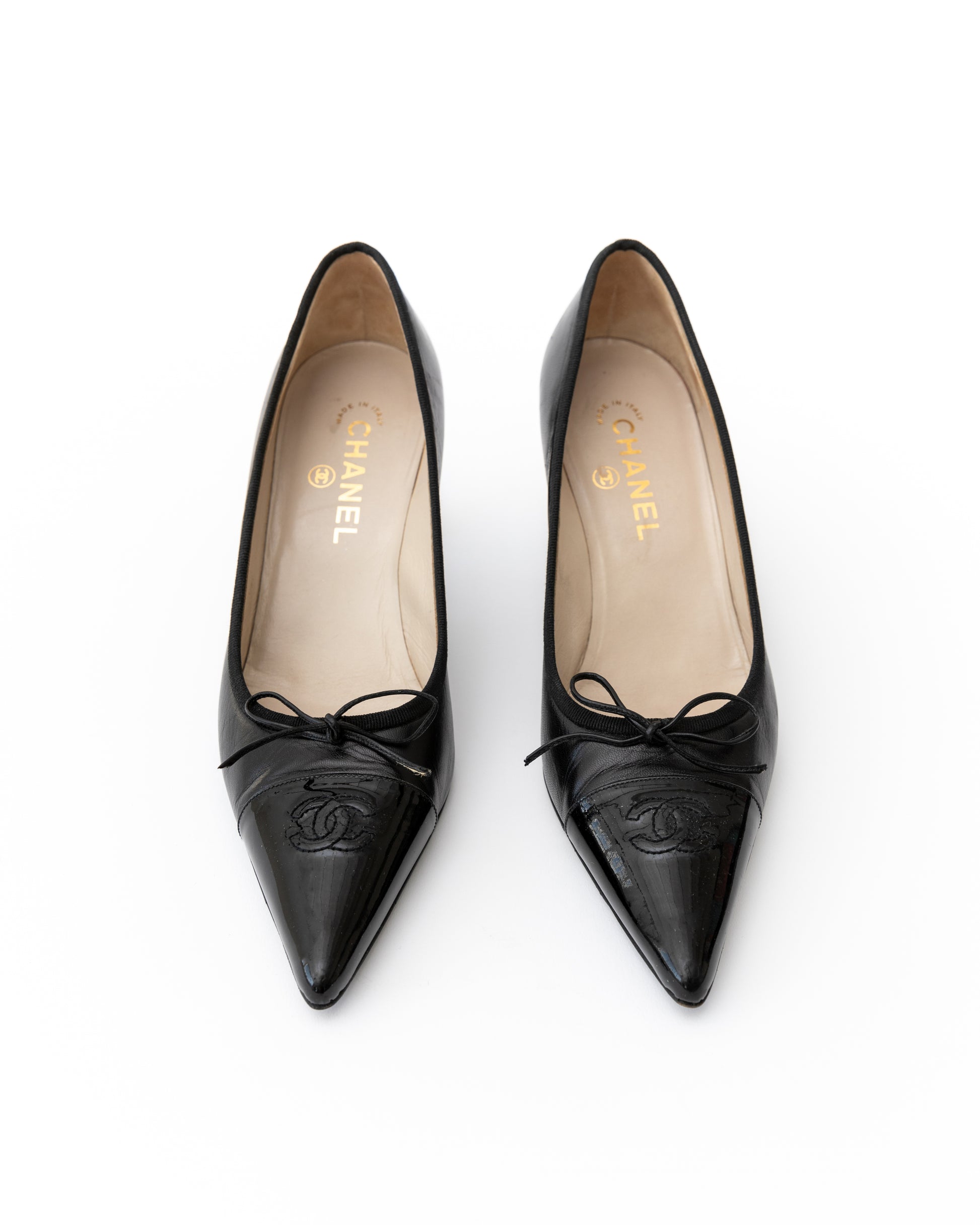- For the girlies that love a classic heel - these Chanel cuties feature black lambskin leather with Chanel cc logo stitching and sleek bow detailing.