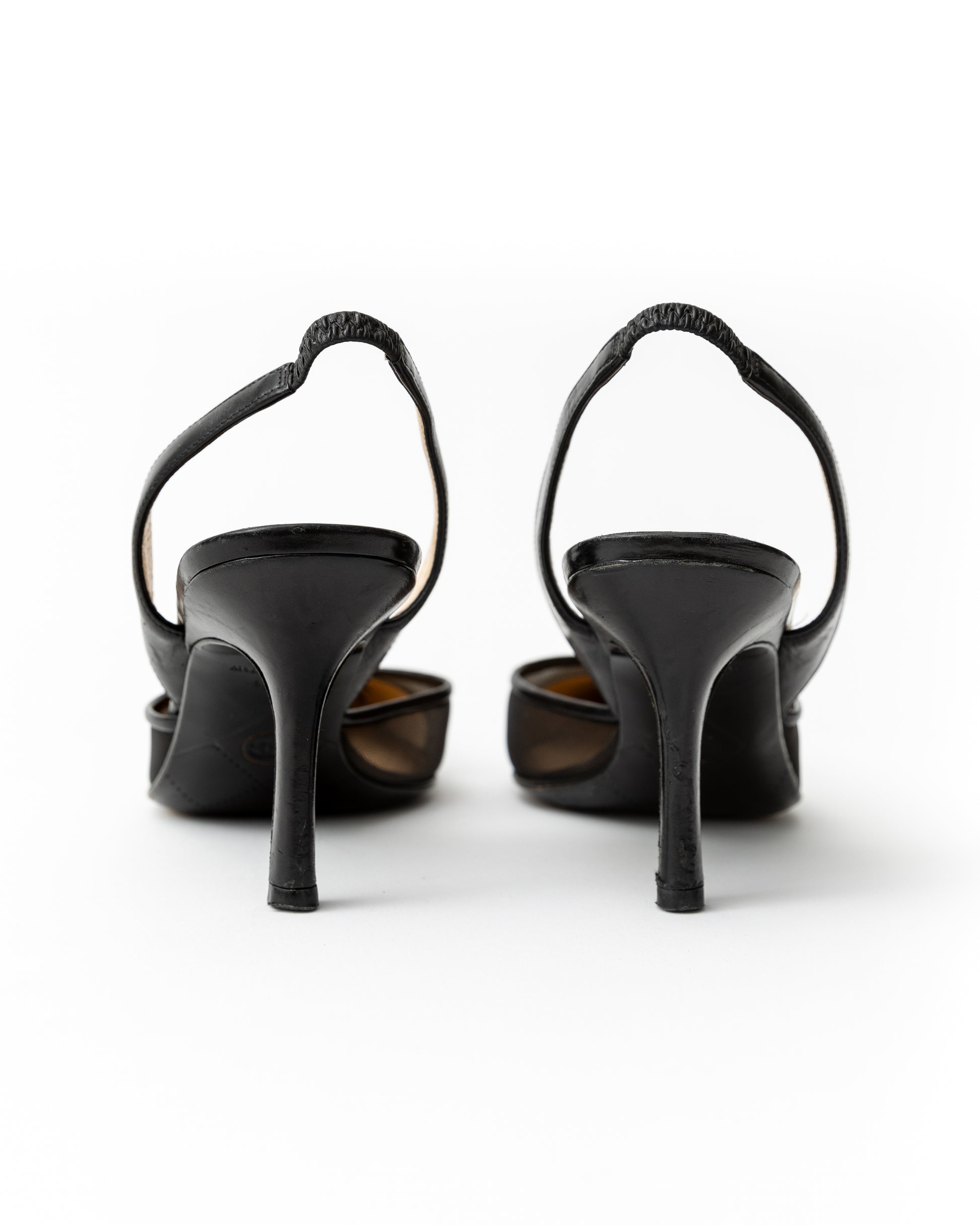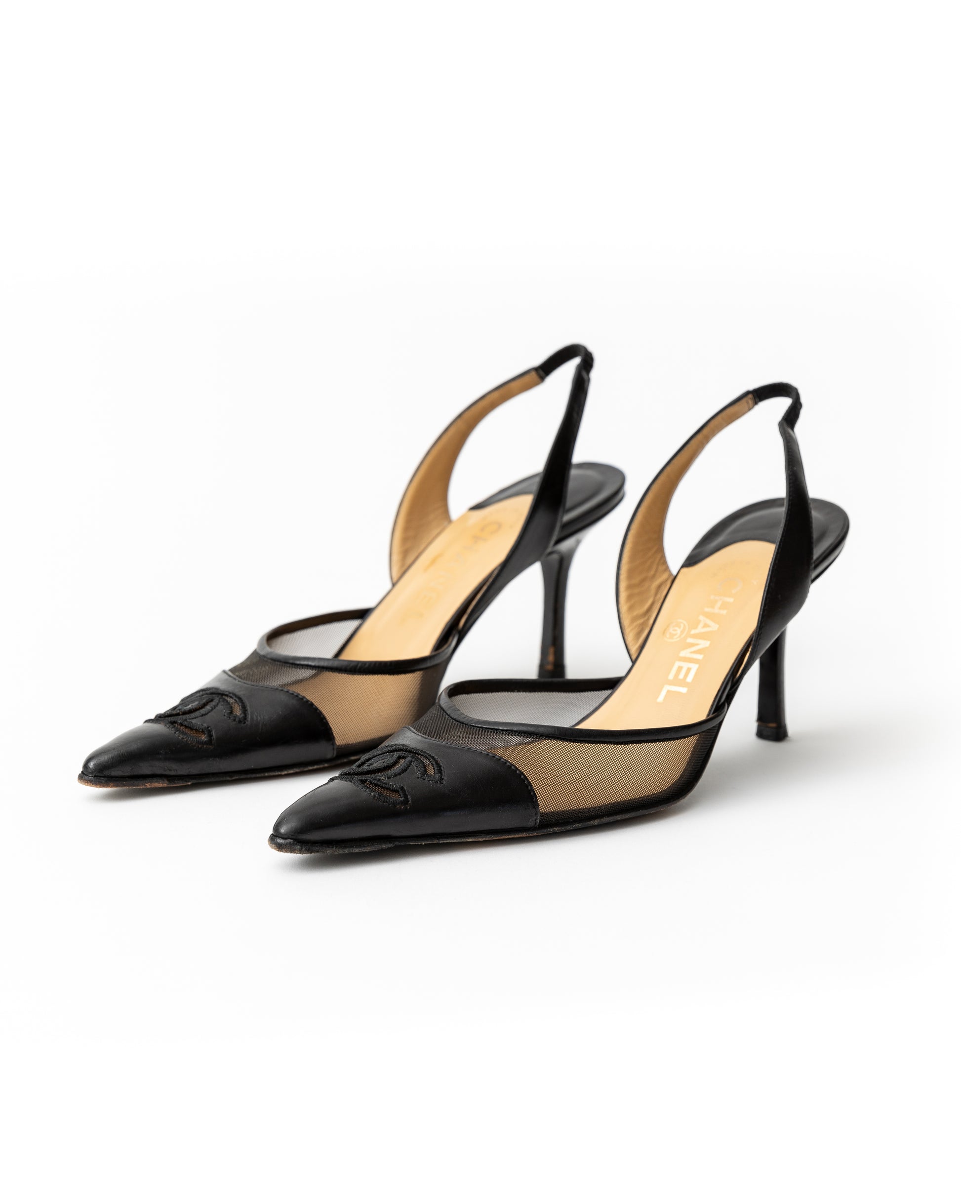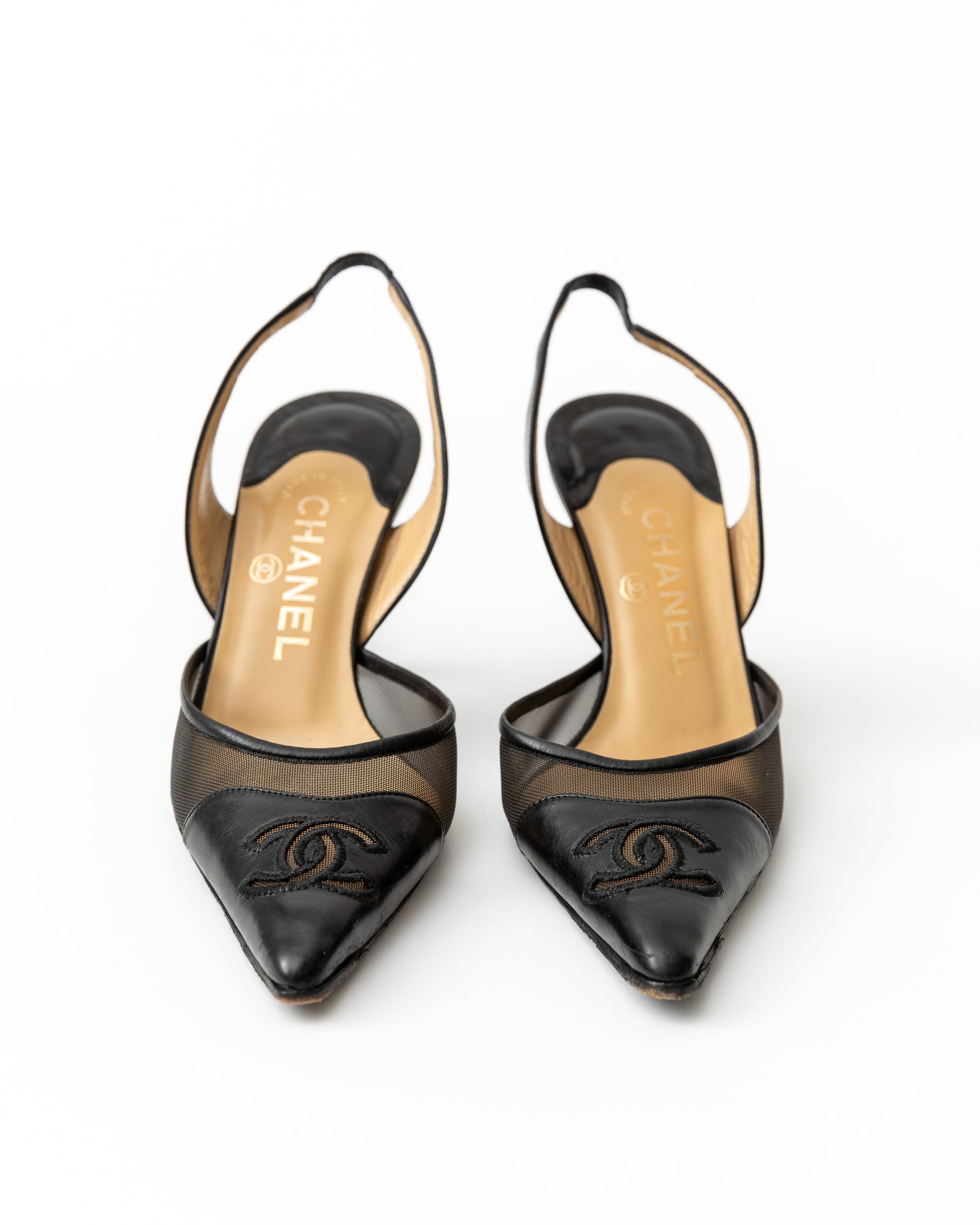 - These classic and chic Chanel slingback heels features iconic CC stitching on the pointed toe, black lambskin leather, and slight mesh detailing. Small 2” heel.