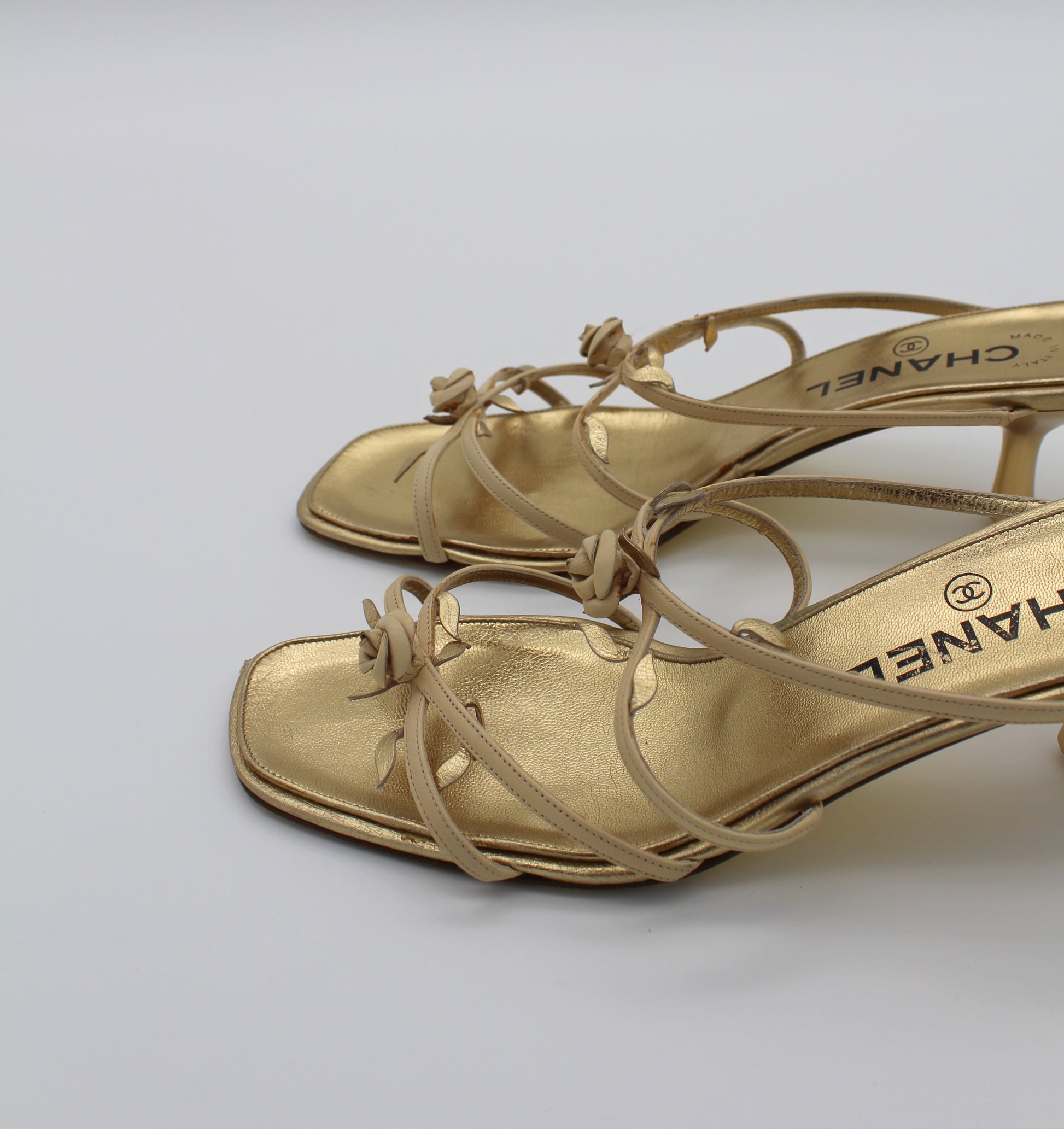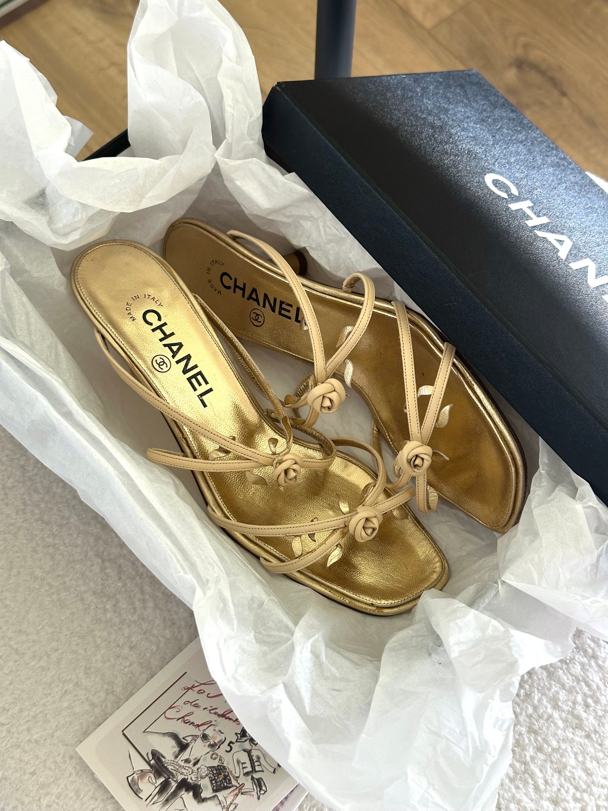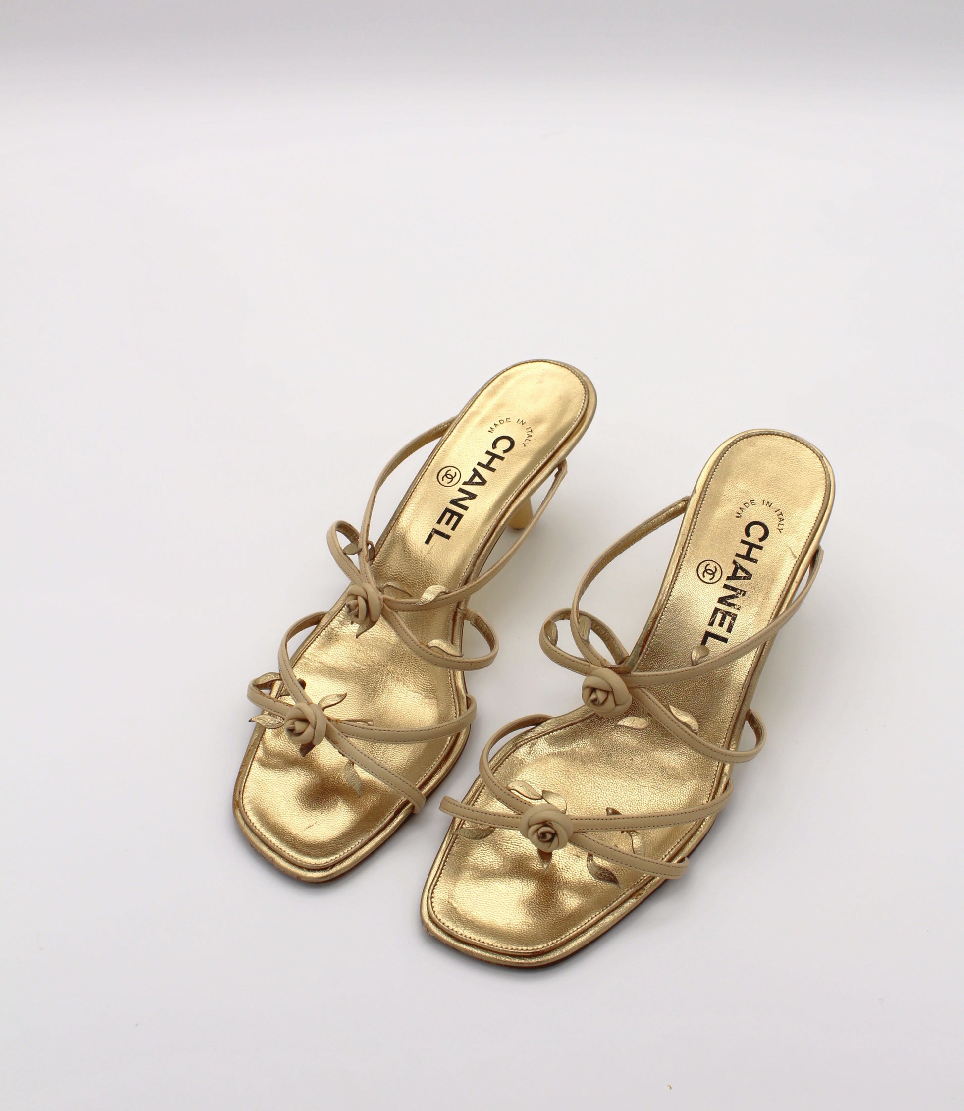 - These extremely rare Chanel rose bud mules in gold are extremely sought out! They feature the most delicate floral appliqué with a gold 2” heel.