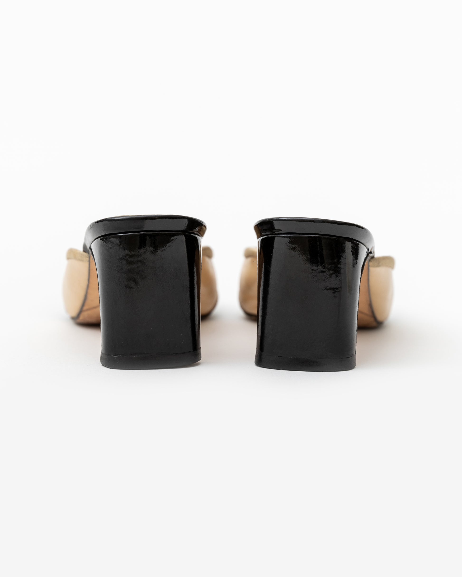 - Tan lambskin leather with patent leather cap toe detail with cc stitching and bow detailing.