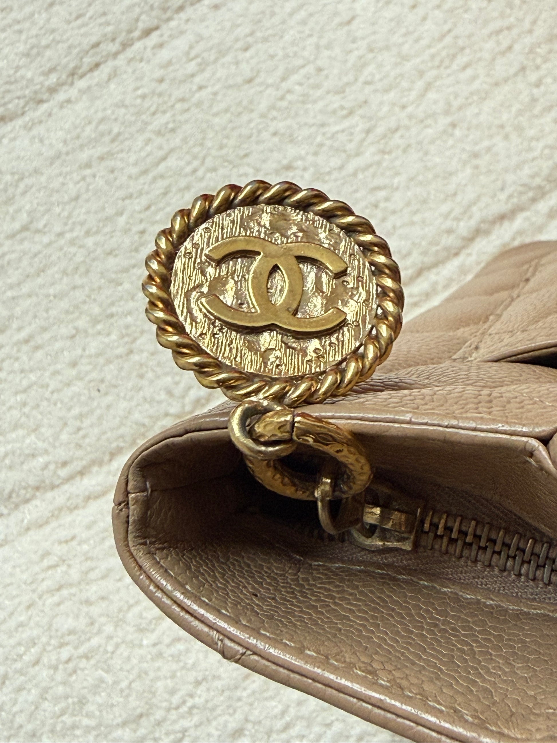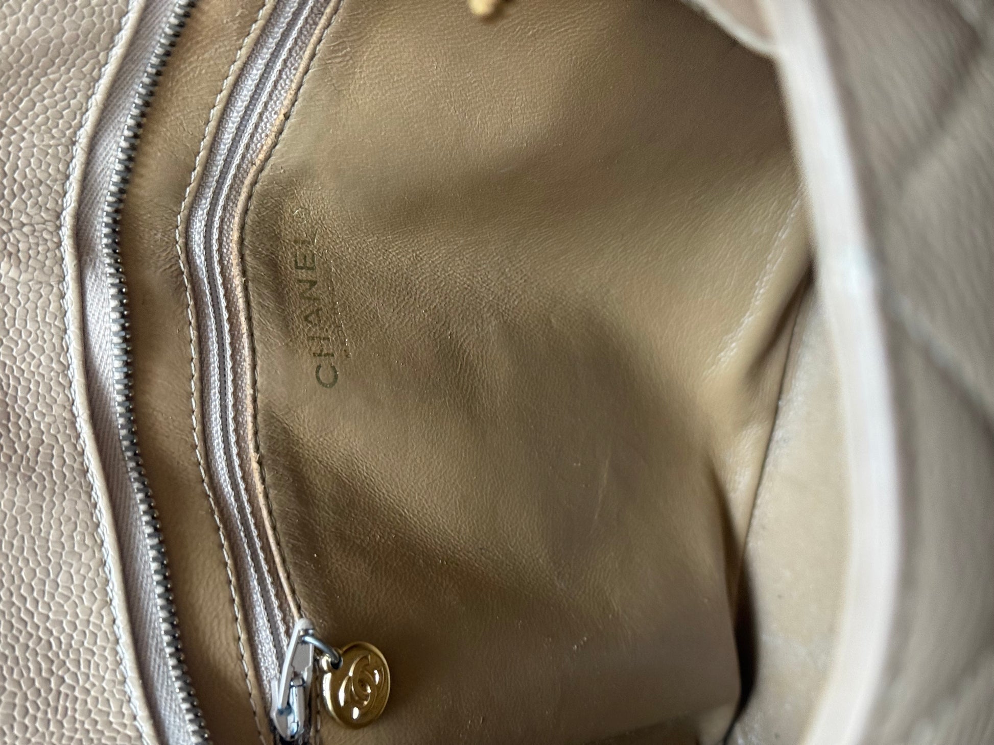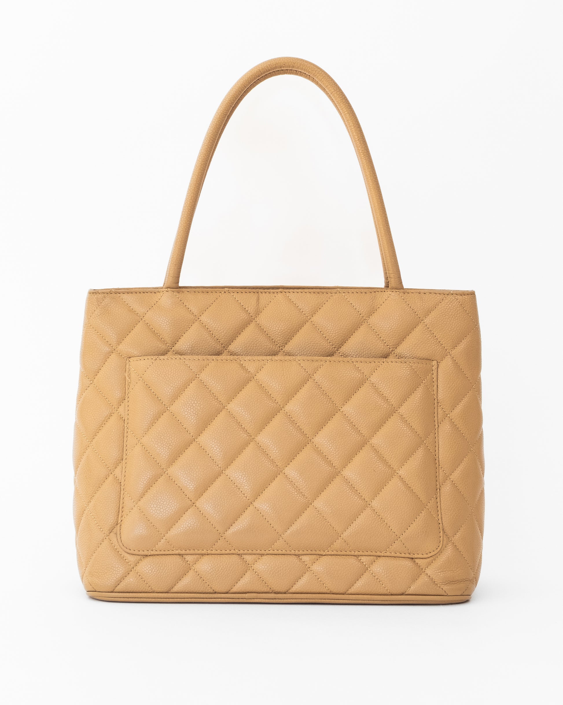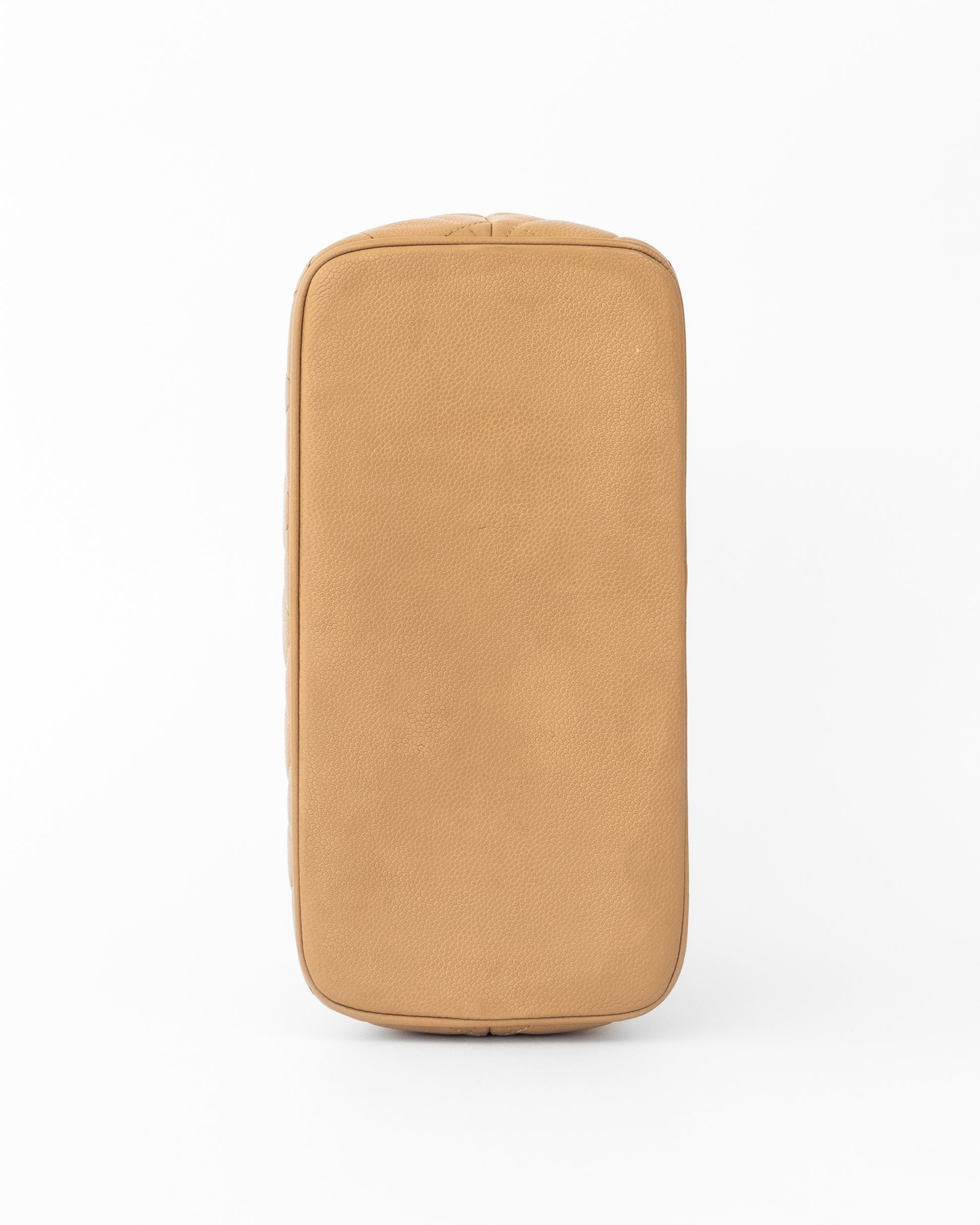 Talk about chic! This tote features diamond-quilted textured tan leather, a rear patch pocket, leather top handles, gold hardware, and a fabulous CC logo stitching on the front.