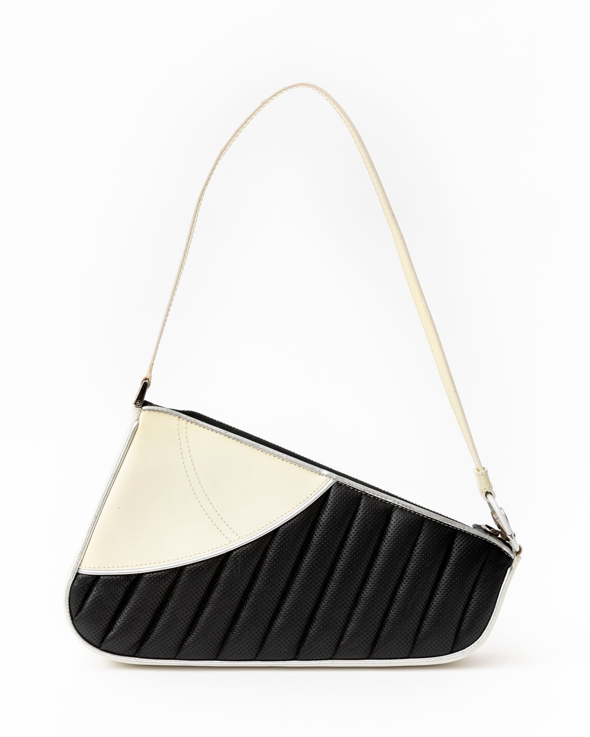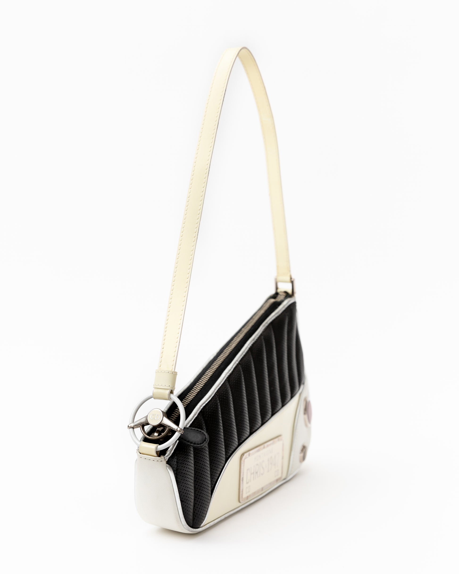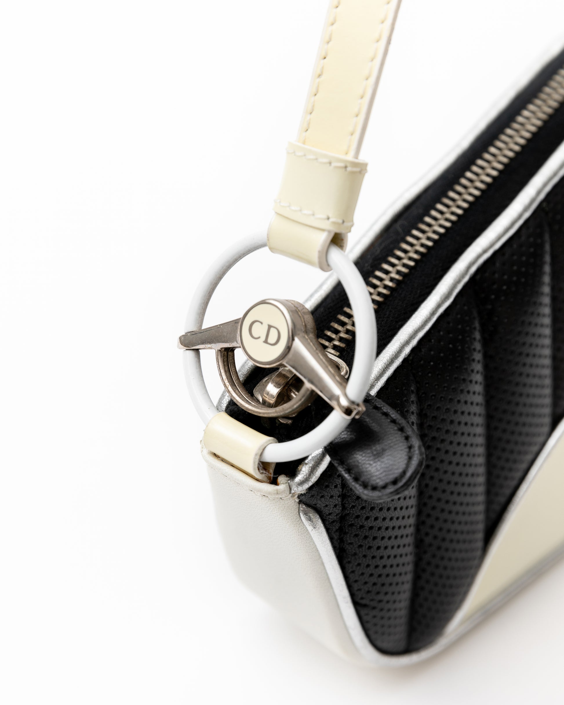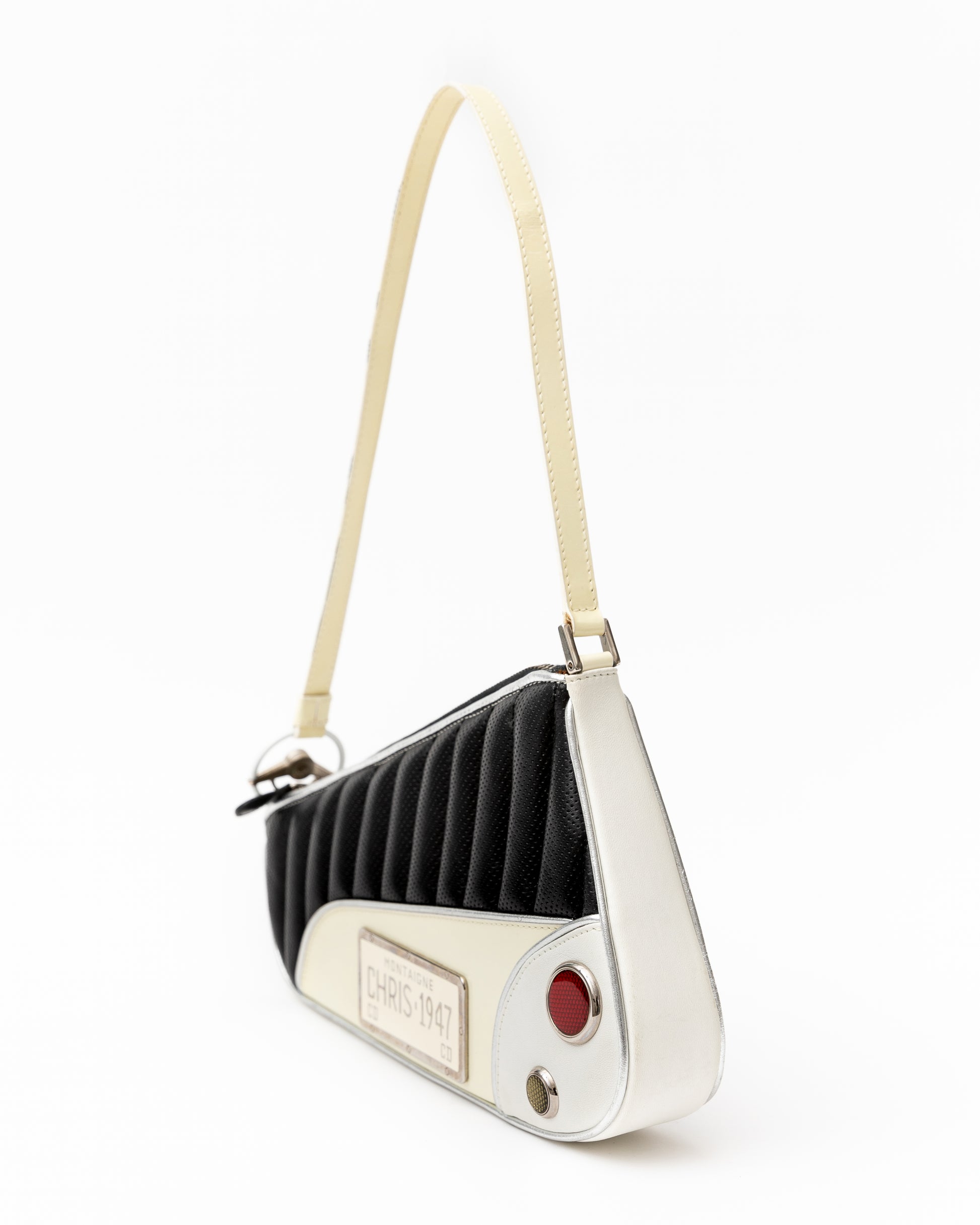 - This saddle bag features black lambskin leather and white patent leather with silver trimming. Has the most unique details including a Dior license plate and Dior steering wheel.