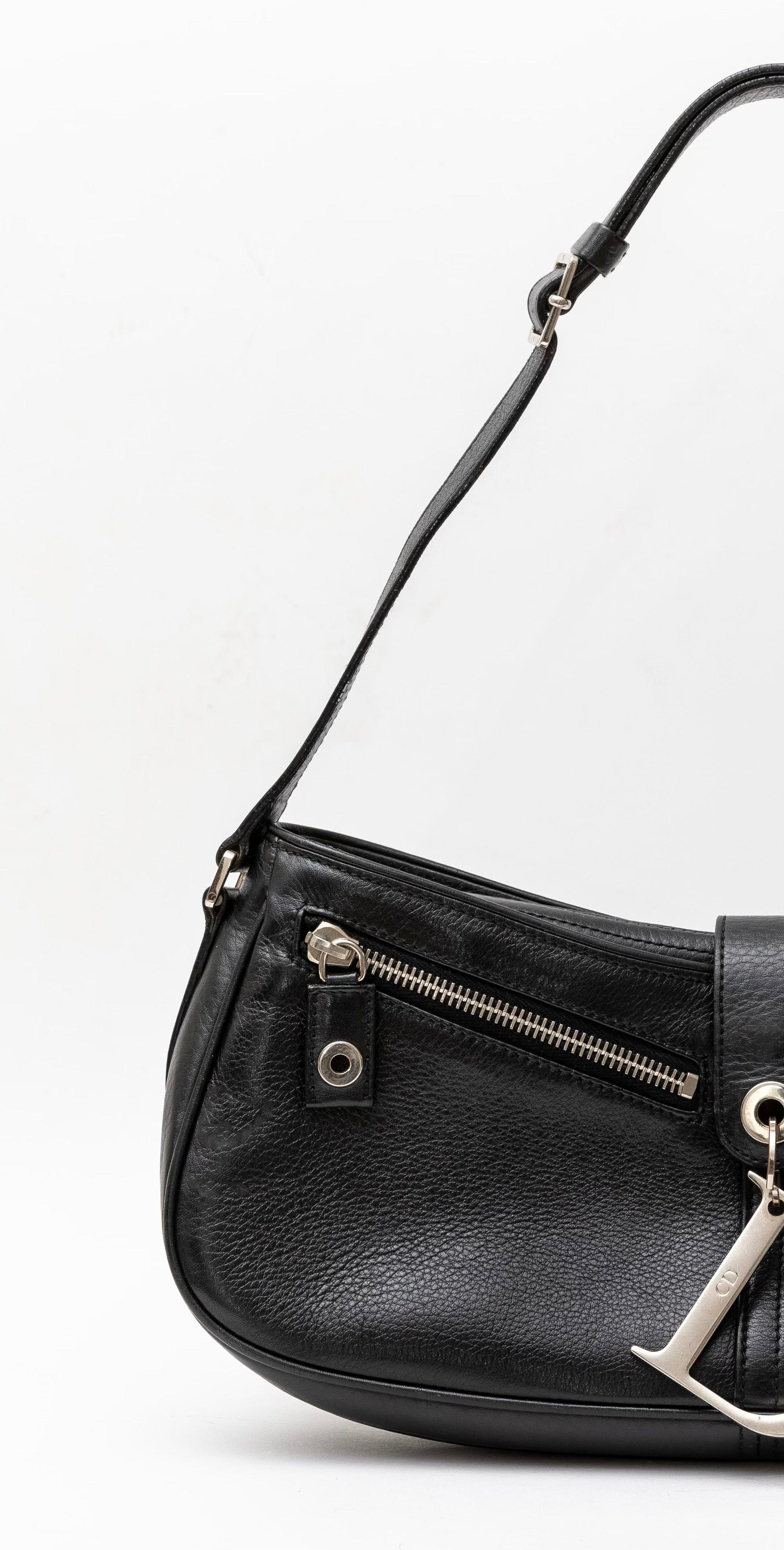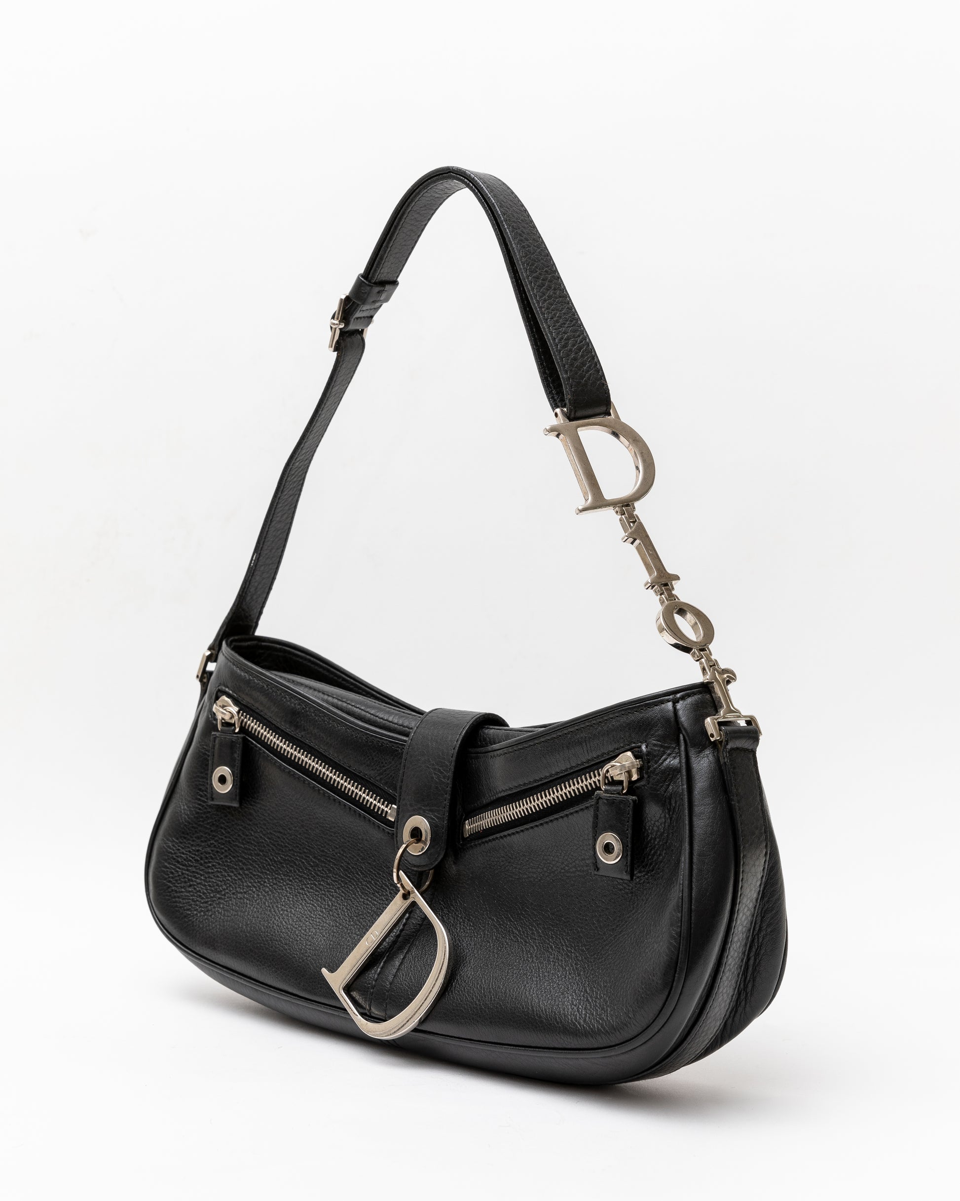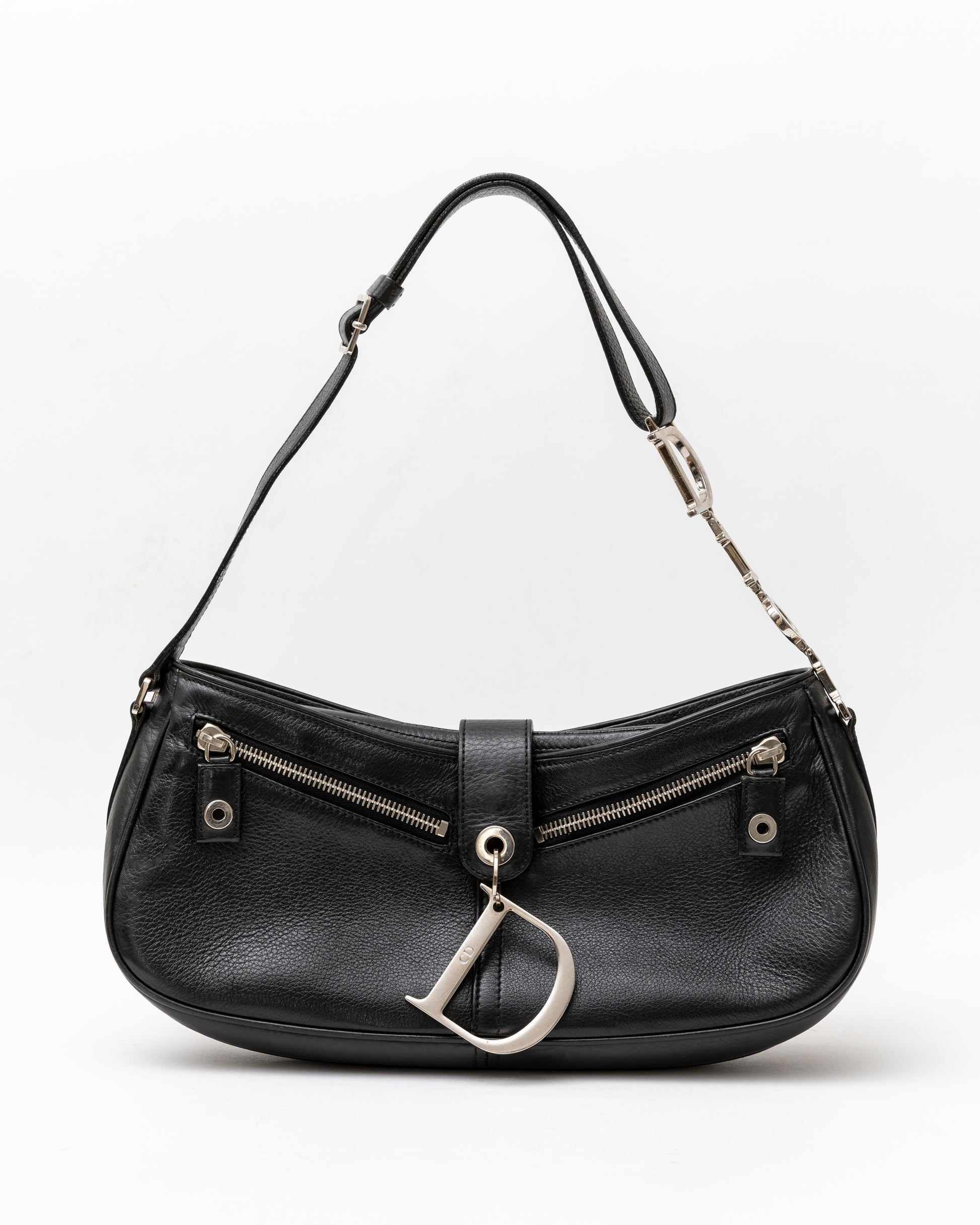 - A vintage designer bag dream- this Dior bag is not only classic enough to match with everything, but it also is extremely unique and bound to turn heads! Crafted in black leather, this Dior by John Galliano bag is extremely rare and not currently available anywhere online! The silver charm strap reads "Dior" and additional "D" zipper charm with engraving. Has an adjustable strap. Nylon interior with pocket is in excellent shape.