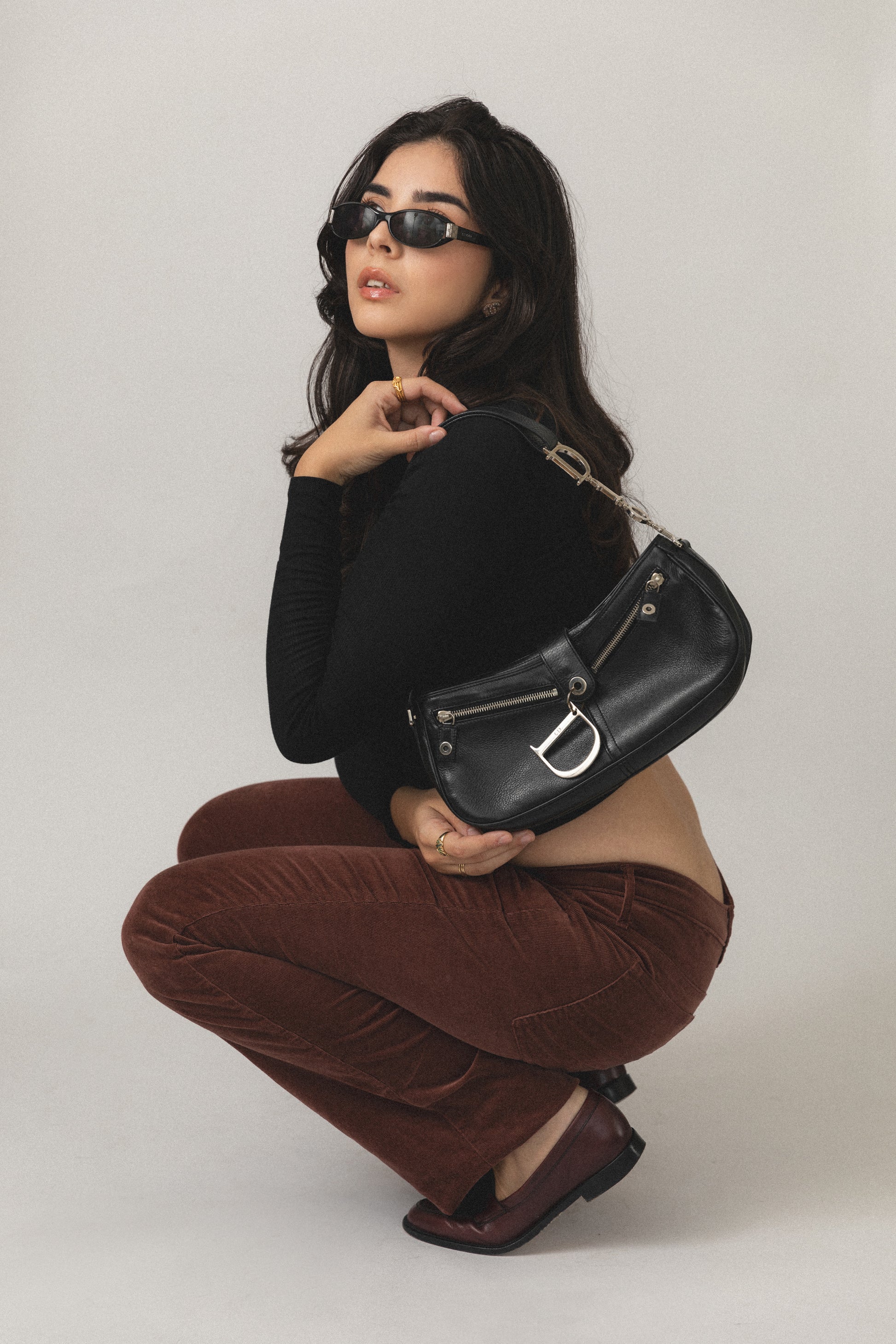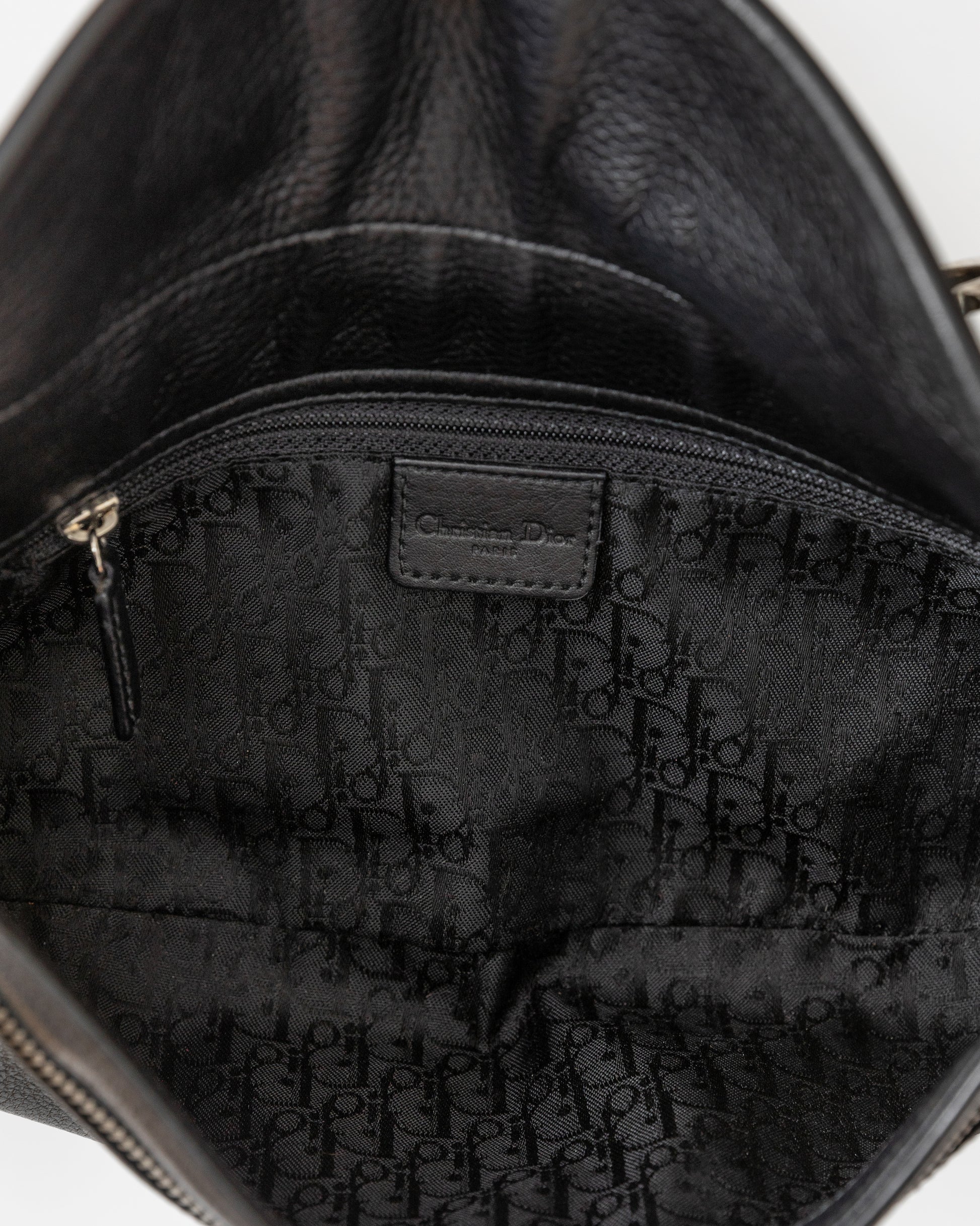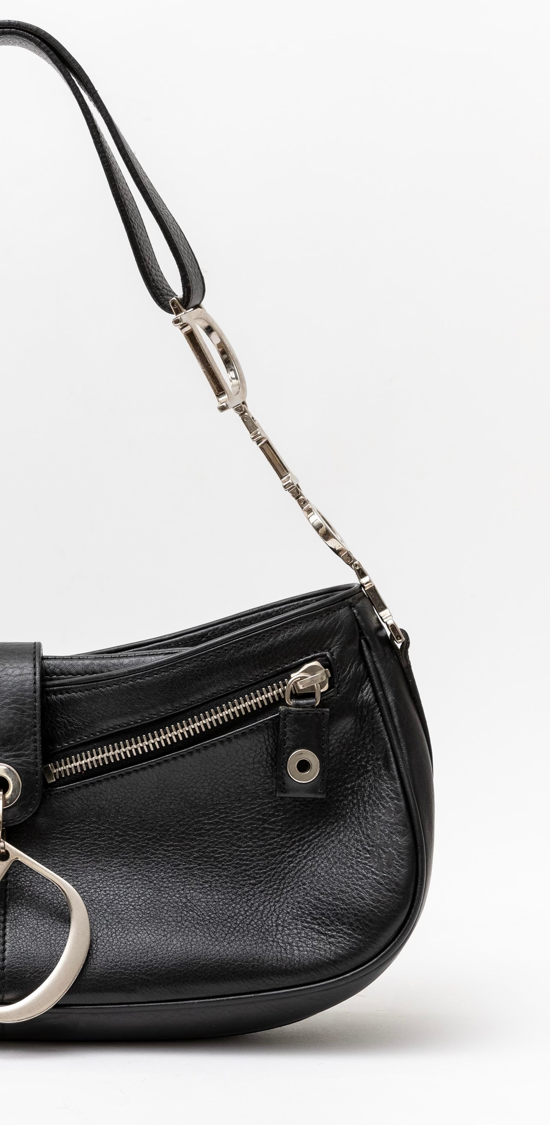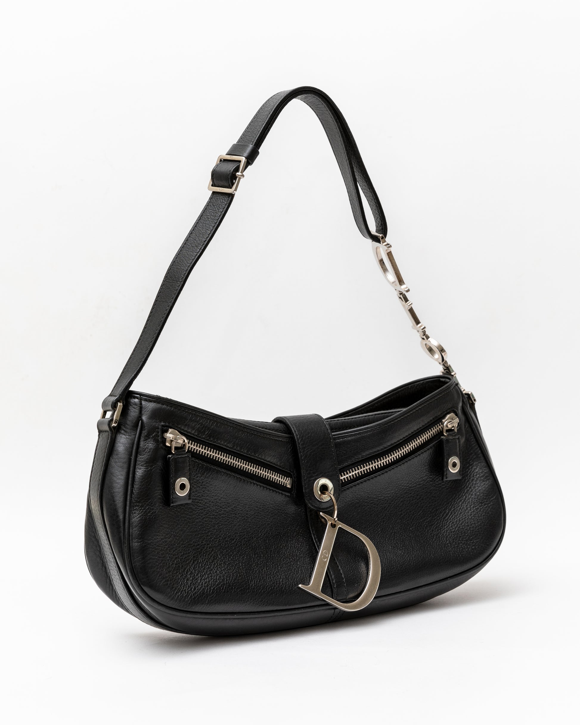 - A vintage designer bag dream- this Dior bag is not only classic enough to match with everything, but it also is extremely unique and bound to turn heads! Crafted in black leather, this Dior by John Galliano bag is extremely rare and not currently available anywhere online! The silver charm strap reads "Dior" and additional "D" zipper charm with engraving. Has an adjustable strap. Nylon interior with pocket is in excellent shape.