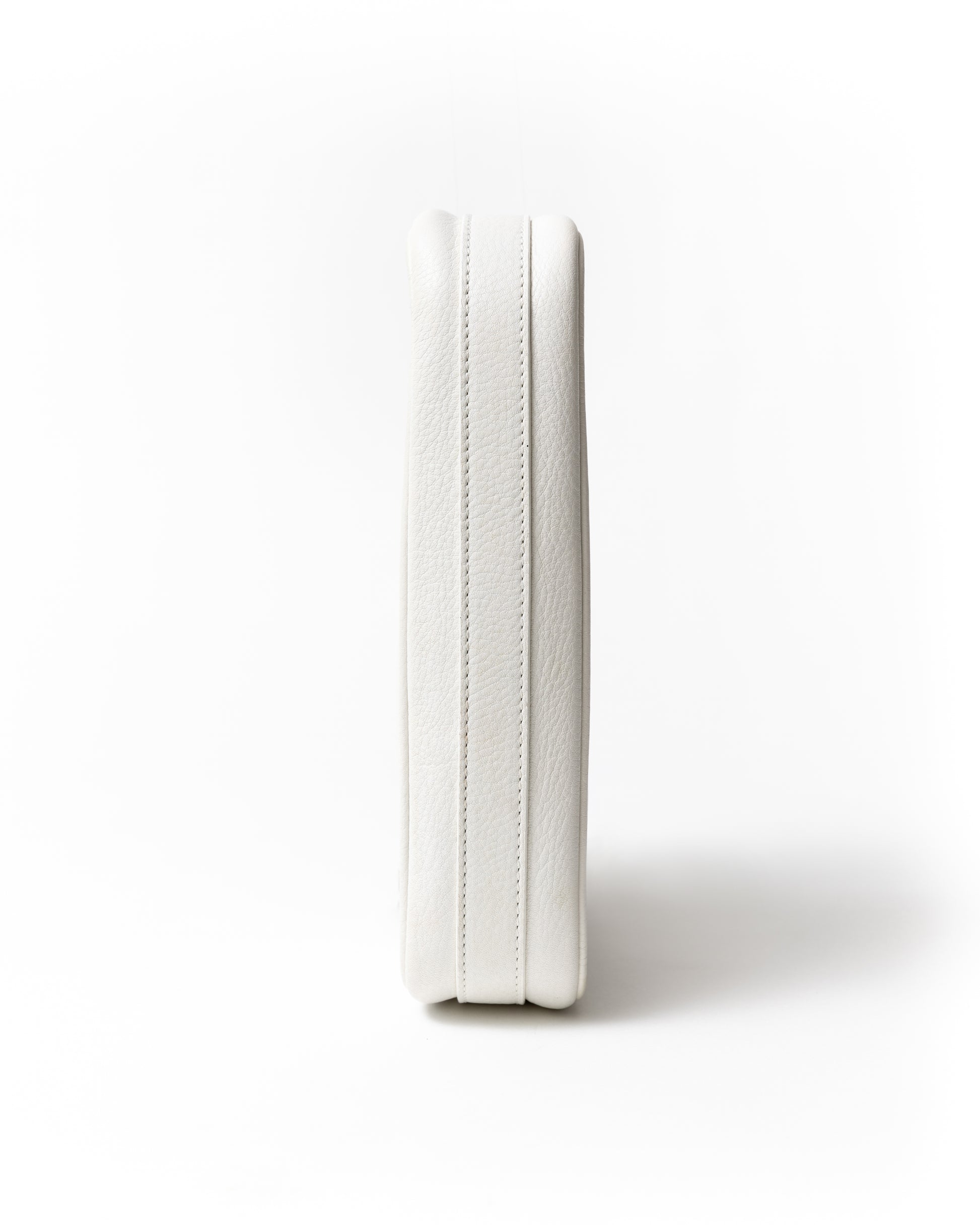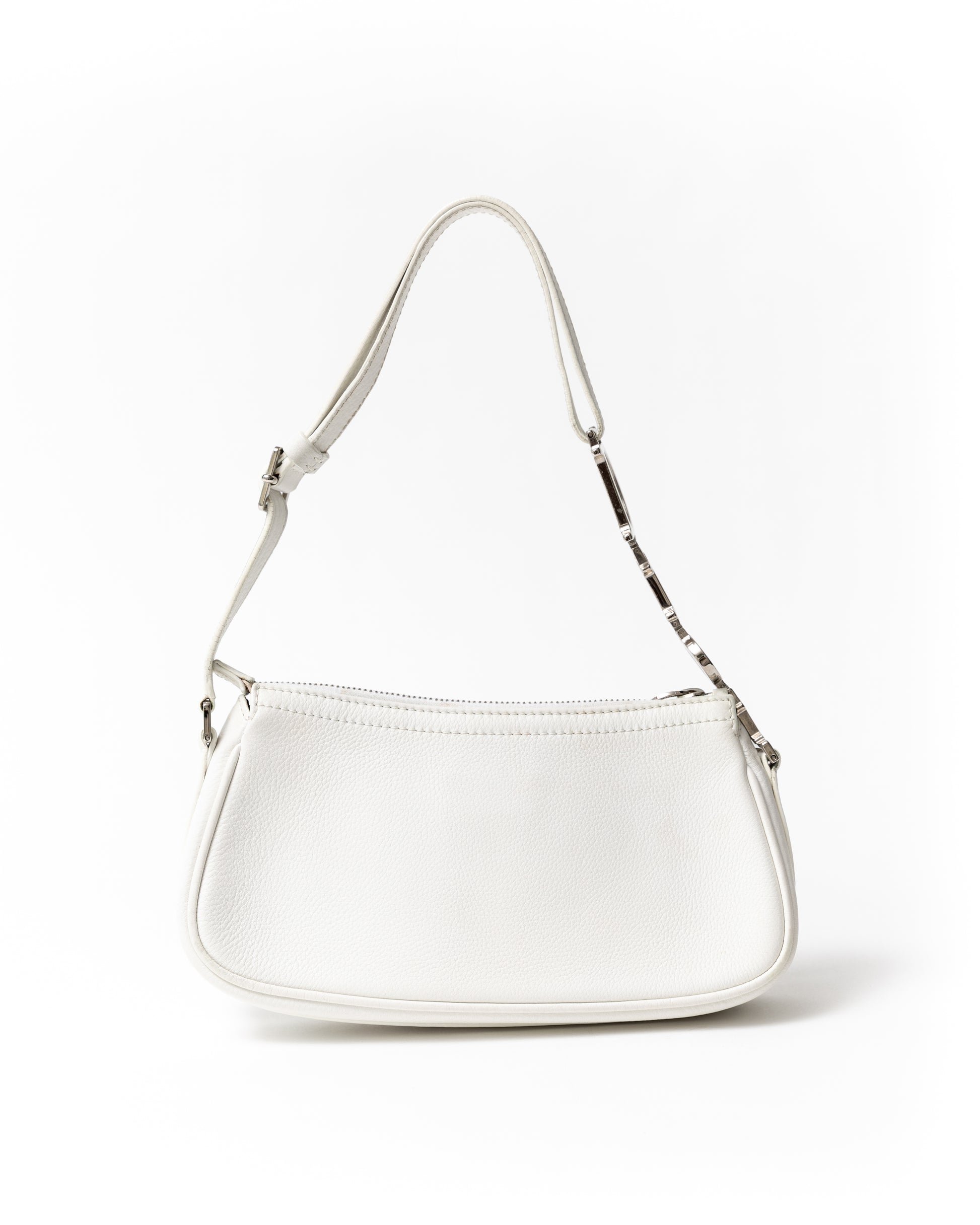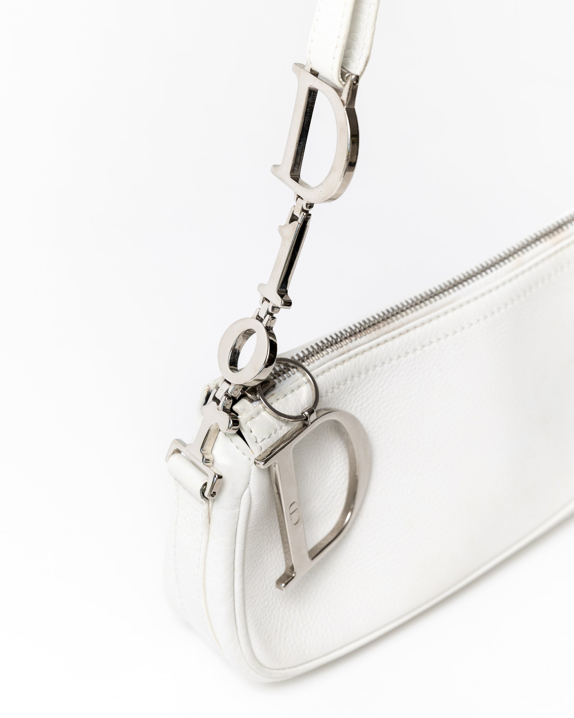 White pebble leather with iconic silver spellout strap and D charm zipper pull, adjustable shoulder strap, and spacious canvas interior with pocket.