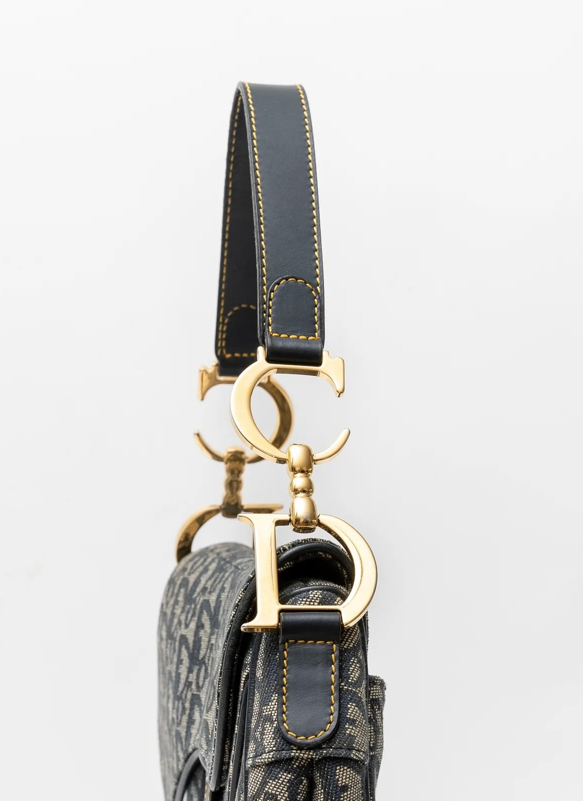 - Classic navy Dior monogram canvas with leather accents and rare gold hardware.
