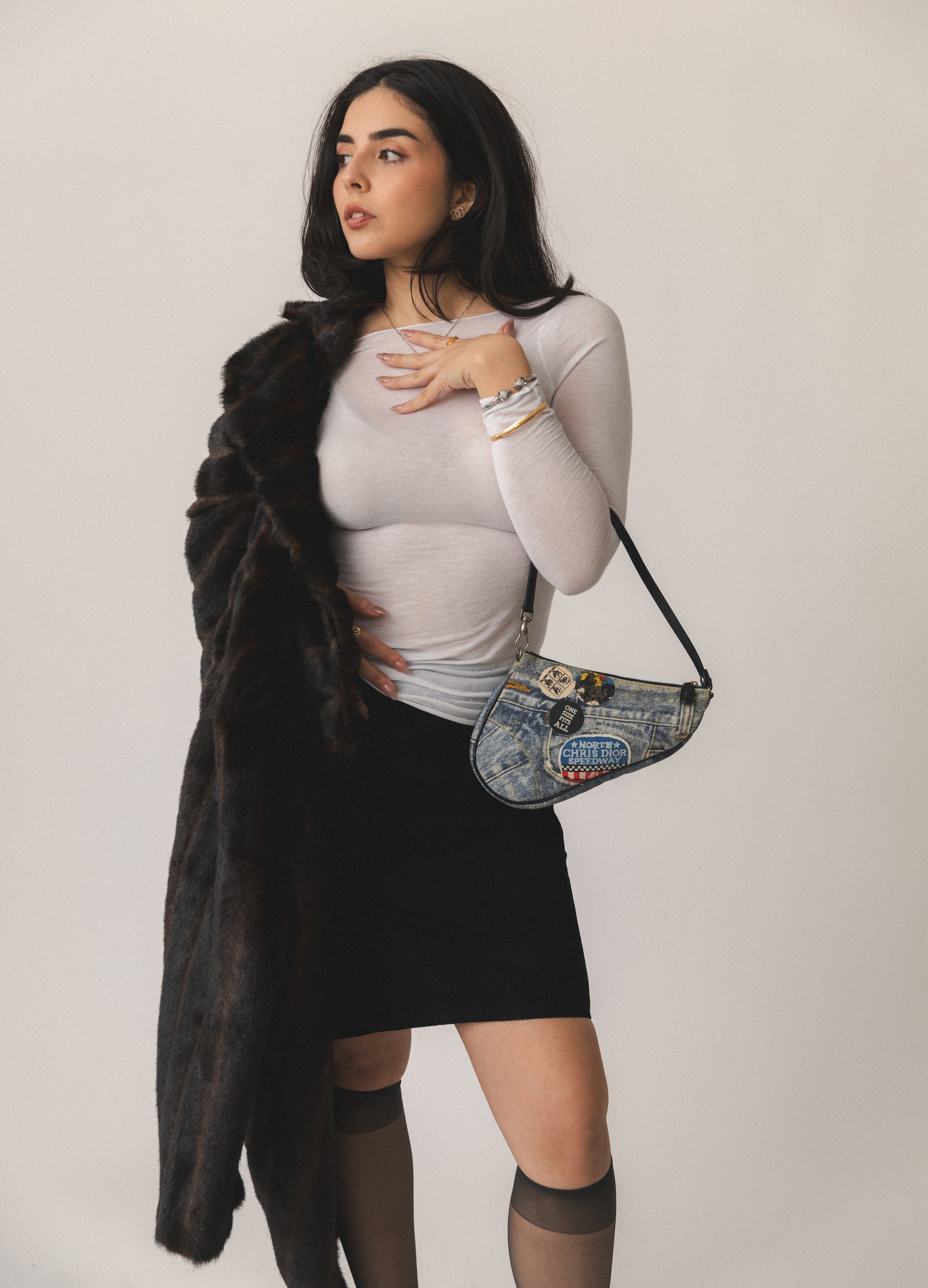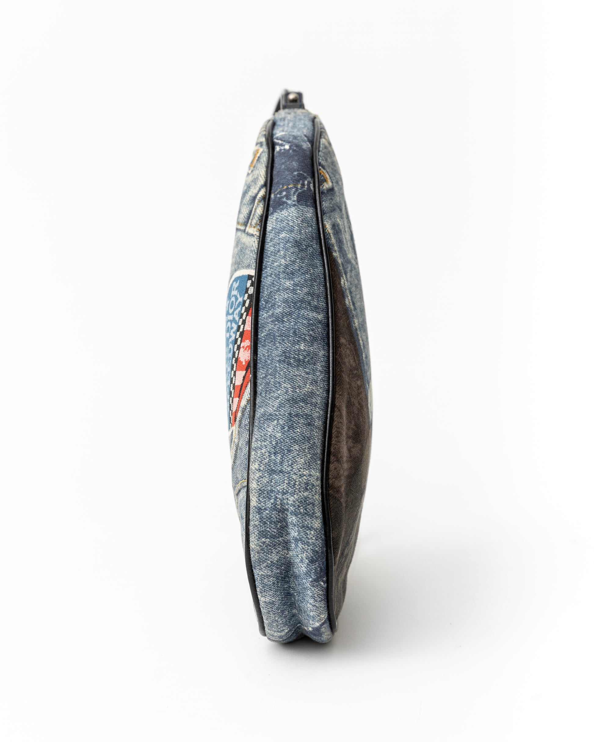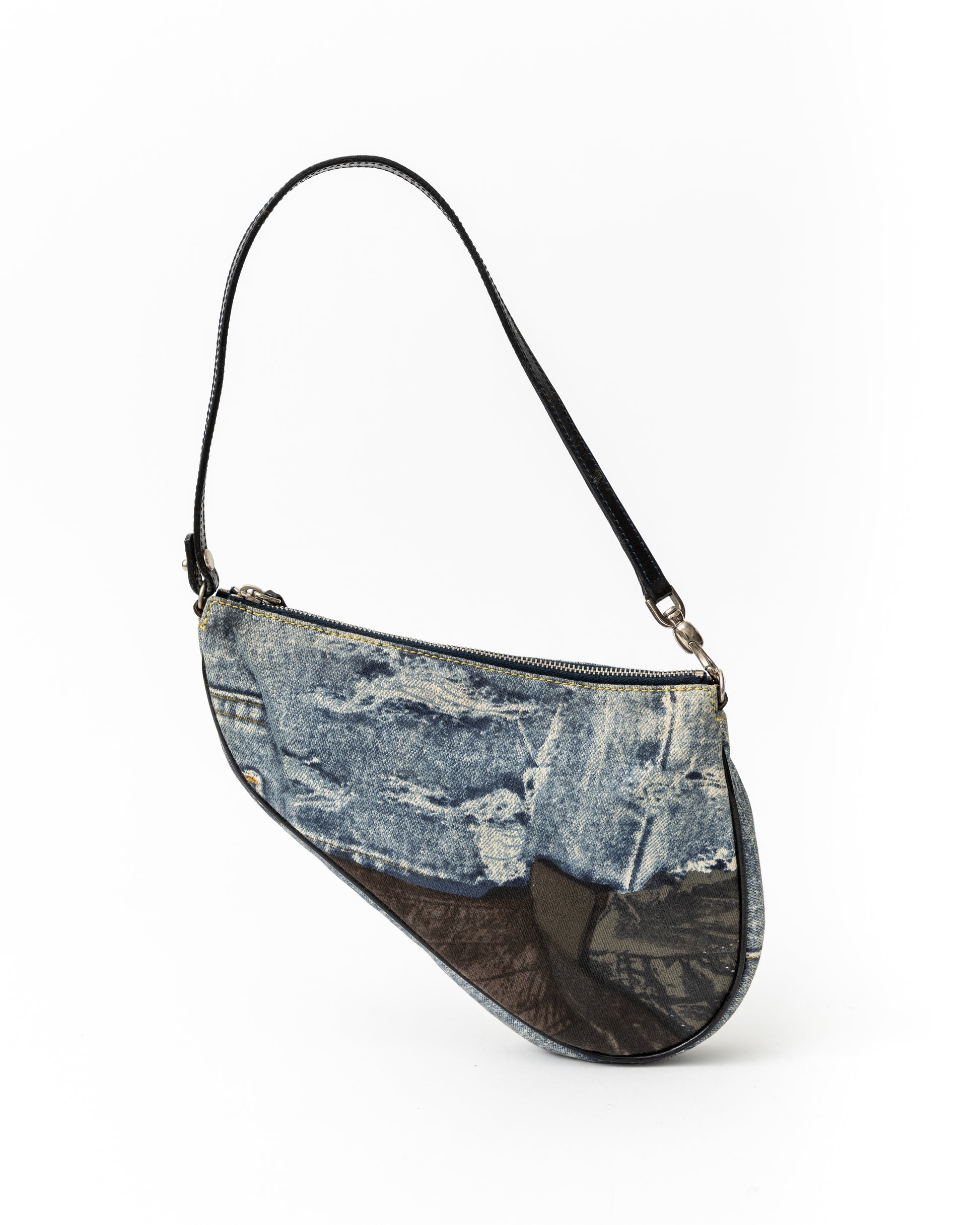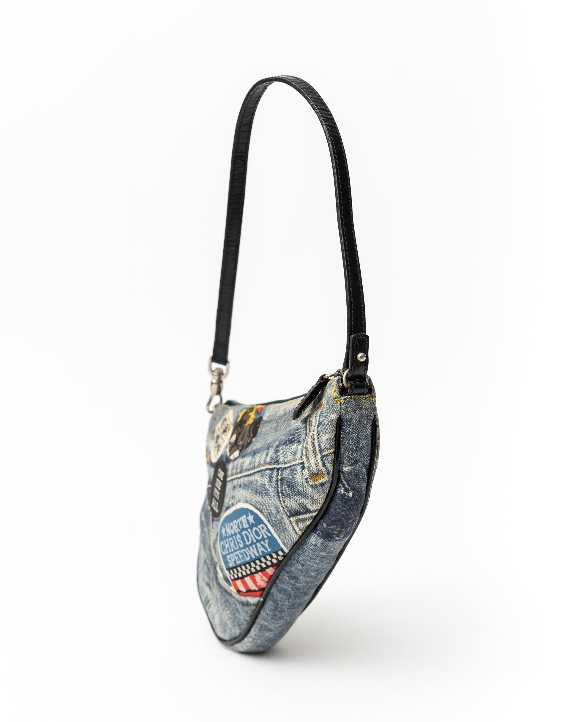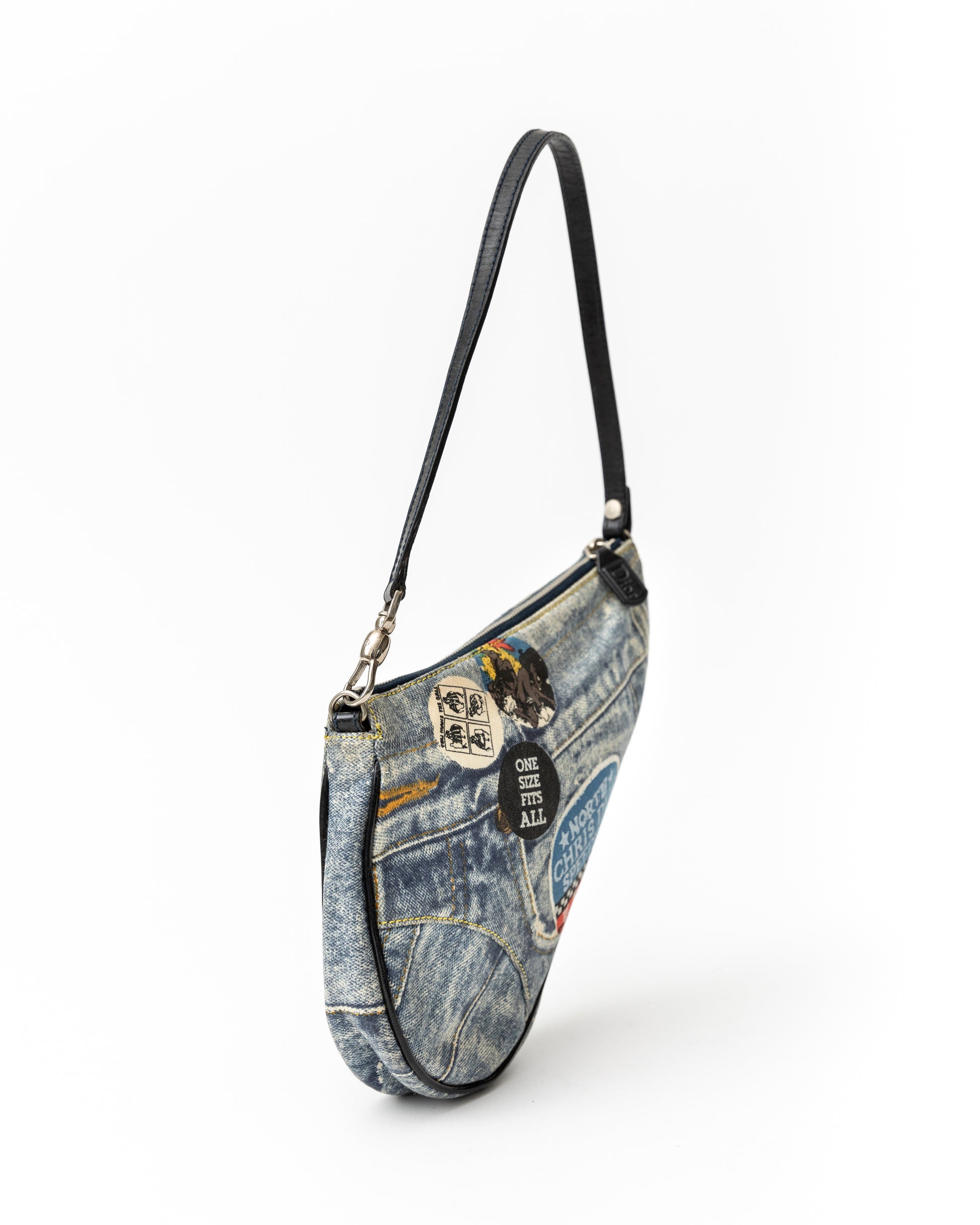 - This very rare saddle bag from the iconic Galliano era of Dior features unique sticker-esque Christian Dior accents with blue and black denim patchwork and black patent leather trimming.