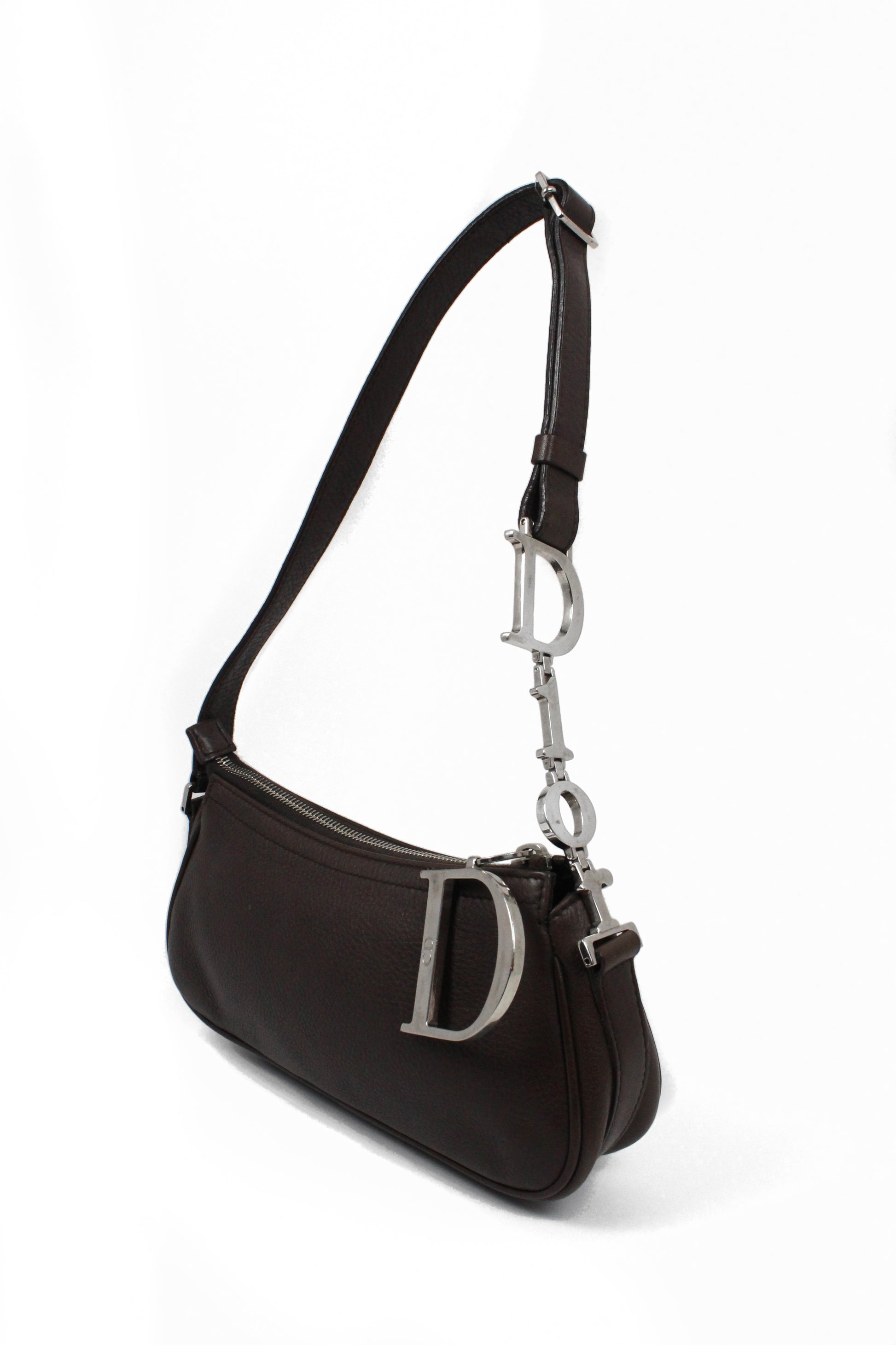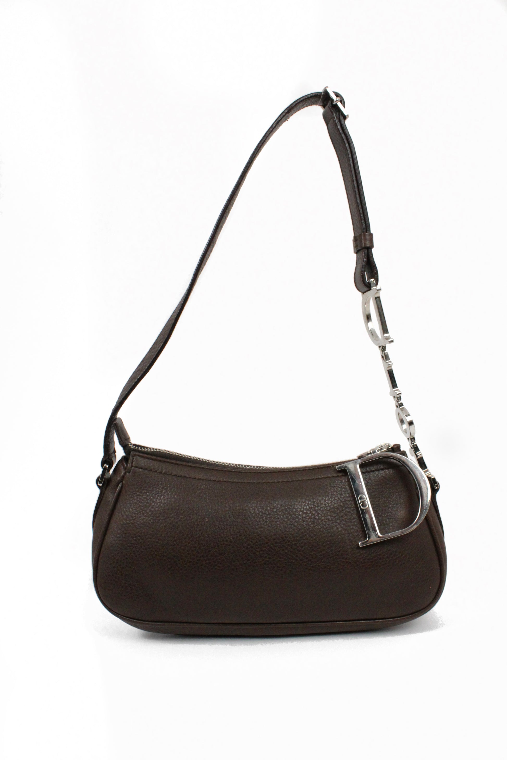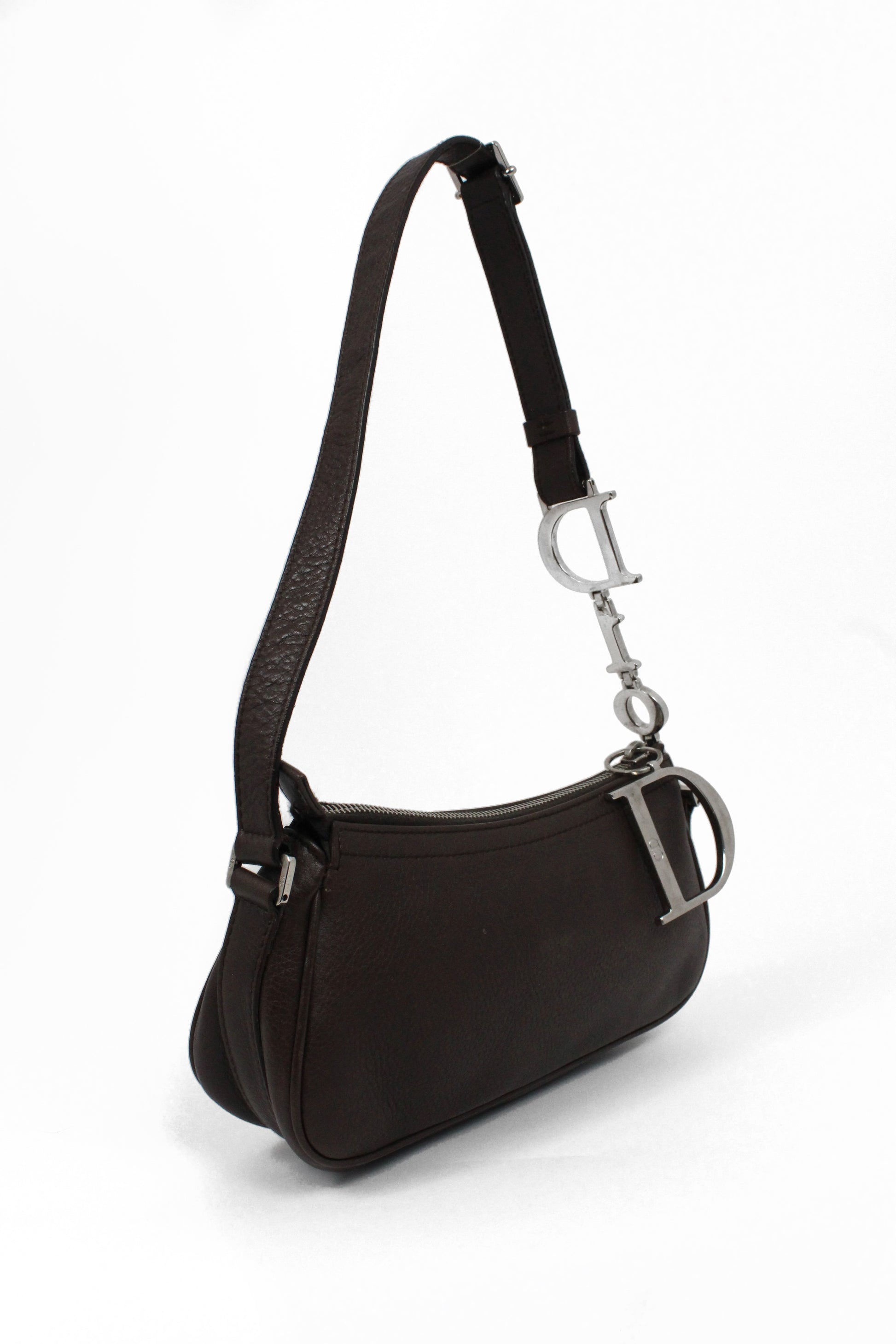 - Crafted in brown pebbled leather, this Dior by John Galliano bag is extremely rare and not currently available anywhere online in this color-way!! The silver charm strap reads "Dior" and additional "D" zipper charm with engraving. Has an adjustable strap. Nylon interior with pocket is in excellent shape.