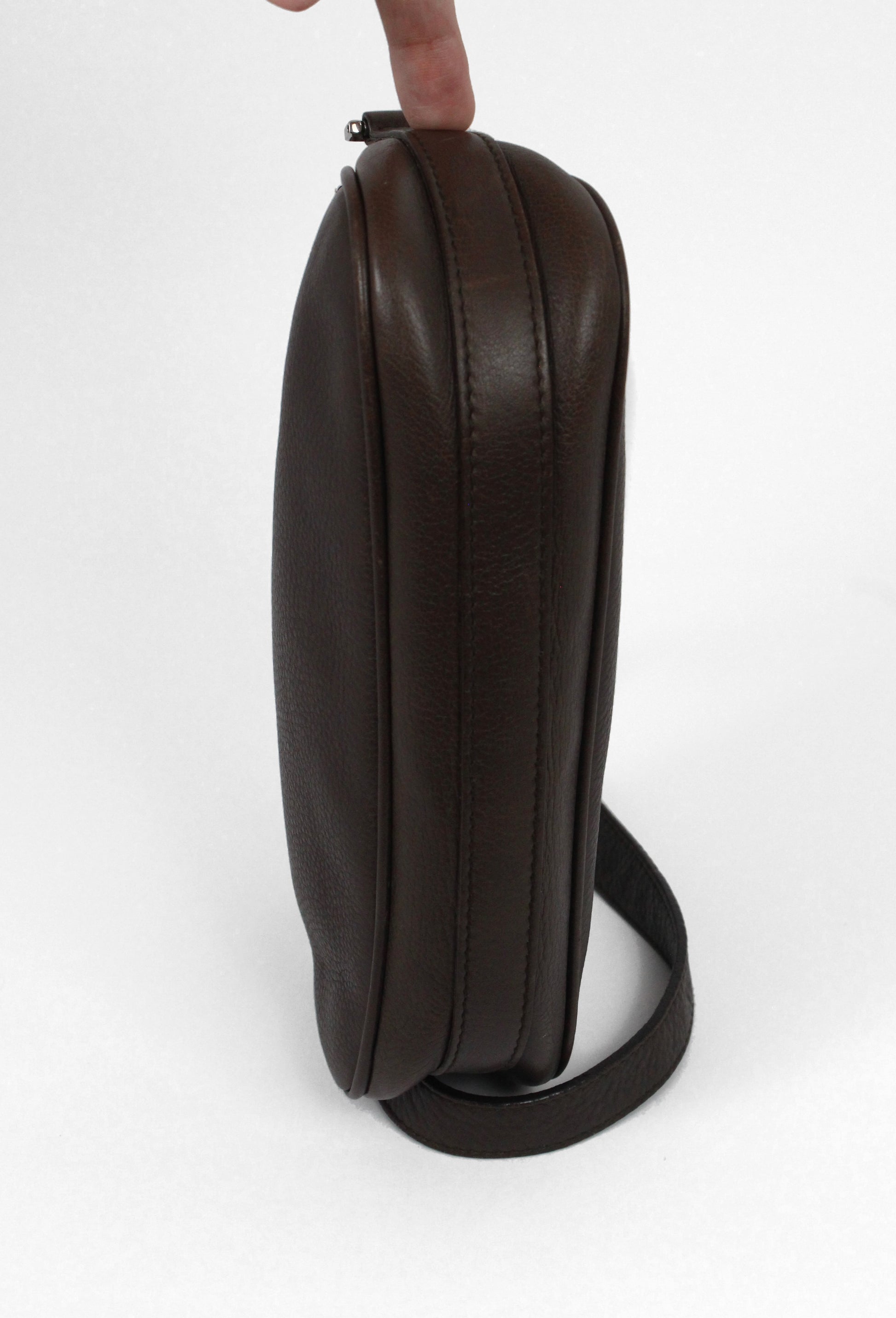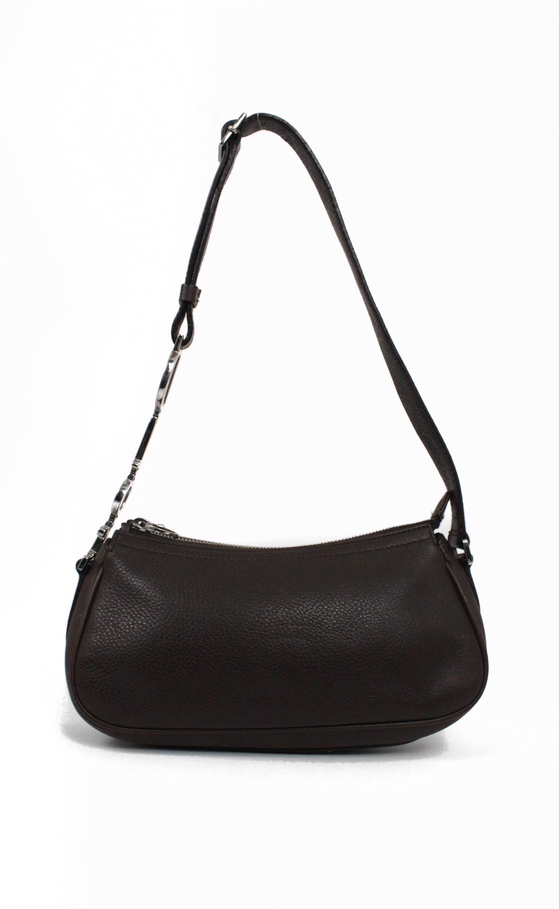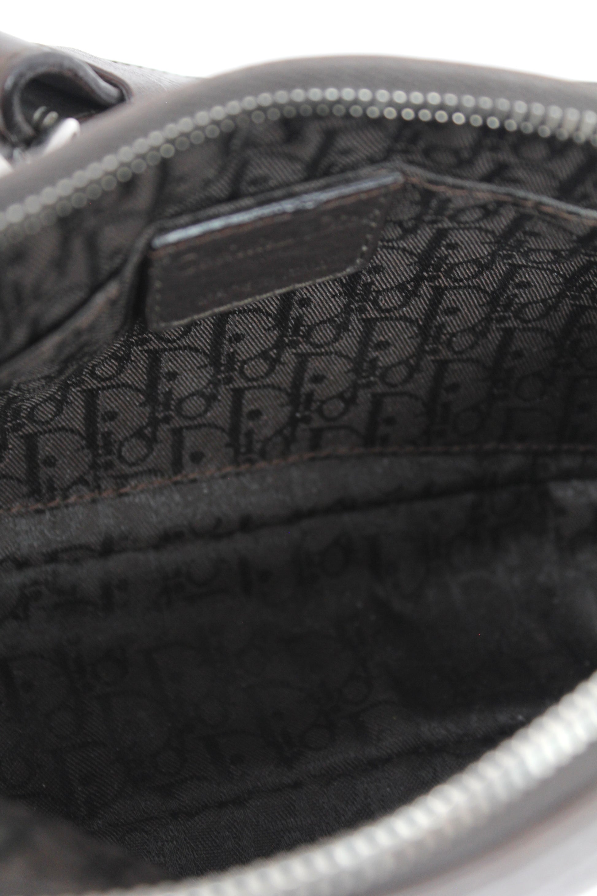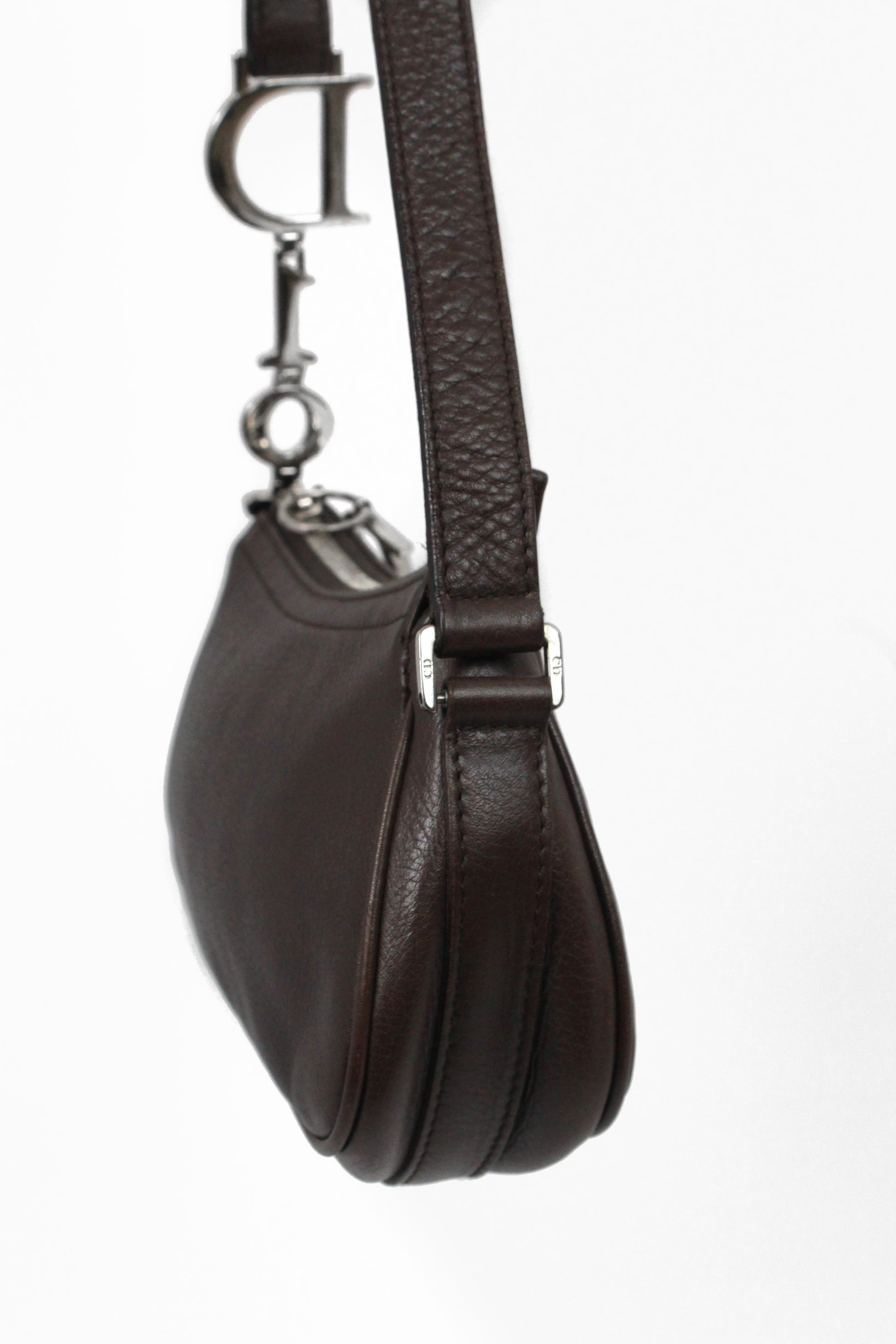 - Crafted in brown pebbled leather, this Dior by John Galliano bag is extremely rare and not currently available anywhere online in this color-way!! The silver charm strap reads "Dior" and additional "D" zipper charm with engraving. Has an adjustable strap. Nylon interior with pocket is in excellent shape.