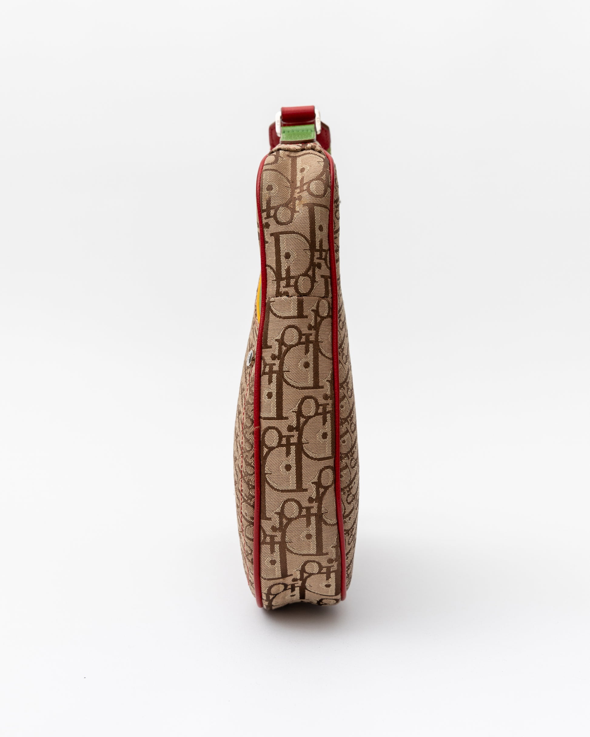 - Dior monogram beige canvas with colorful leather accents and silver "CD" charm hardware.