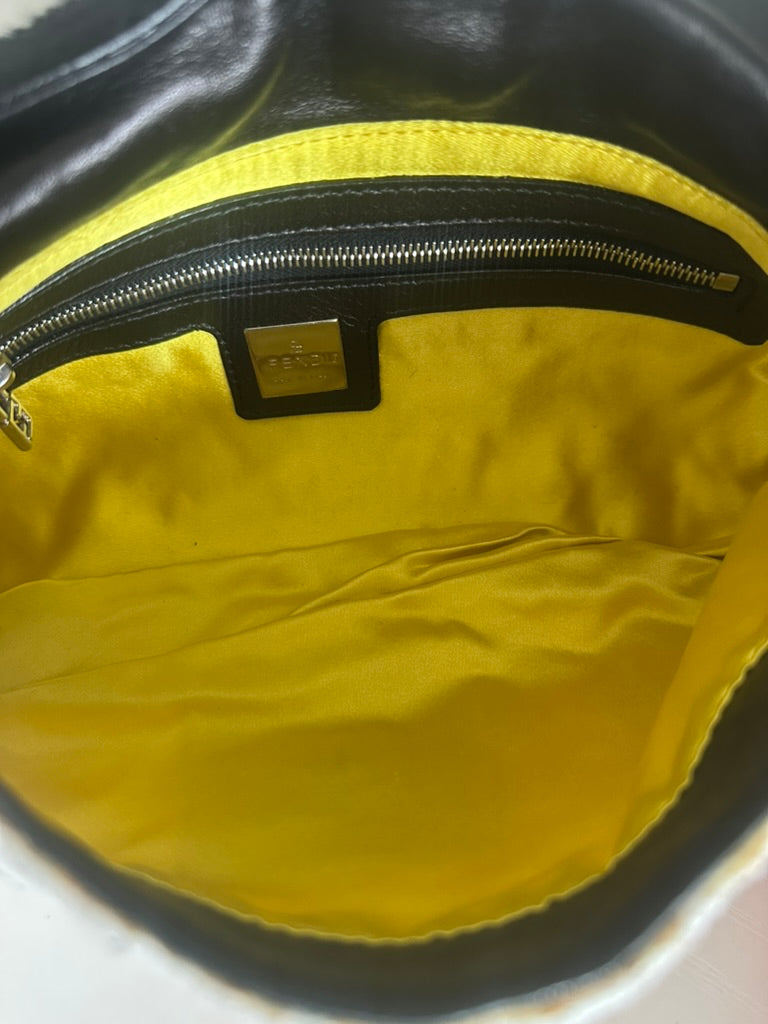 - Yellow silk and black leather interior is in excellent shape. This spacious interior is the perfect size for throwing in your phone, lippie, & wallet, for a night out.