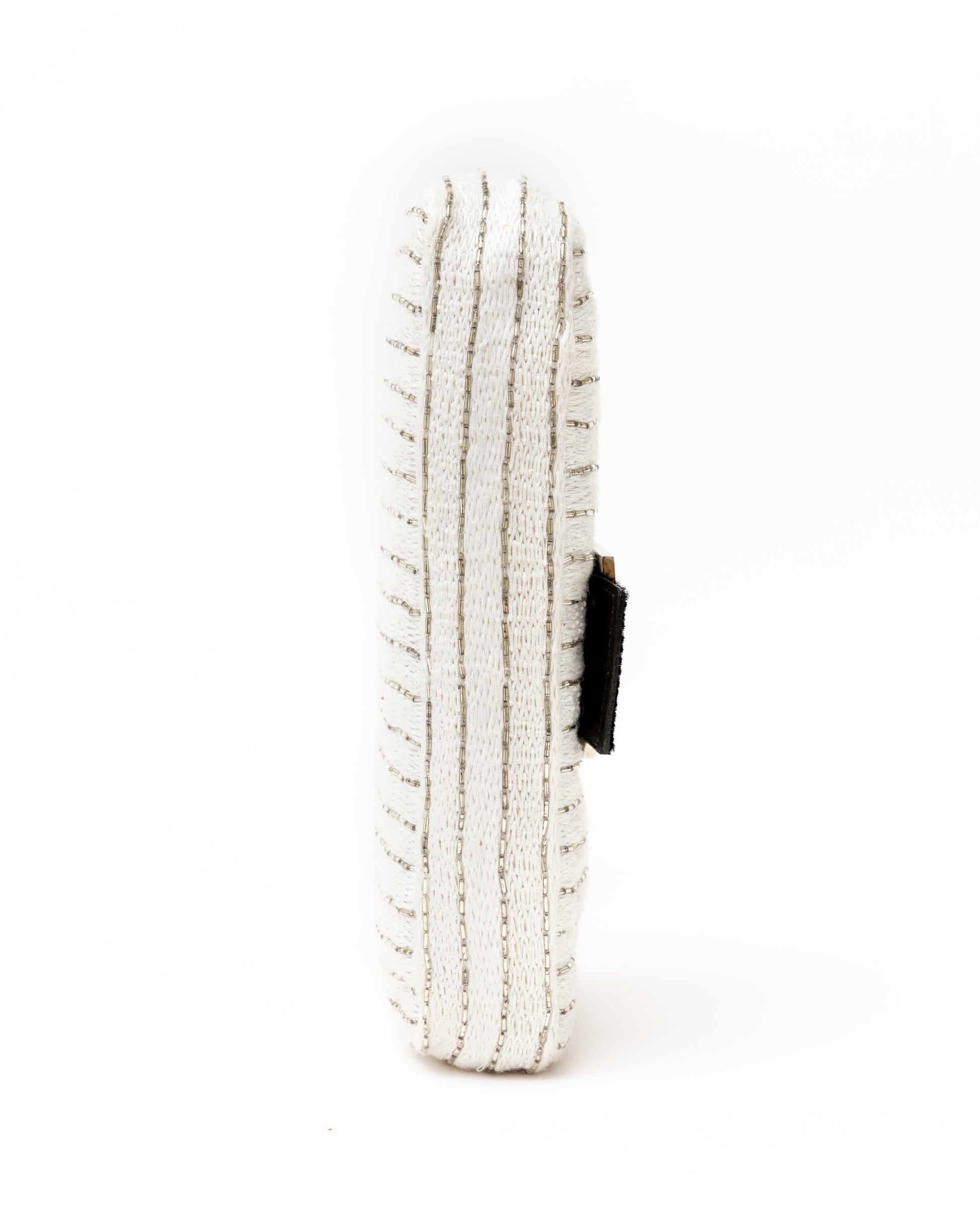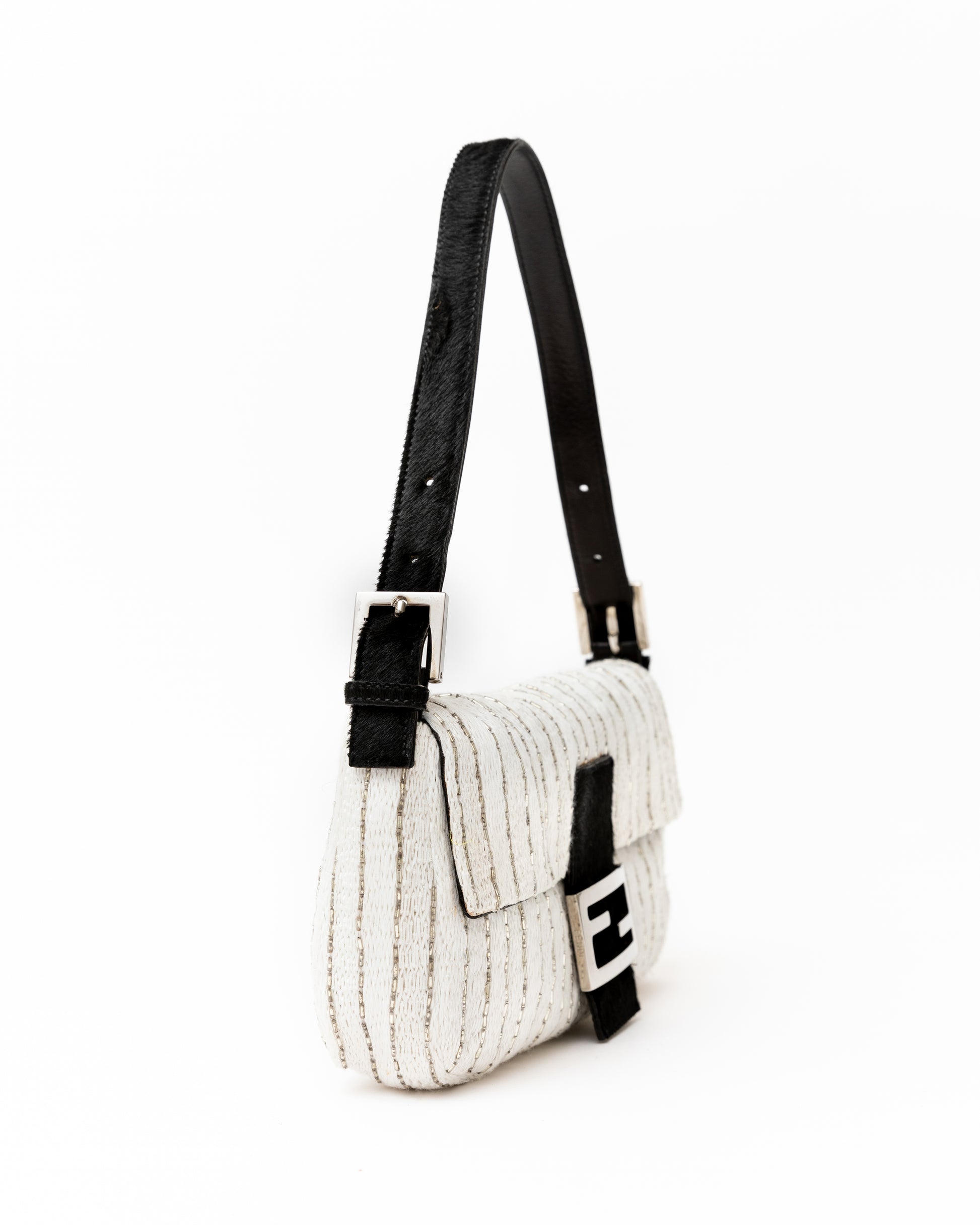 - A Carrie Bradshaw approved staple! This unique Fendi features a cream cloth intertwined with adorable beading detailing and a black fur/leather adjustable strap.