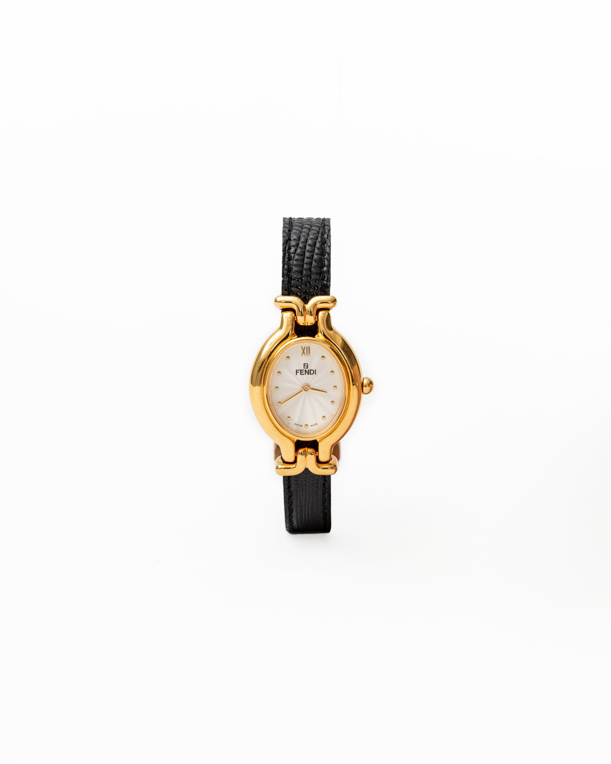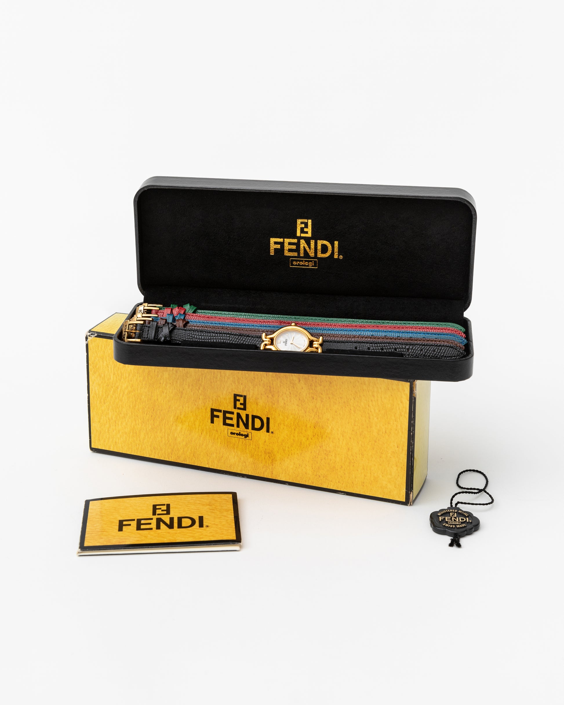 - Rare 90s Fendi gold watch that is fully customizable - the original leather strap can be removed and changed for another of your choosing (this set comes with 5 straps), making this a super versatile piece.