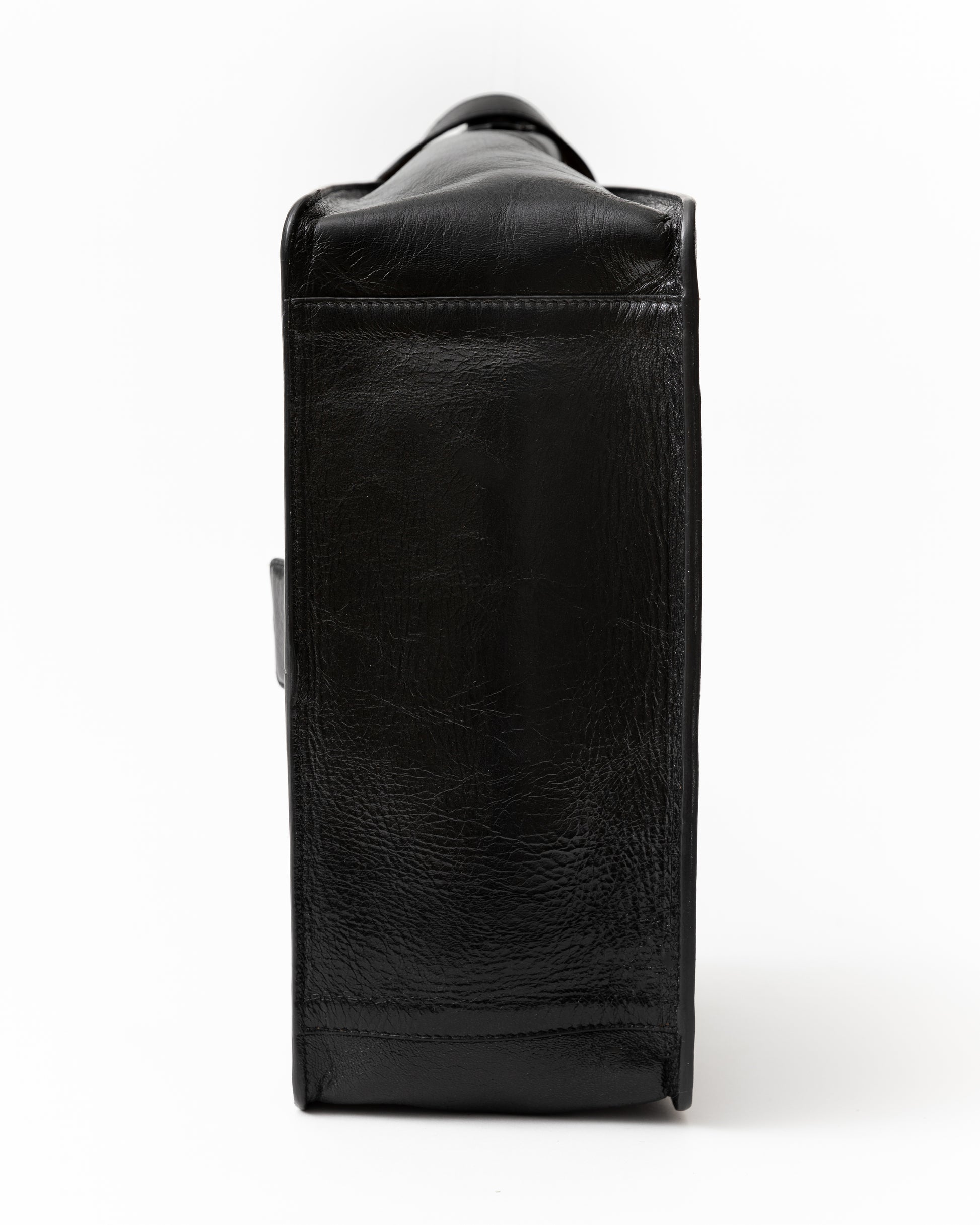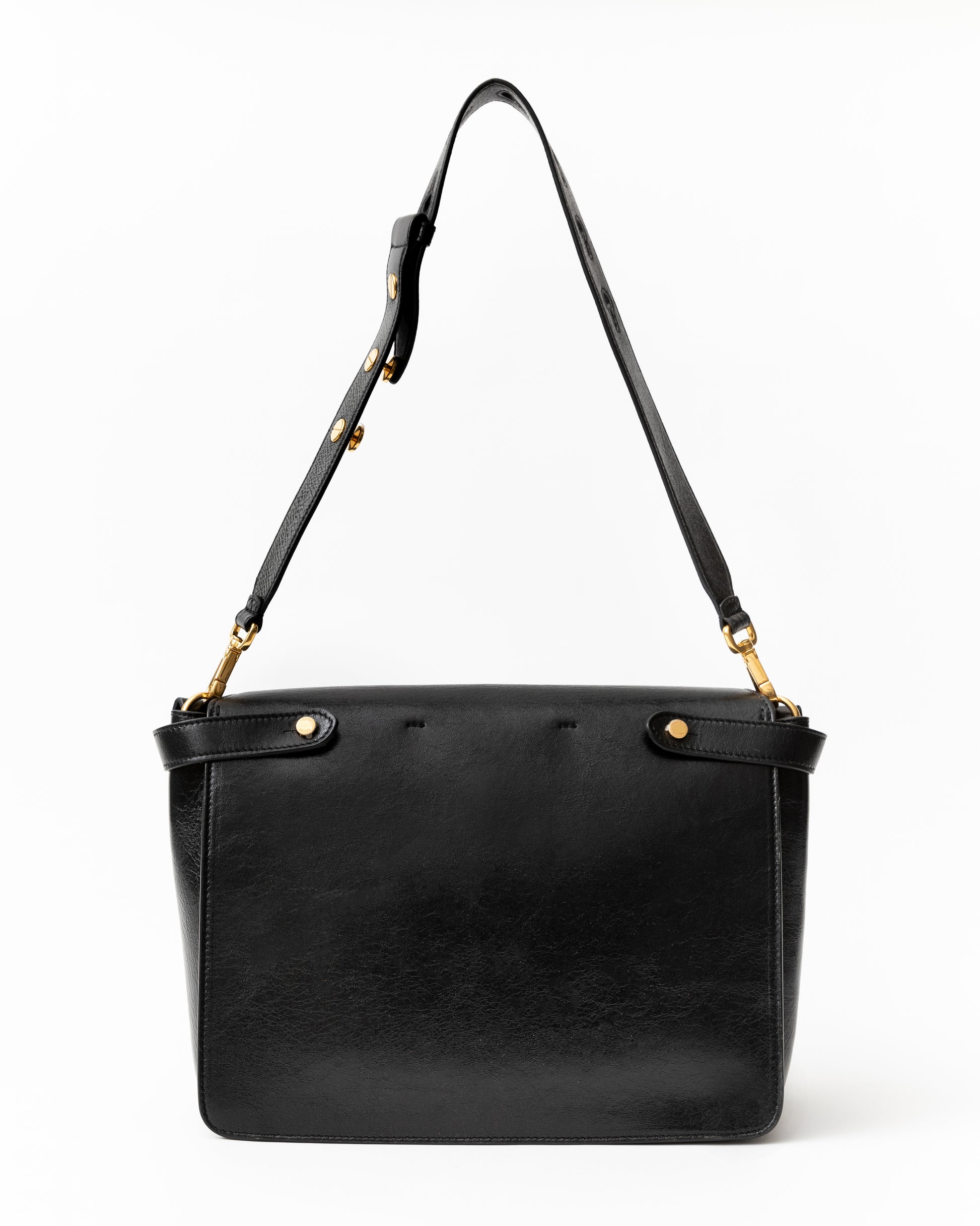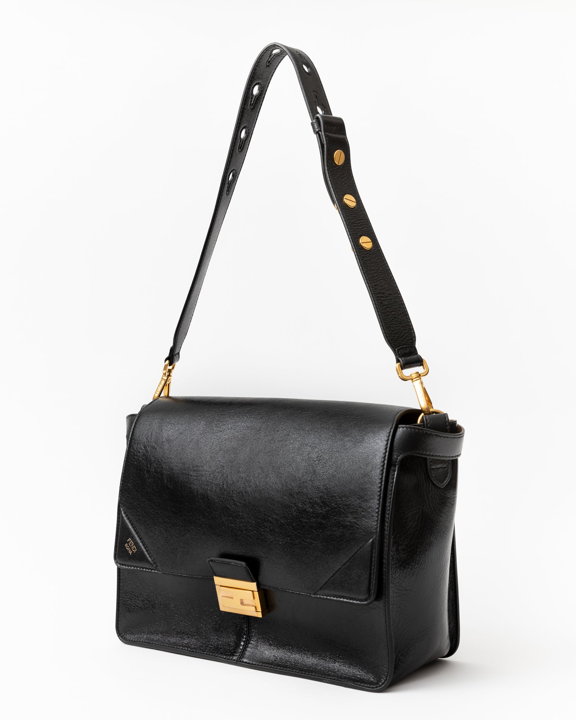 - This stunning bag features beautiful black lambskin leather, gold hardware, and an adjustable shoulder strap that can be made crossbody.