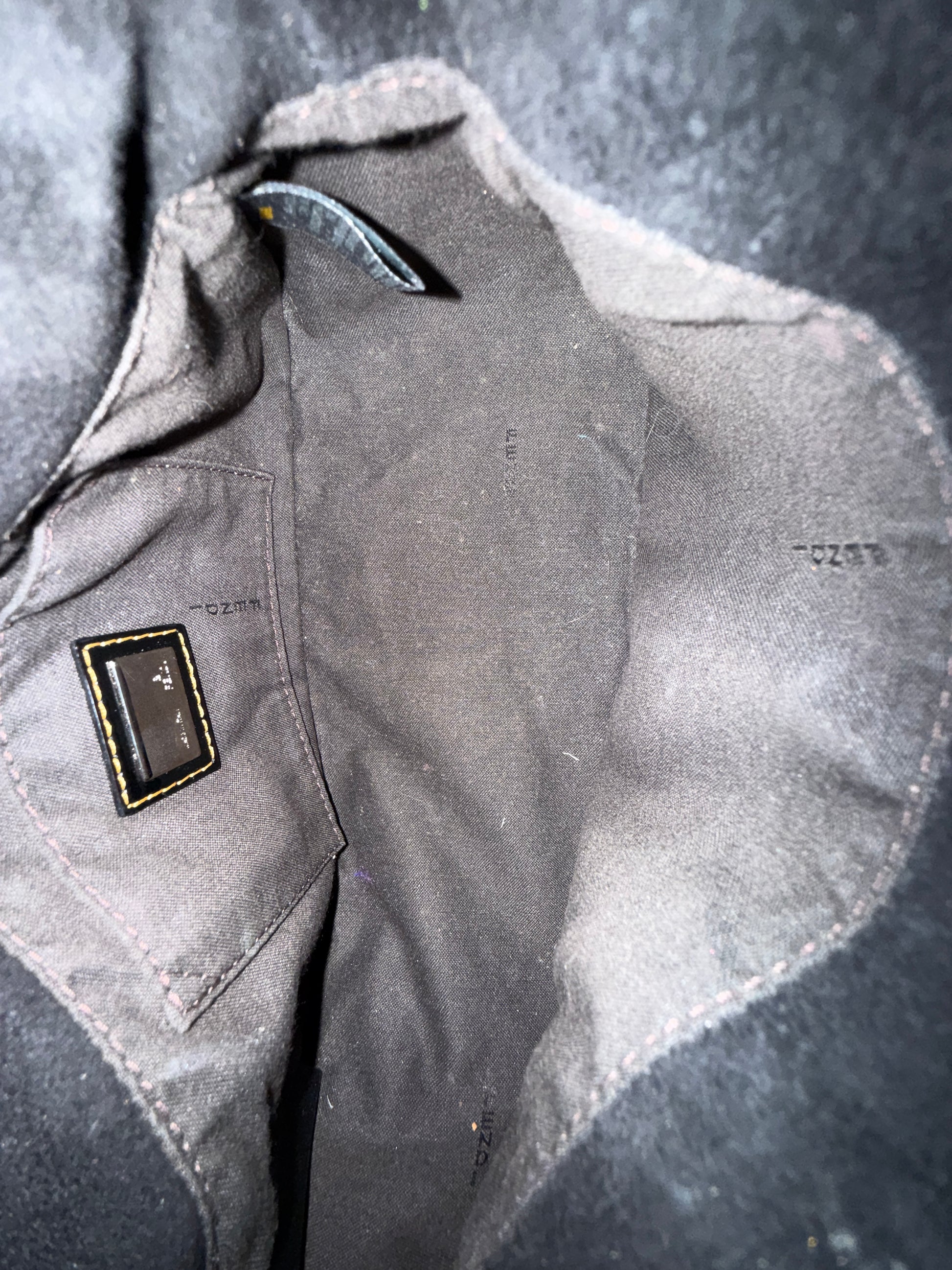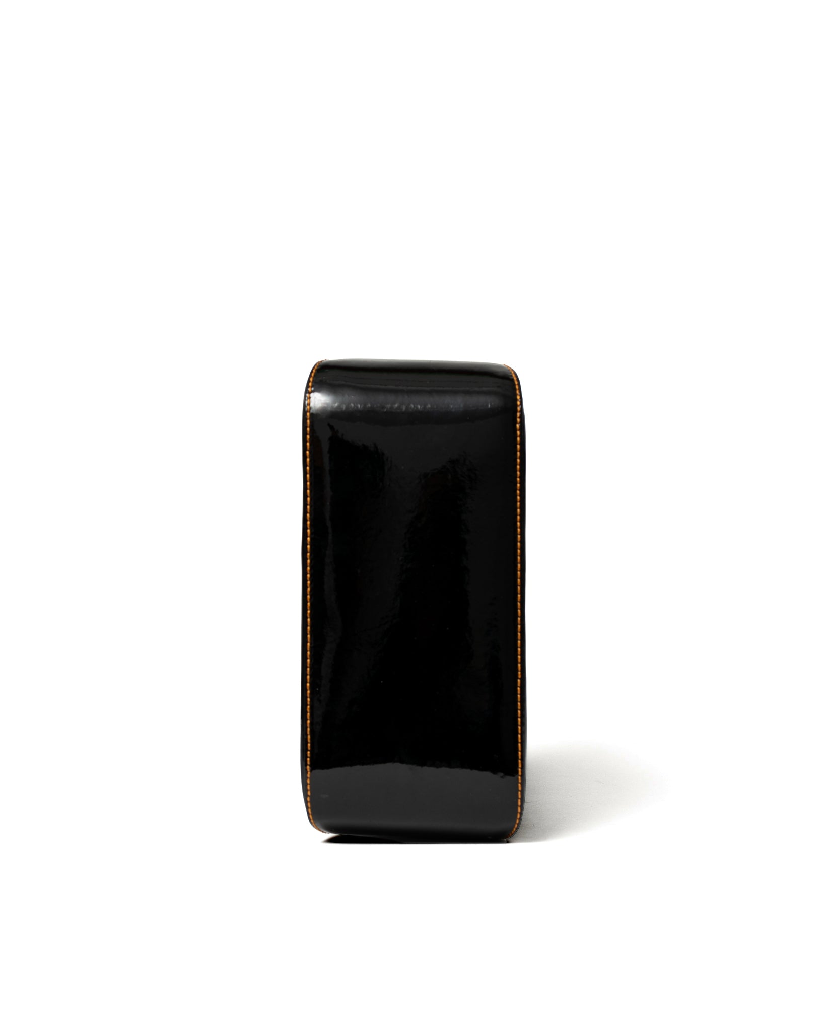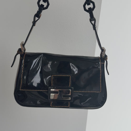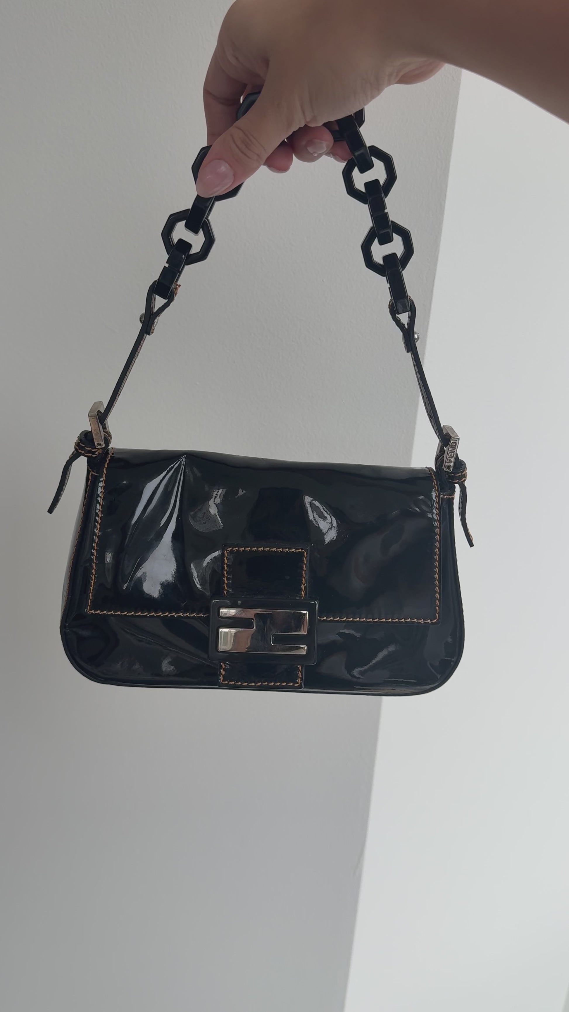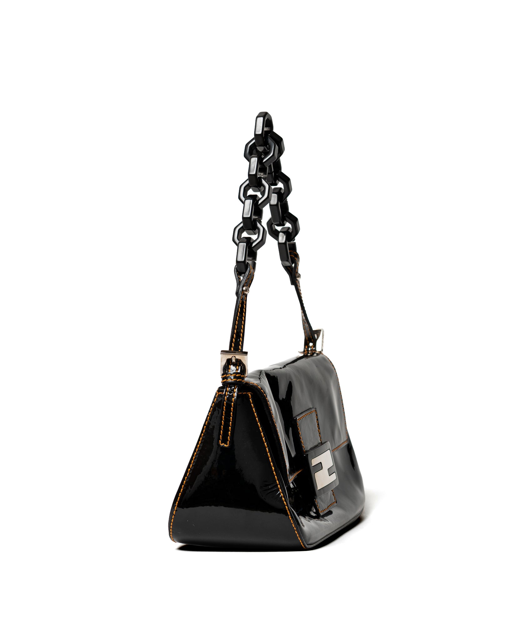 Black patent leather bag with silver-tone hardware and a chain link handle.