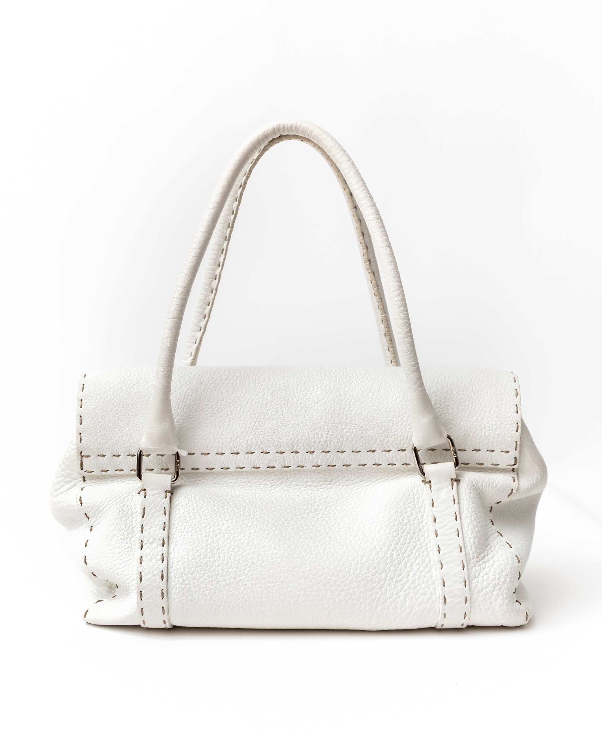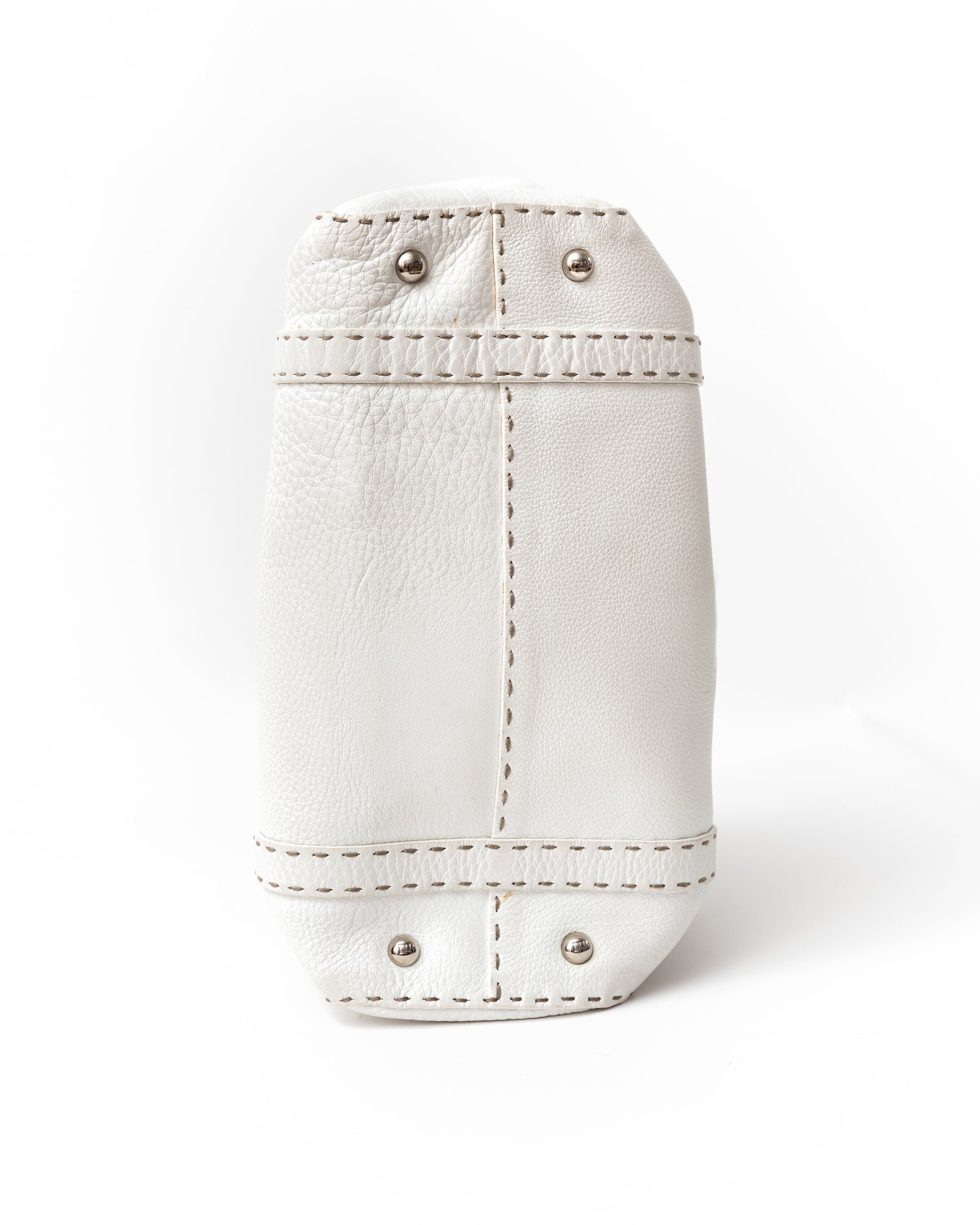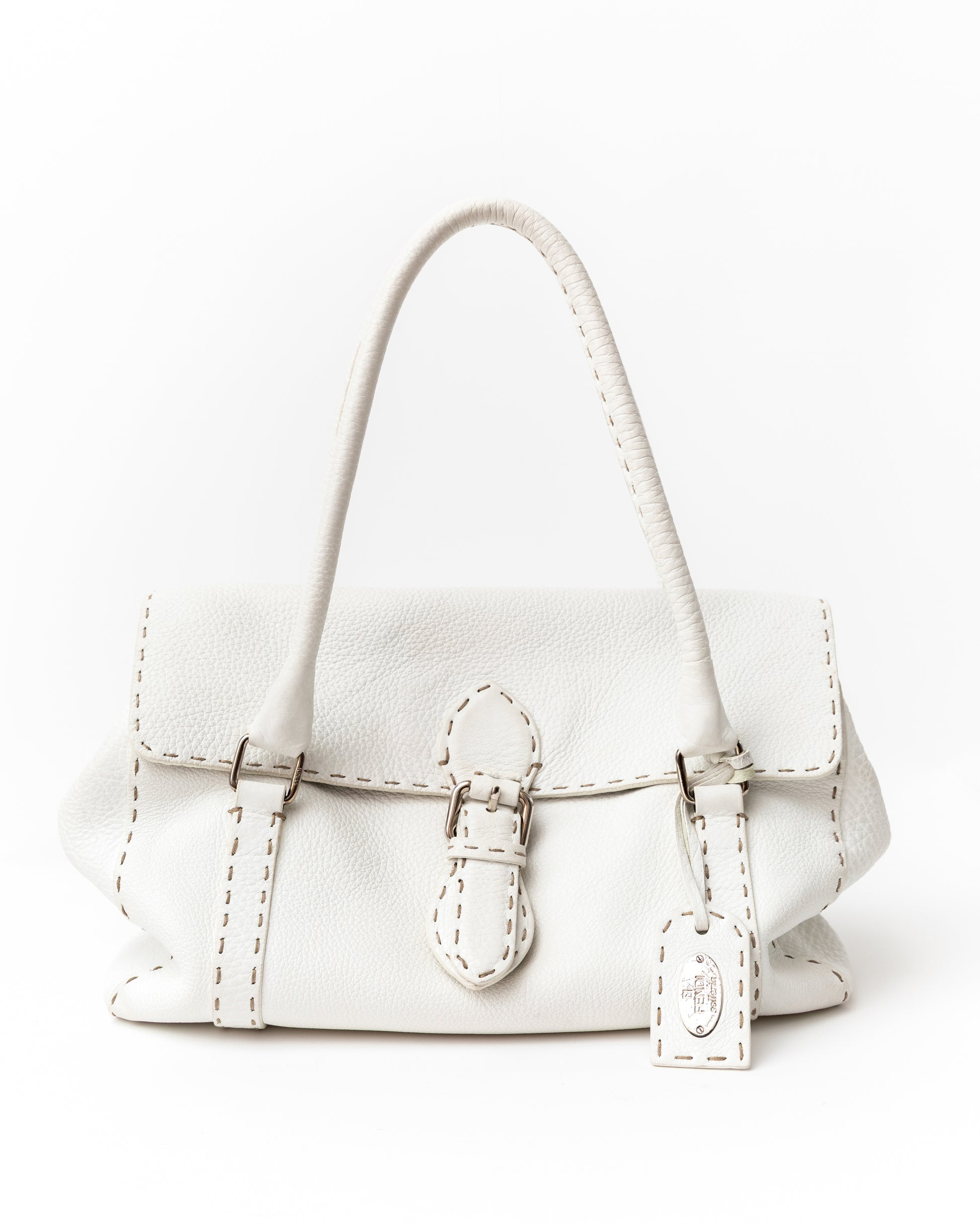 - This iconic Fendi white leather bag would look so cool for an all white monochrome look or for using as your go to summer bag. The brown contrast stitching adds dimension in a subtle way, and it even has an adorable Fendi charm attachment.