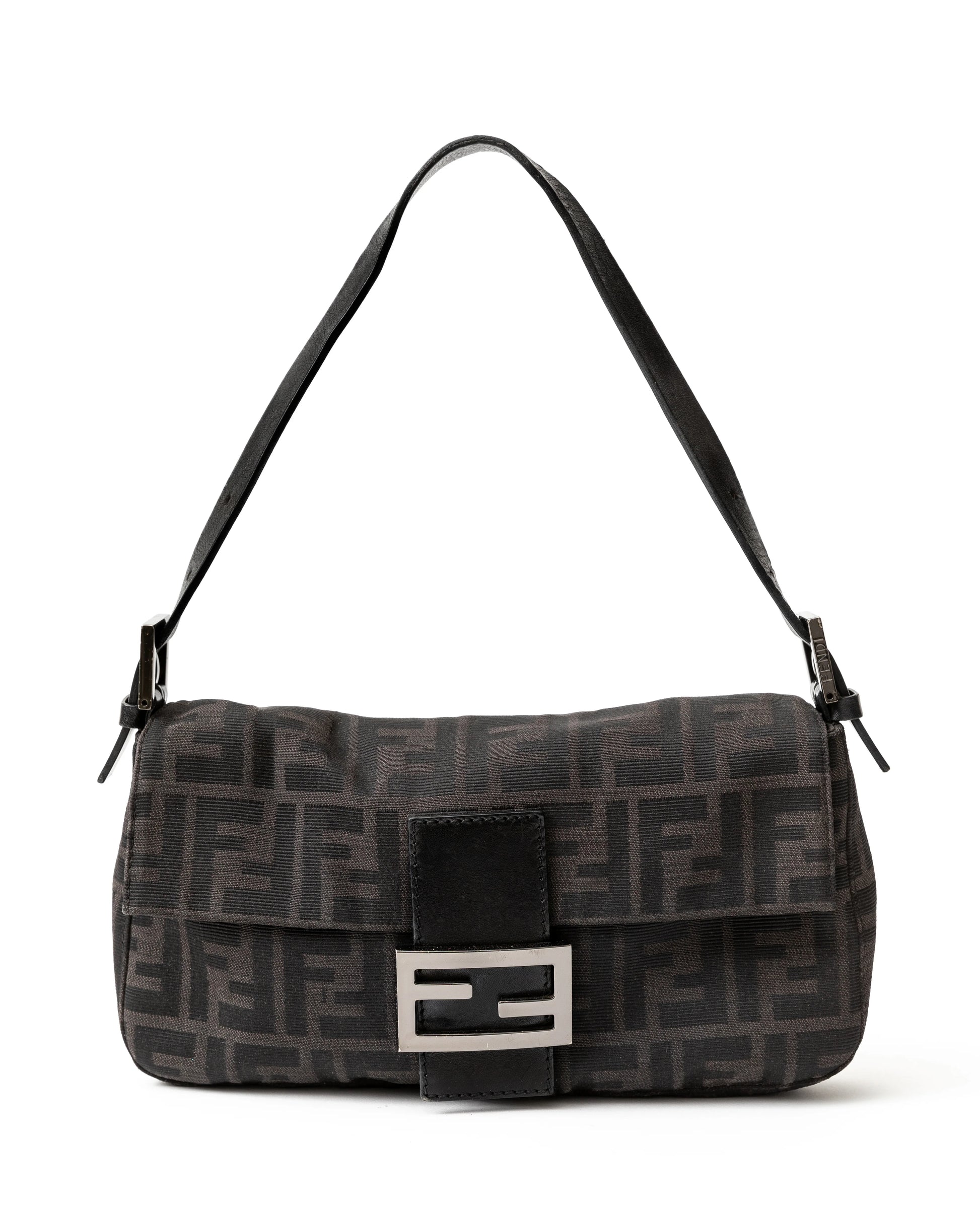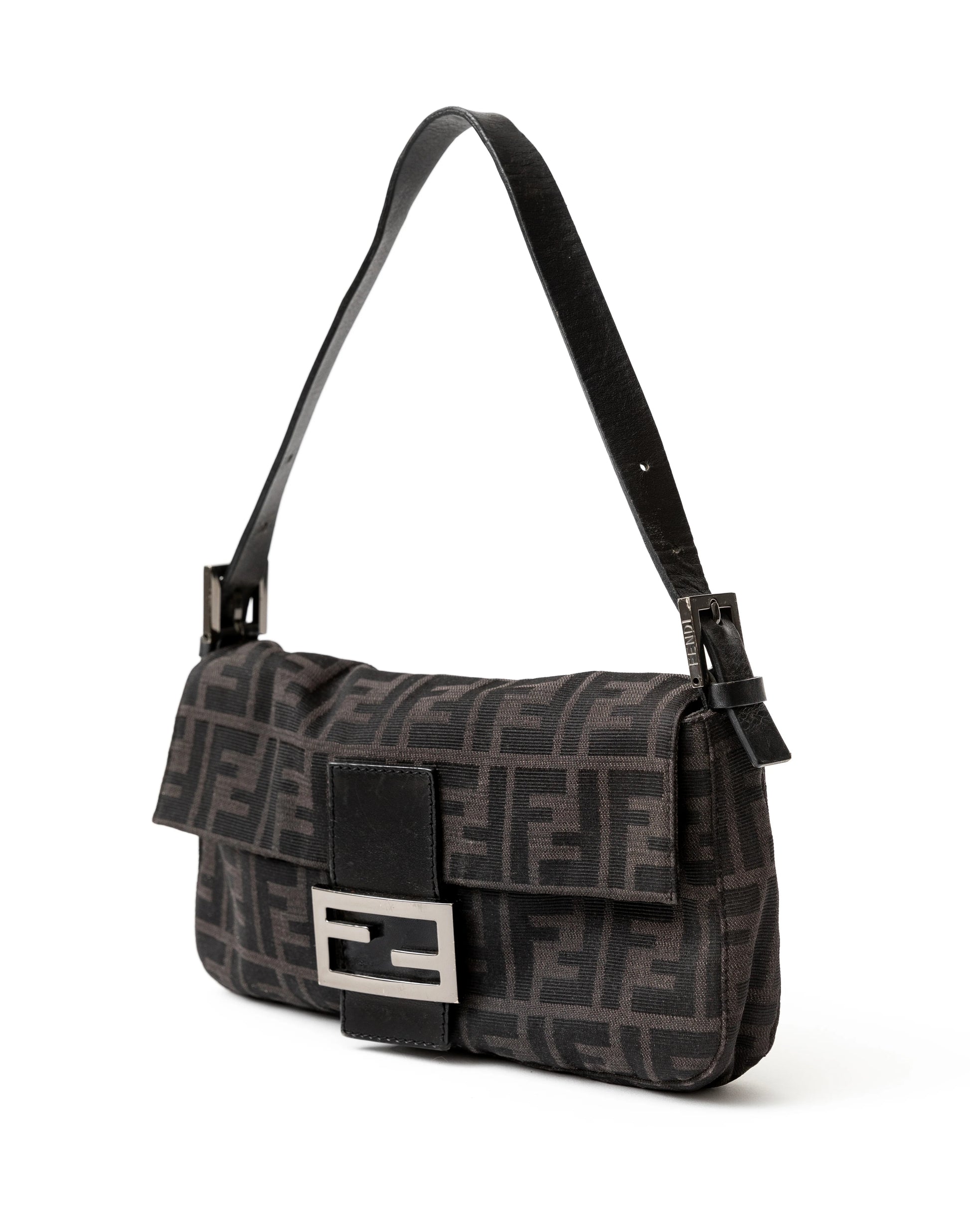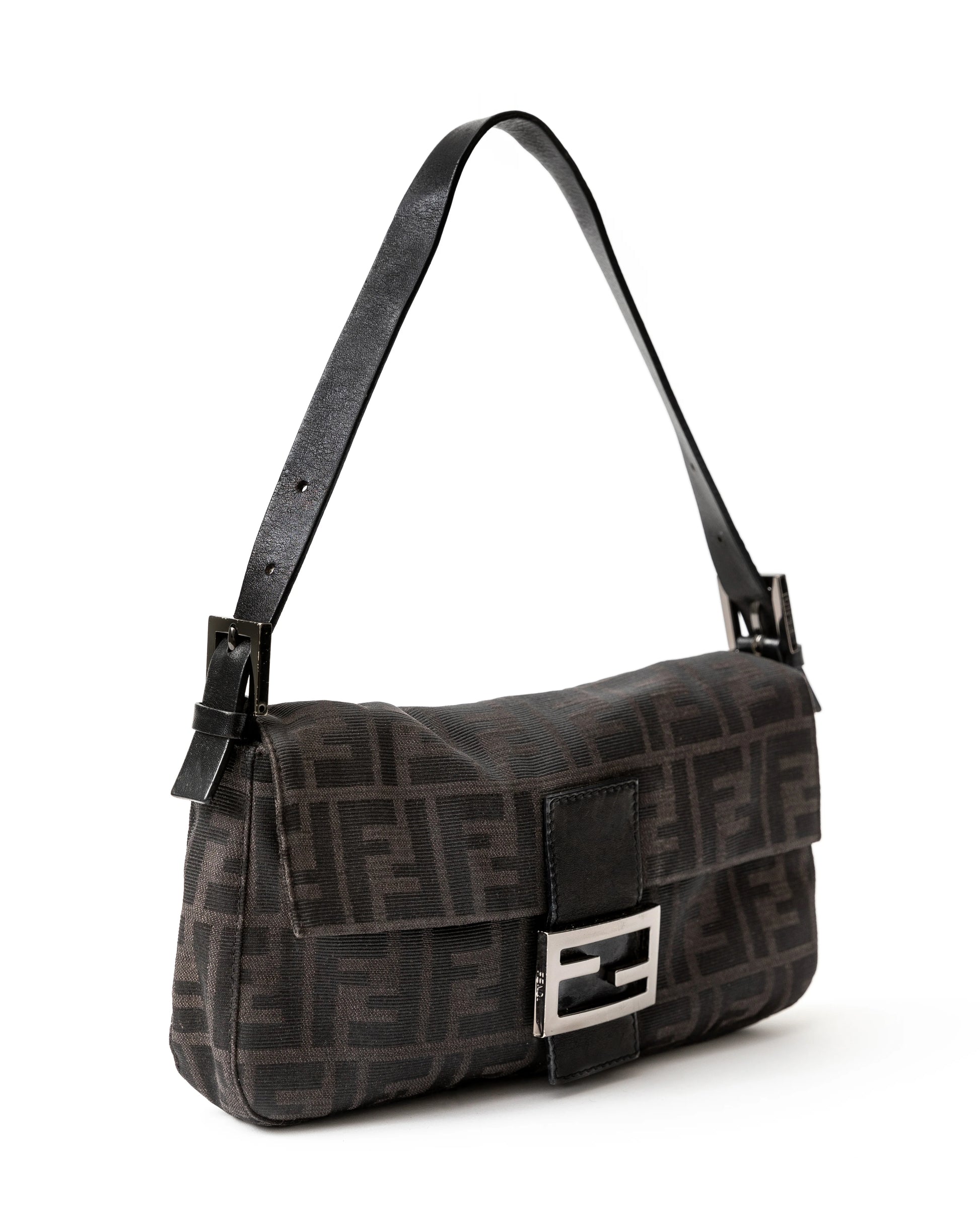 - This Carrie Bradshaw approved staple features RARE black Zucca monogram with black leather detailing and adjustable strap in excellent shape. Still has the protective plastic sticker on the inside silver plaque!
