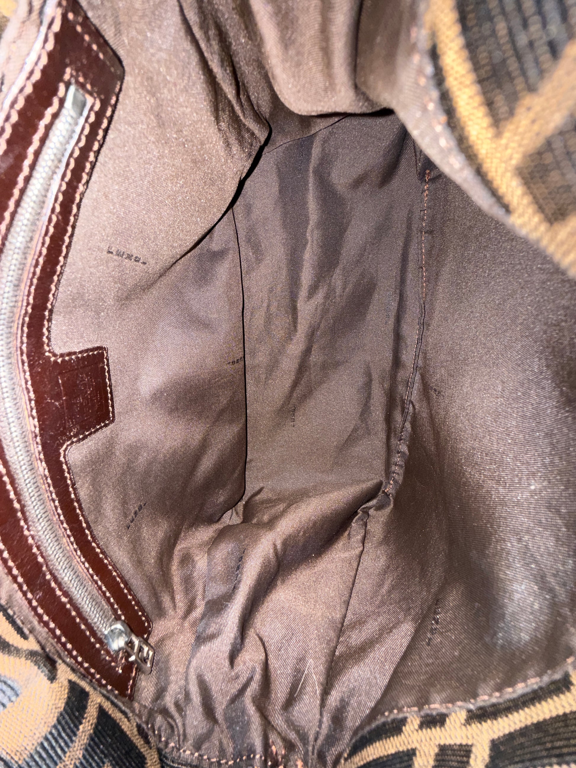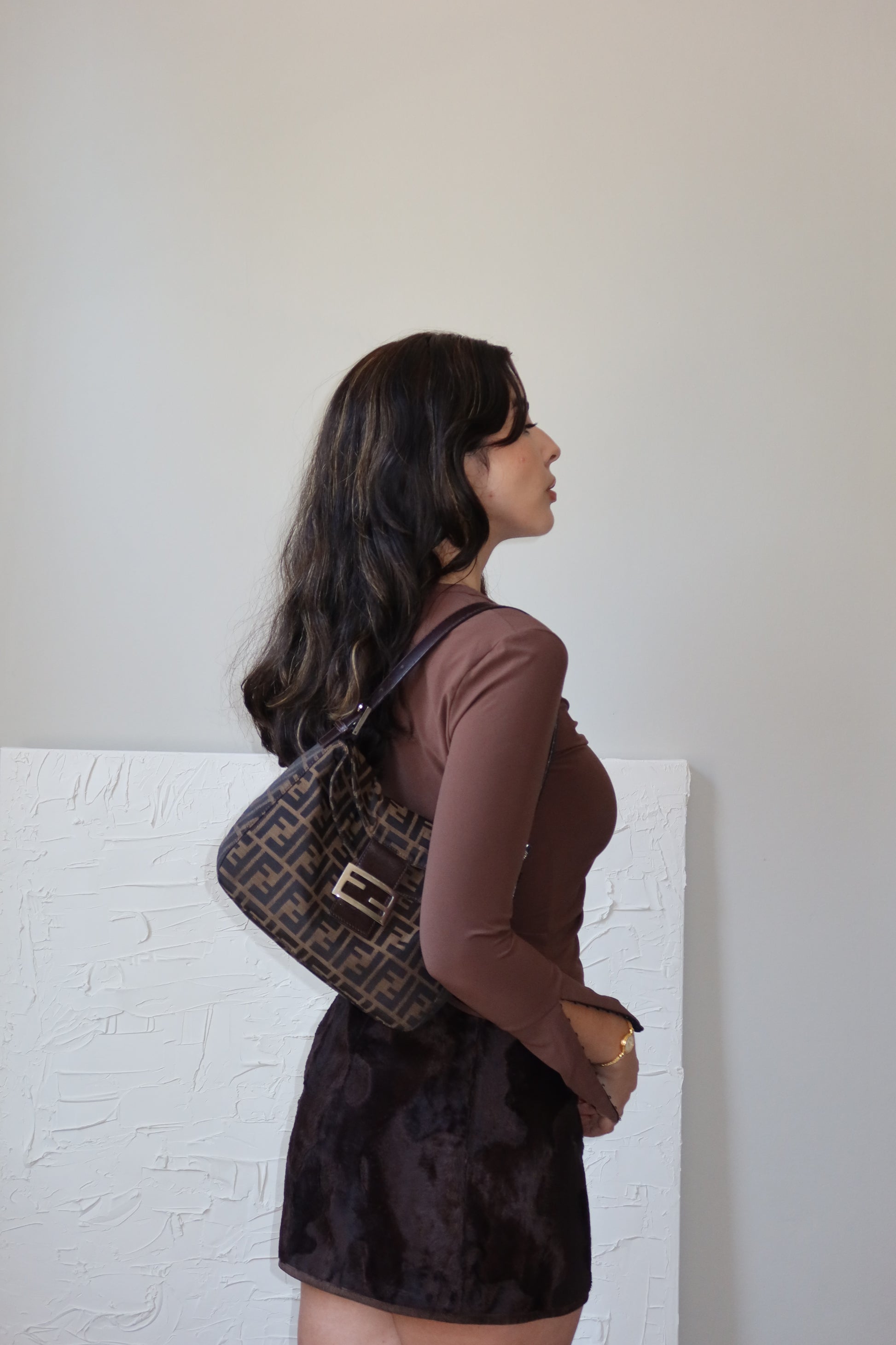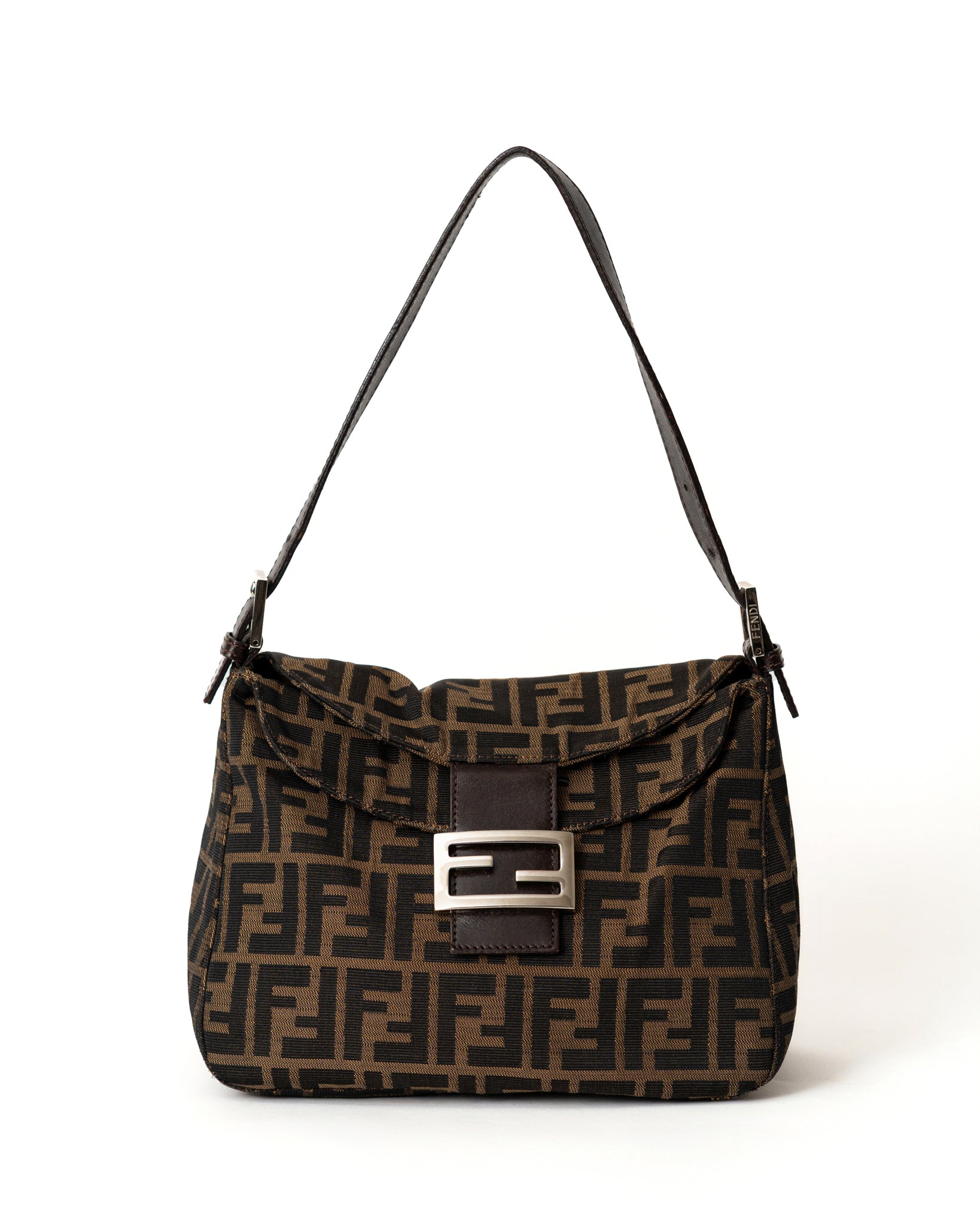 This classic Fendi Zucca baguette features silver hardware and a unique double flap exterior - Carrie Bradshaw would definitely approve for strutting around the city in the fall and winter months.