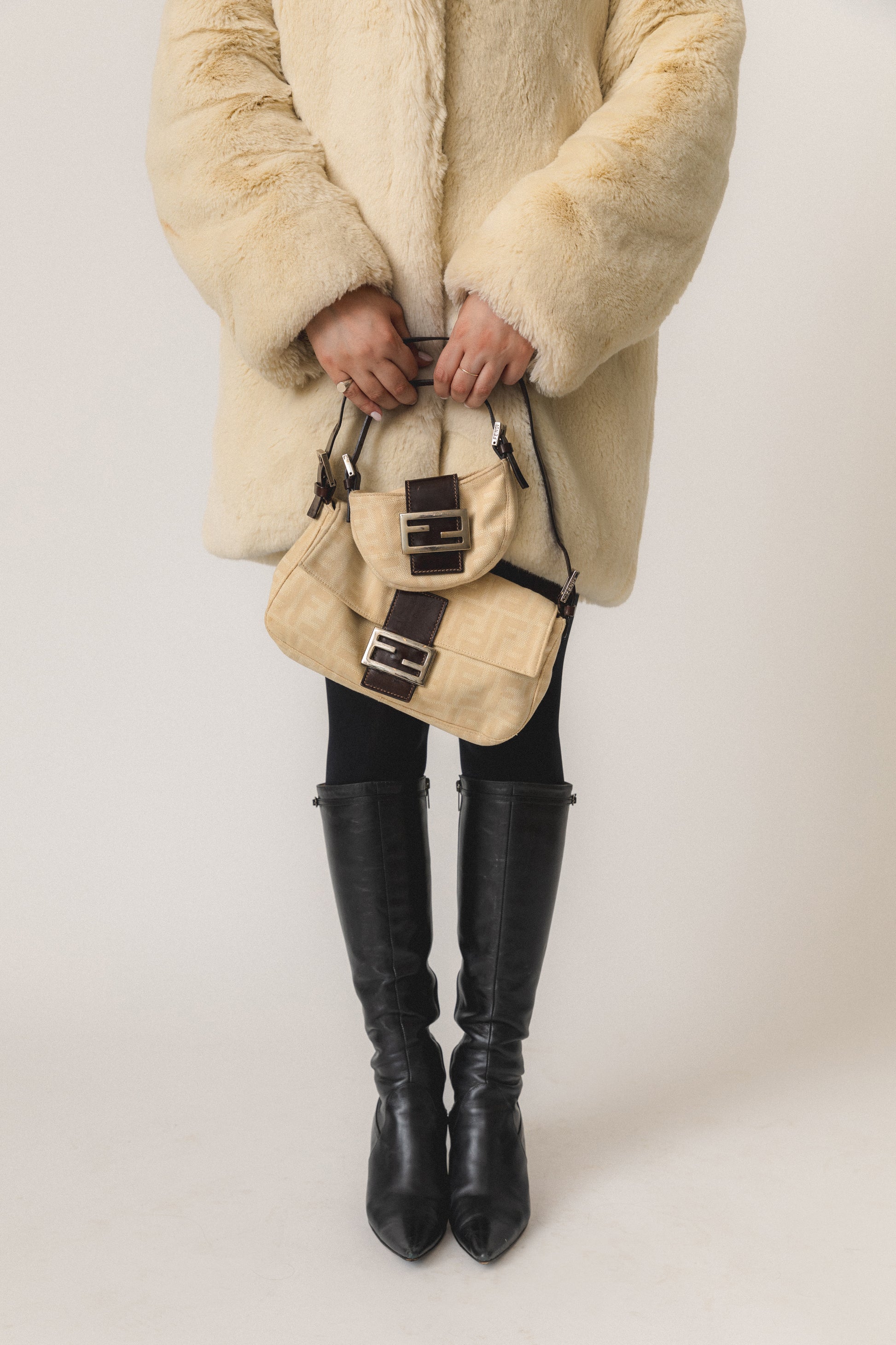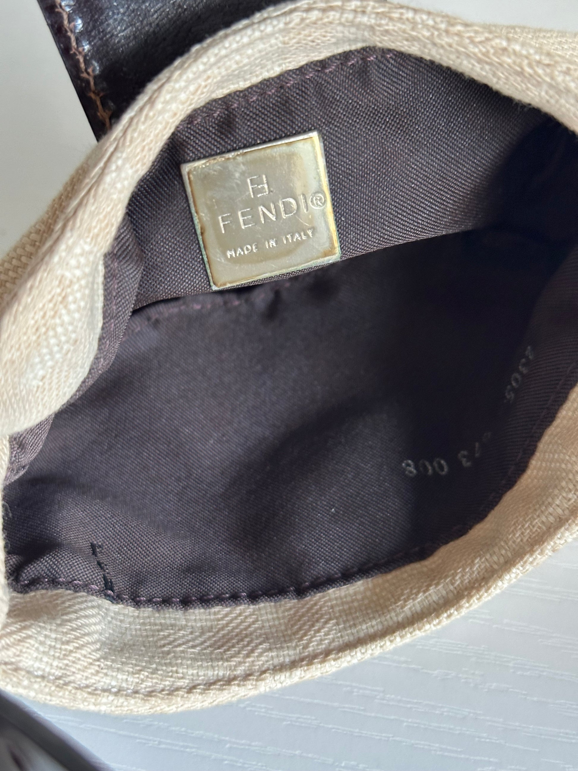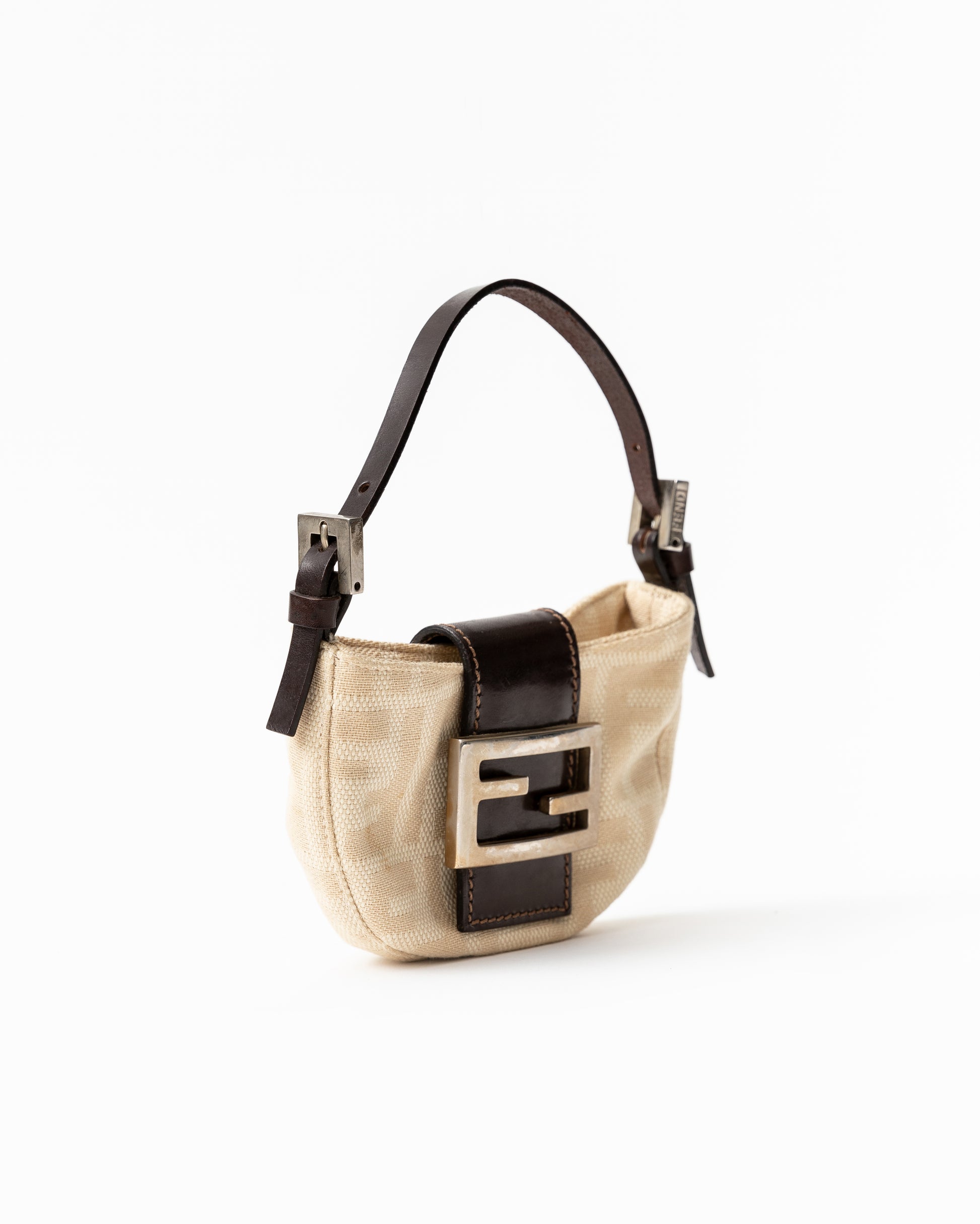 - A Carrie Bradshaw approved mini bag! This cutie features the iconic Fendi Zucca canvas in tan with brown leather trimming and silver hardware.