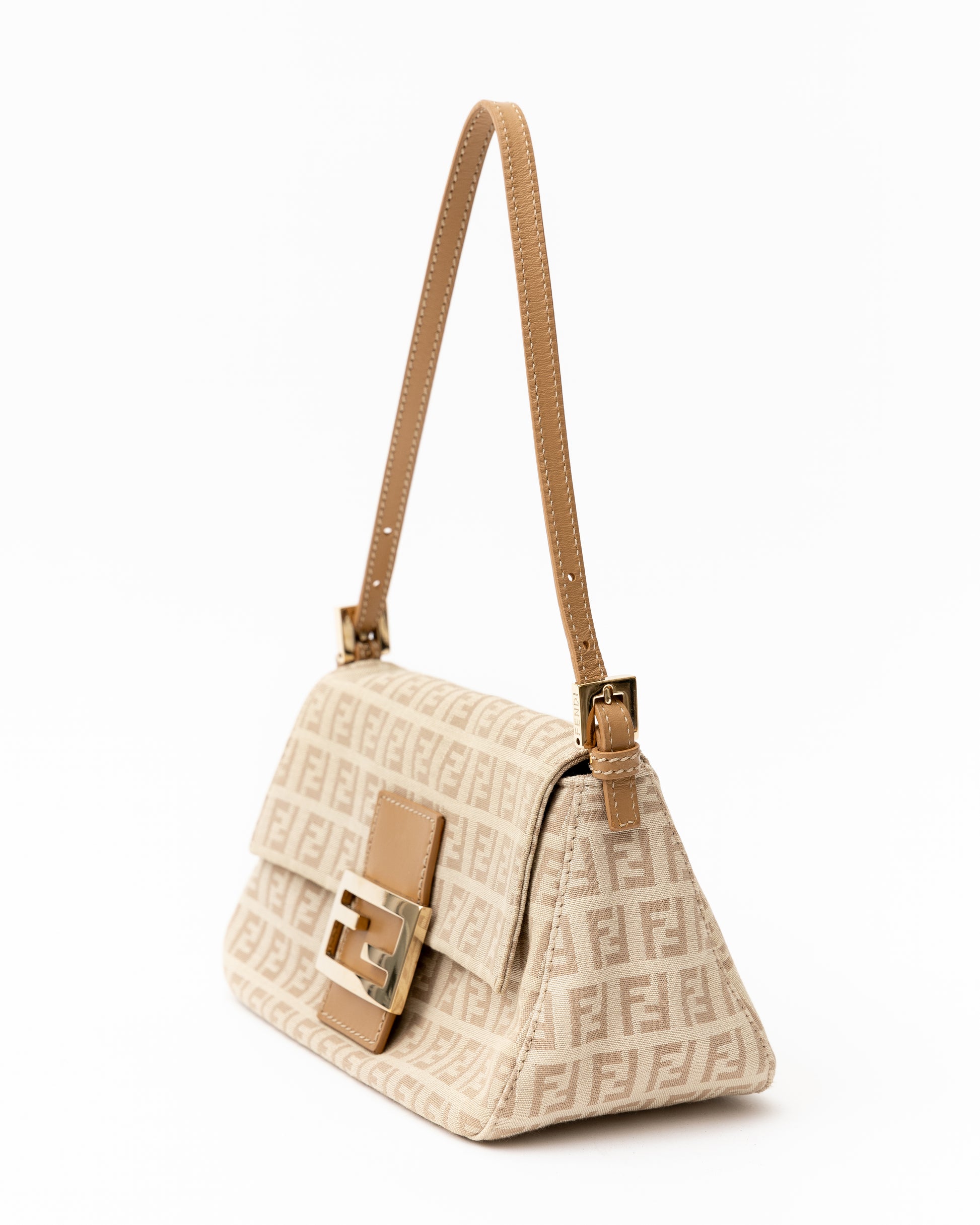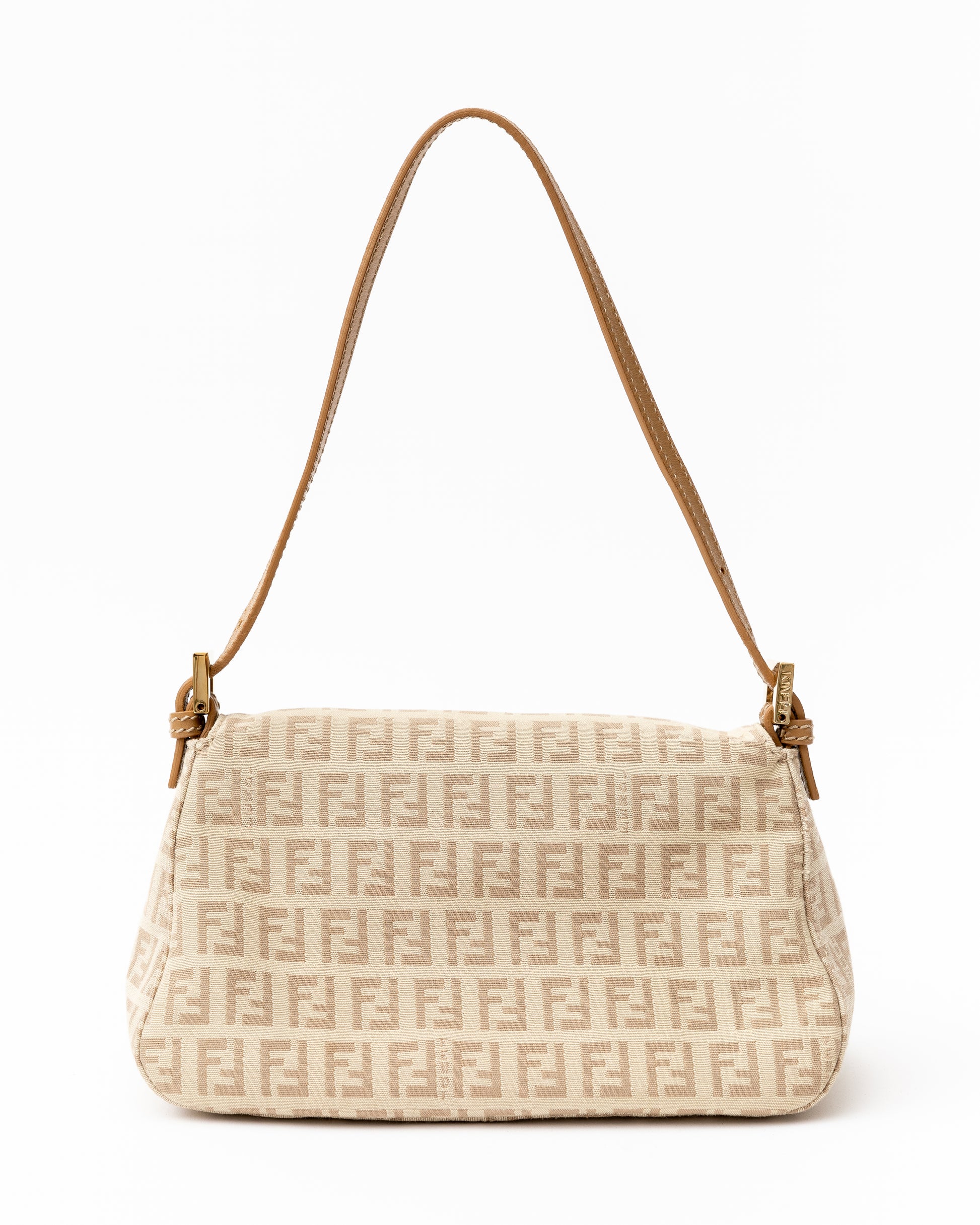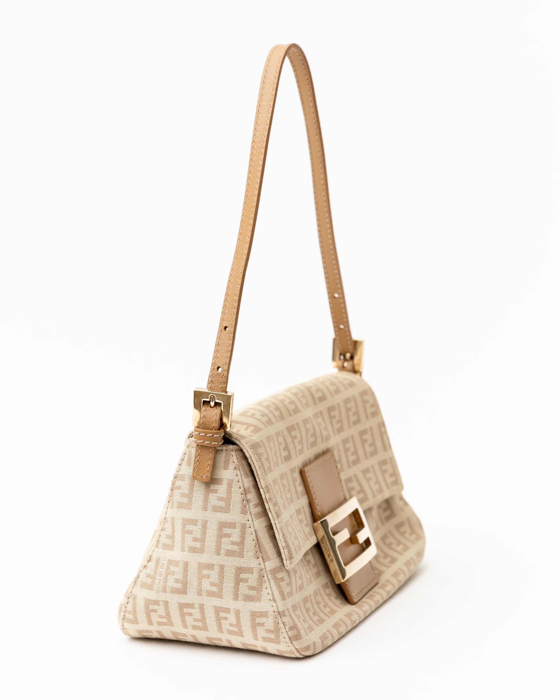 - A Carrie Bradshaw approved staple! This Fendi mini baguette features the iconic Fendi zucchino canvas with rare tan leather trimming and gold hardware. Also features an adjustable leather strap.
