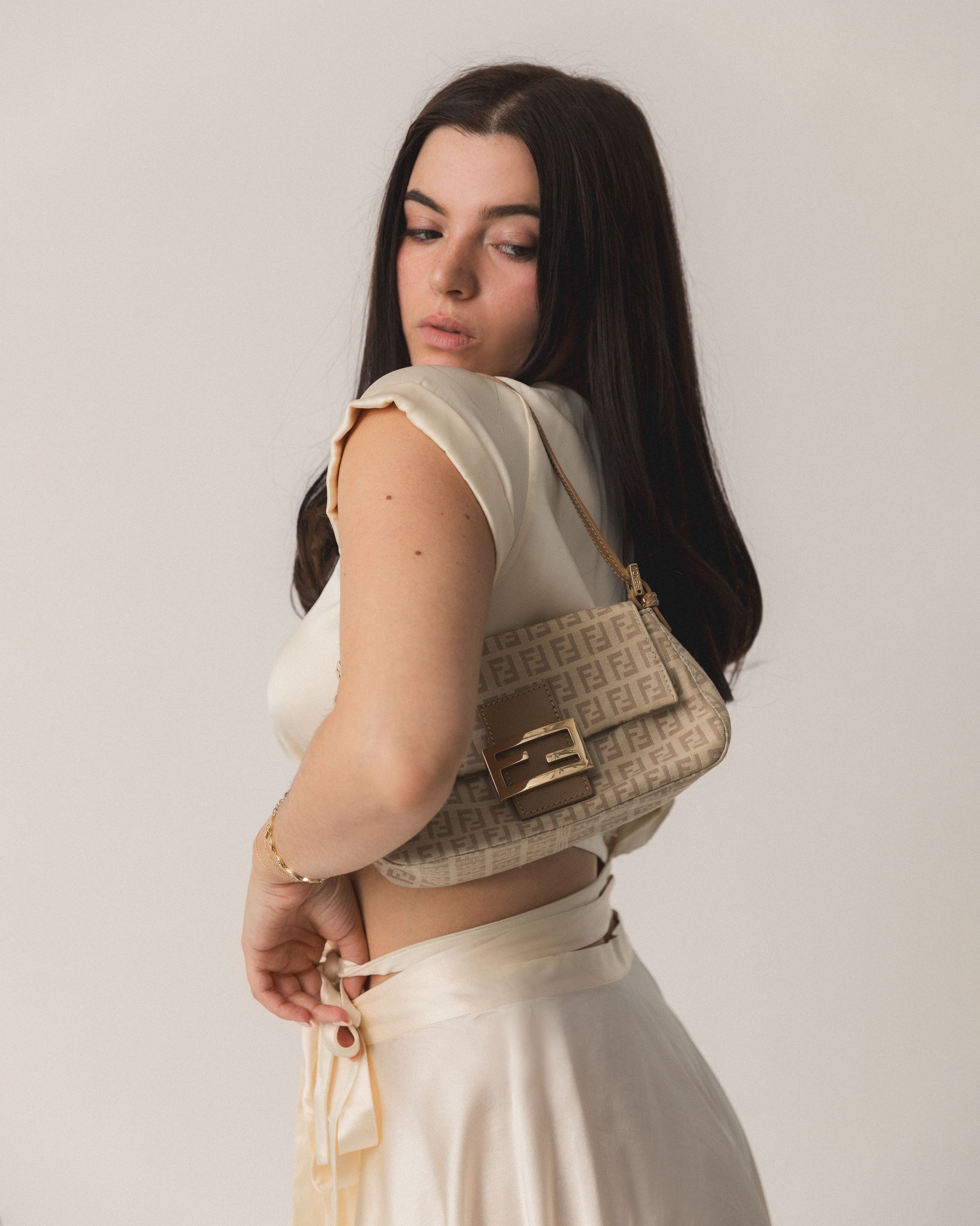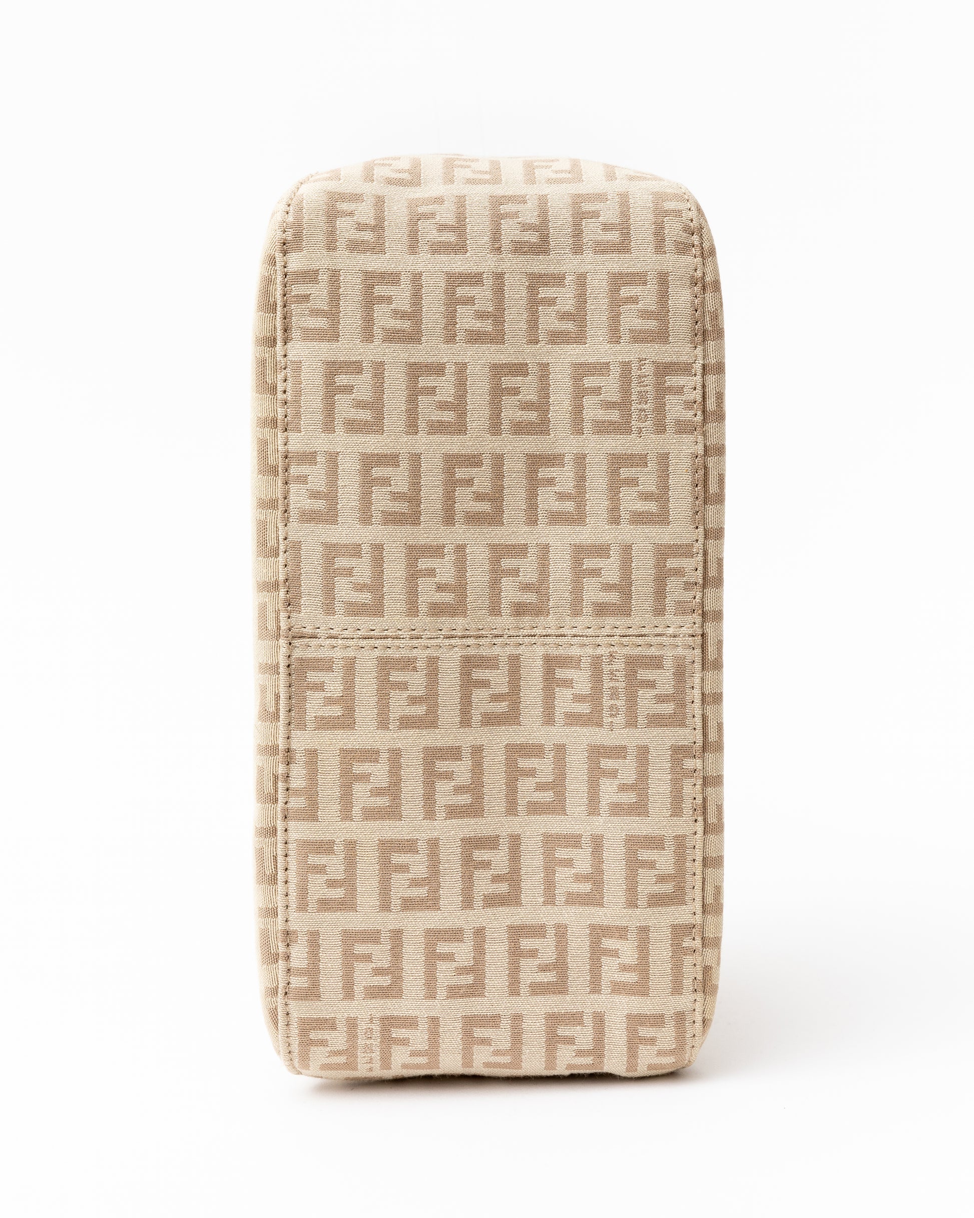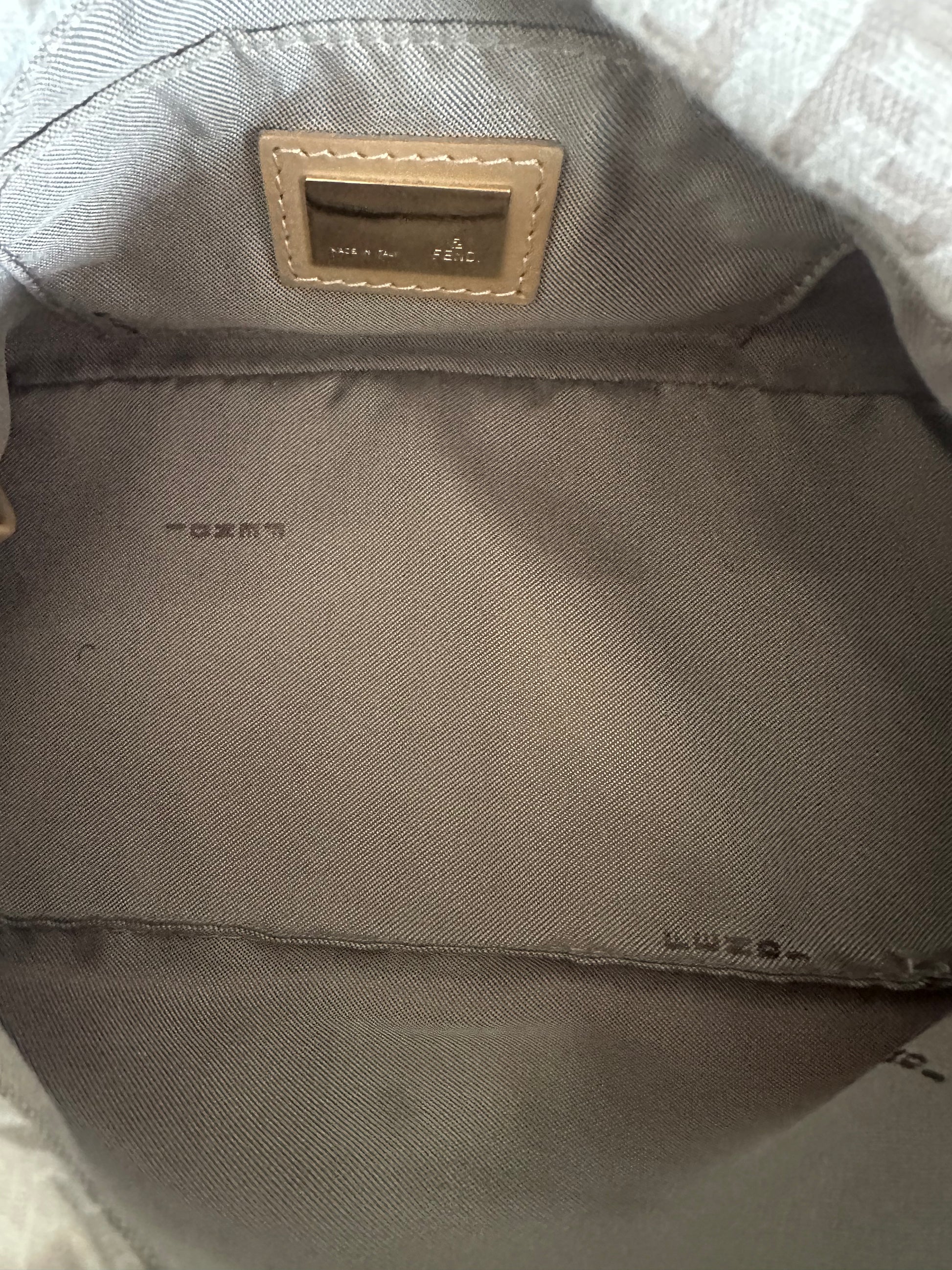 - A Carrie Bradshaw approved staple! This Fendi mini baguette features the iconic Fendi zucchino canvas with rare tan leather trimming and gold hardware. Also features an adjustable leather strap.
