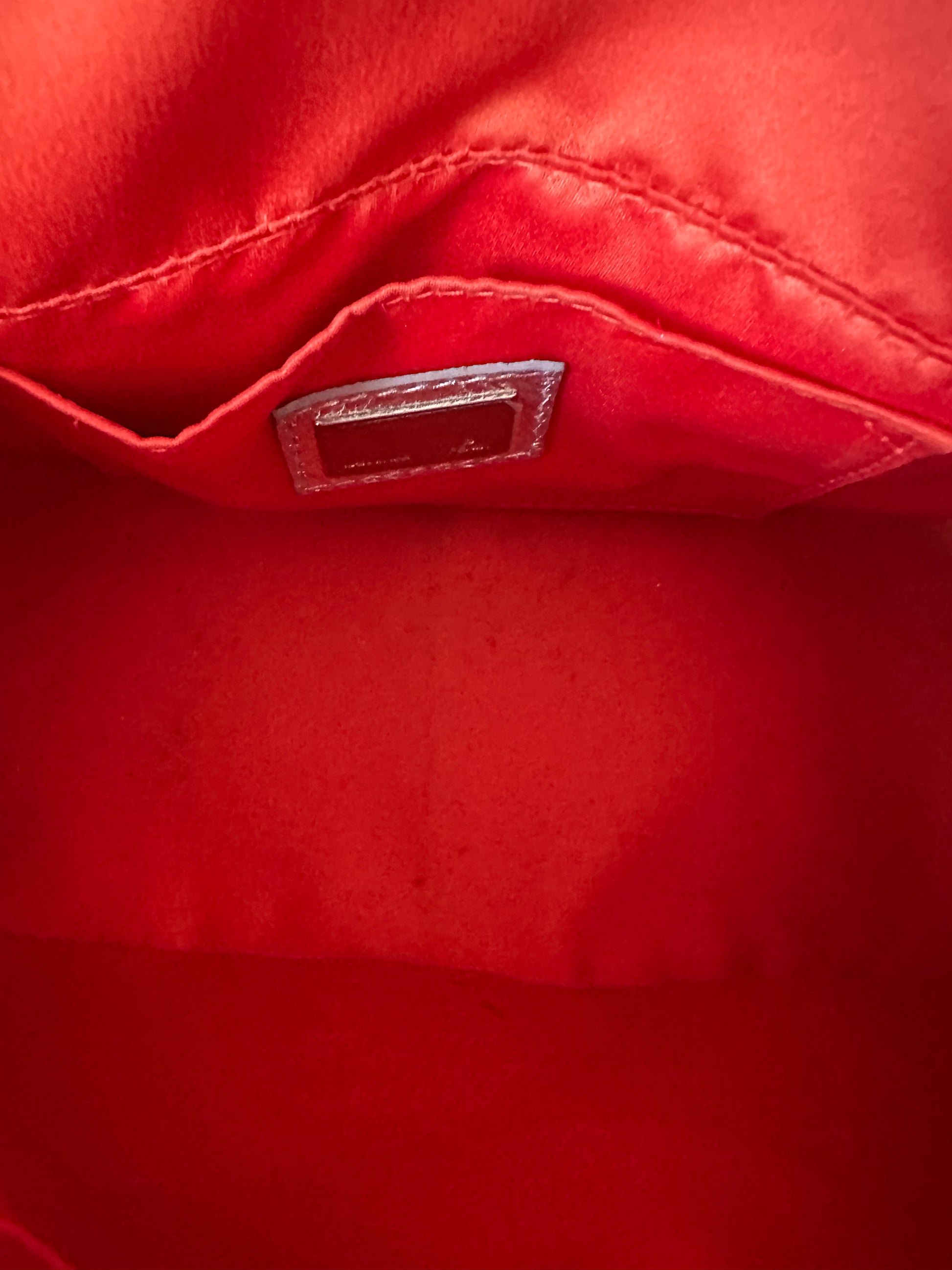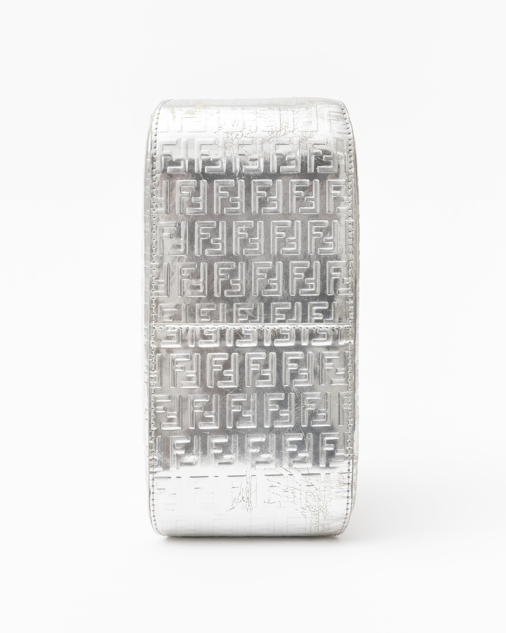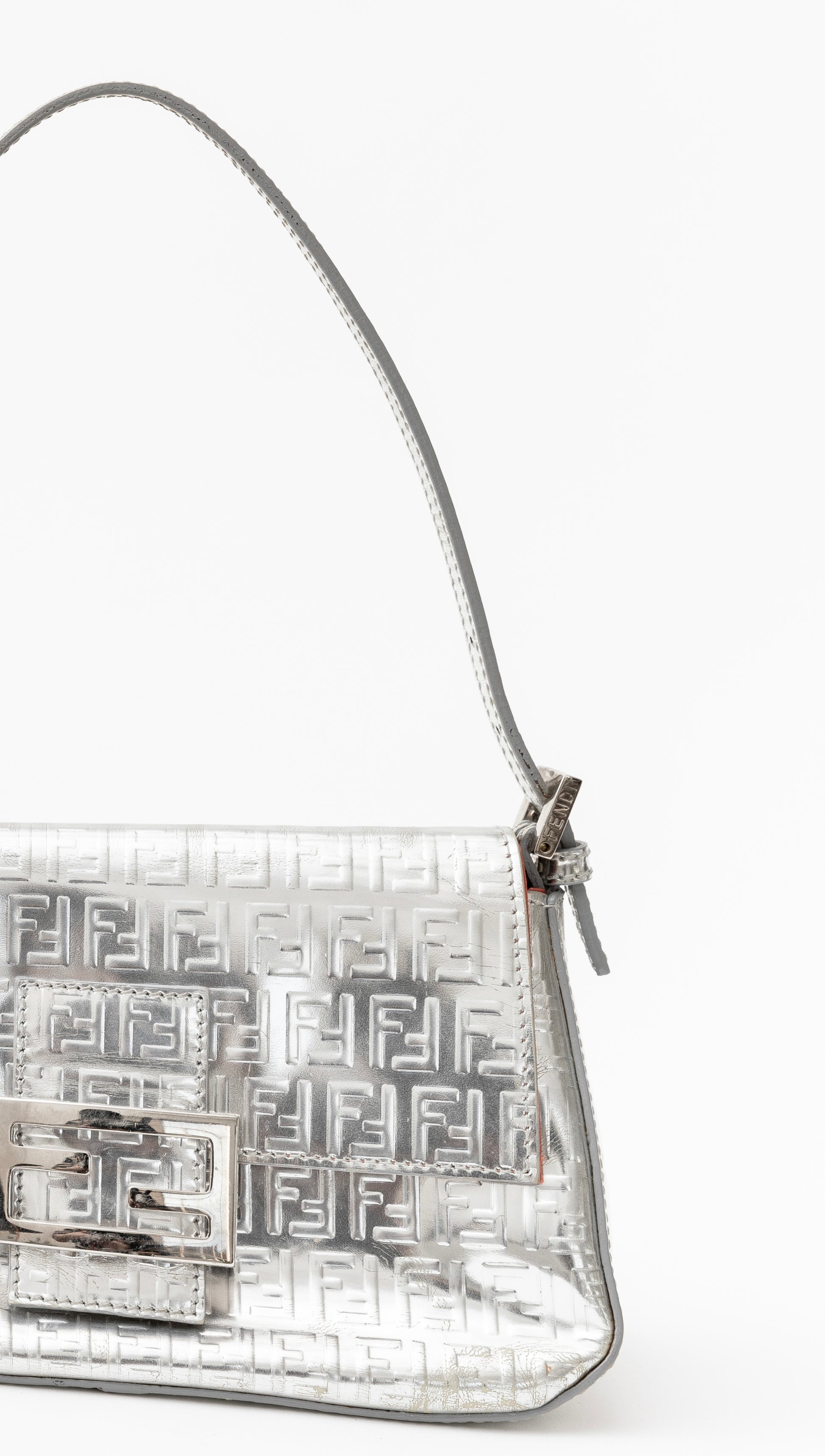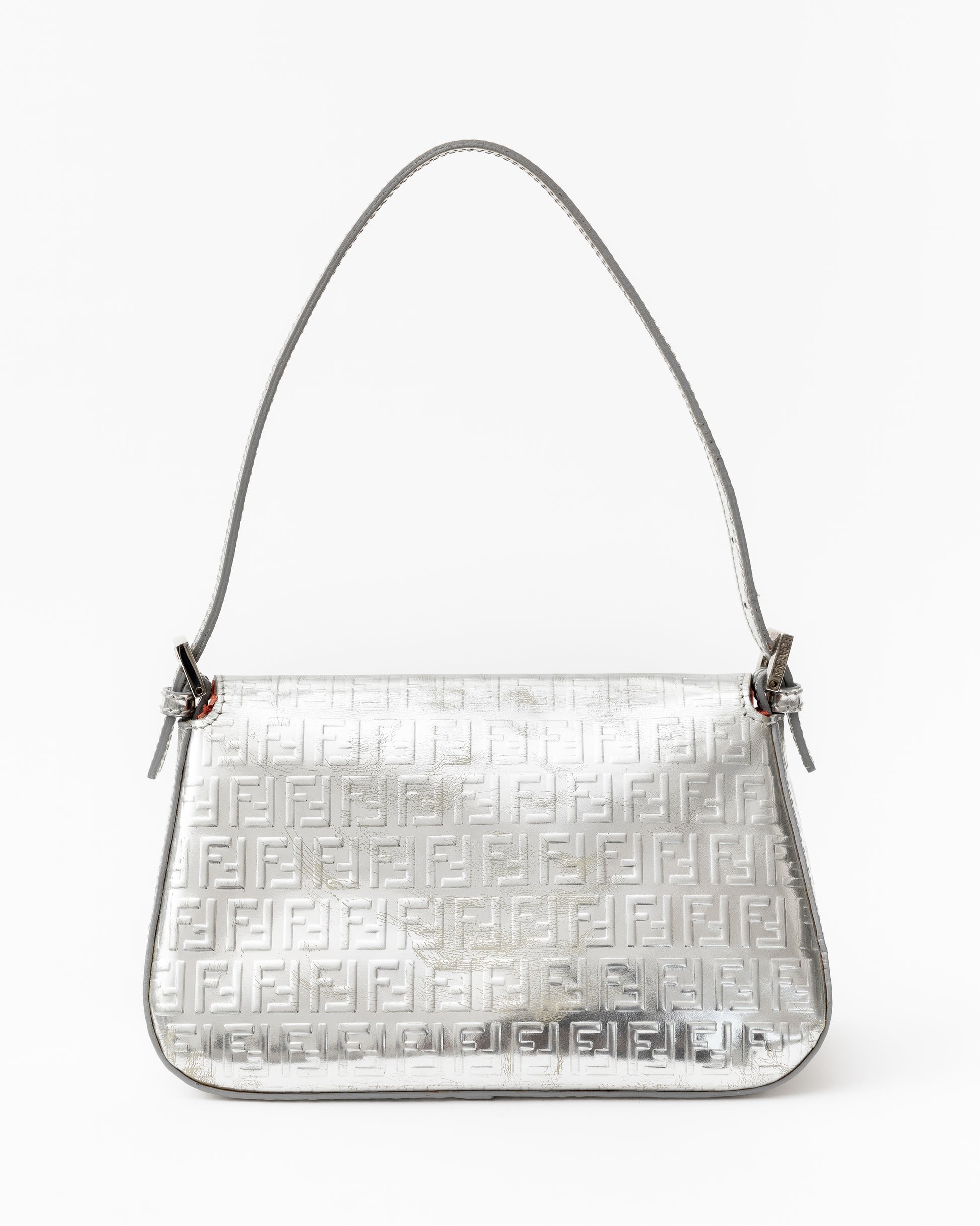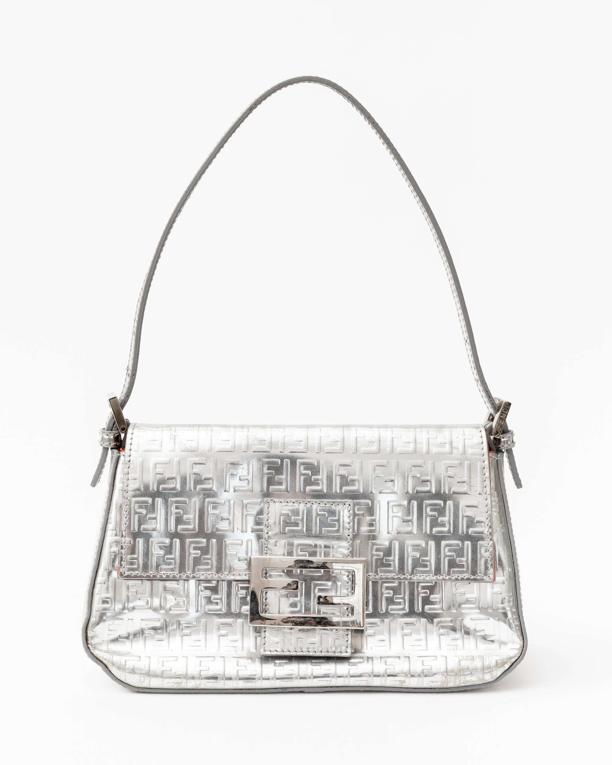 - A Carrie Bradshaw approved staple! This Fendi mini baguette features the iconic Fendi zucchino canvas with an extremely RARE silver patent leather canvas and orange silk interior. Also features an adjustable leather strap.