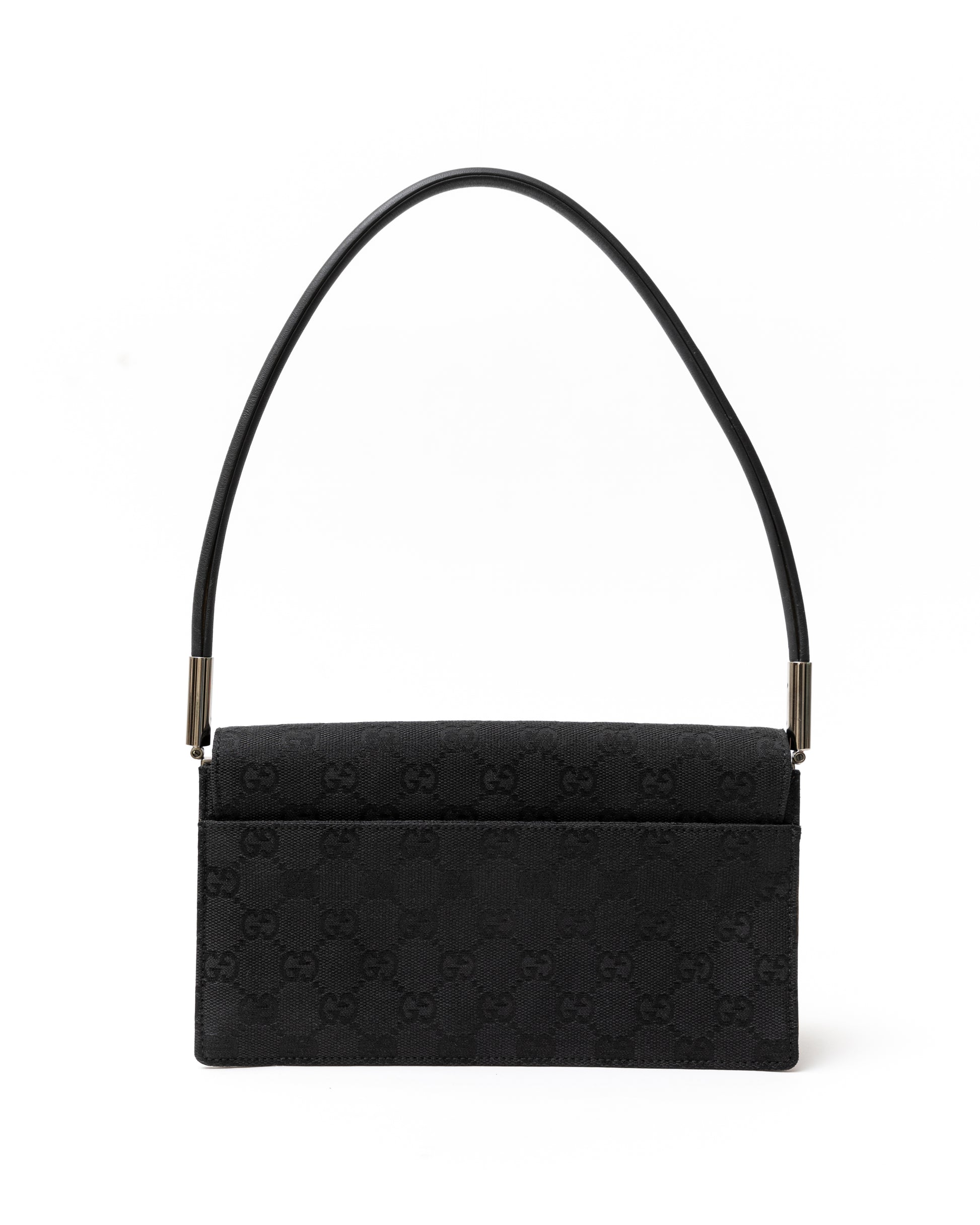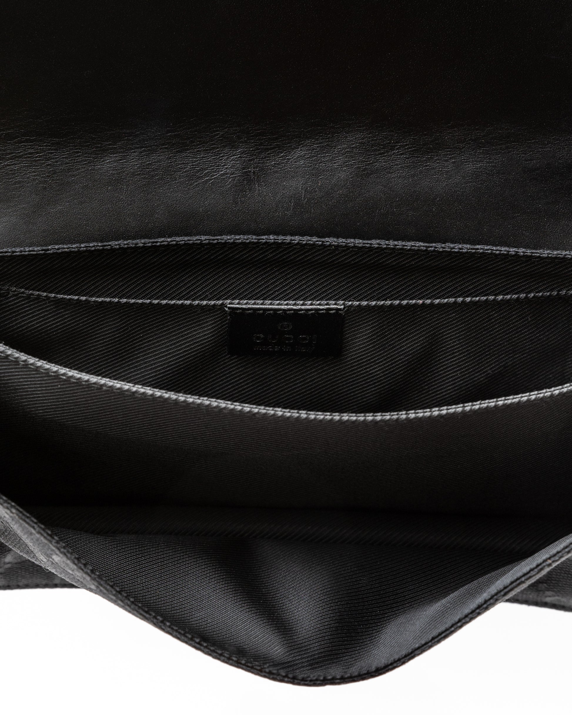 - Black monogram canvas with a sectioned interior and an additional pocket.