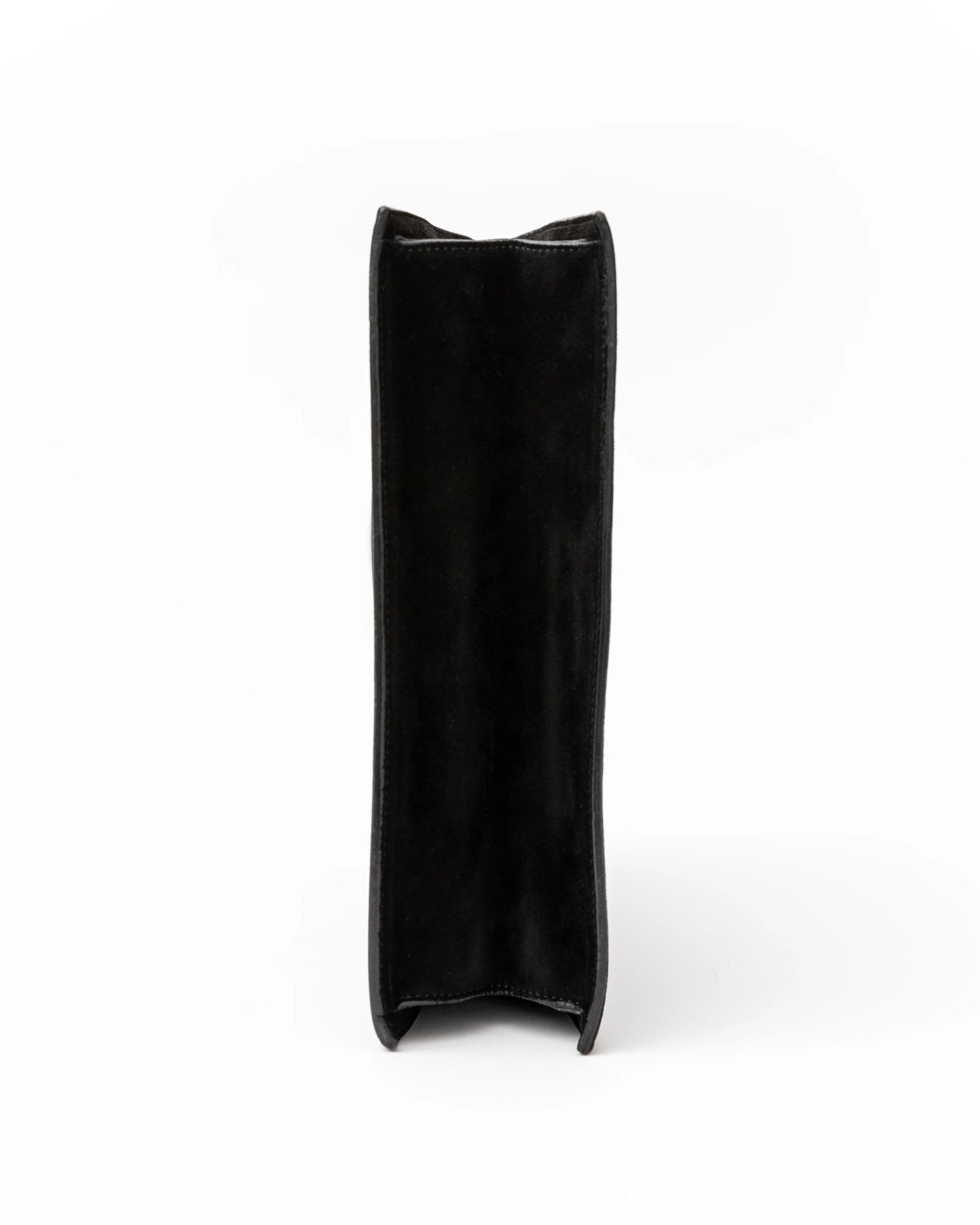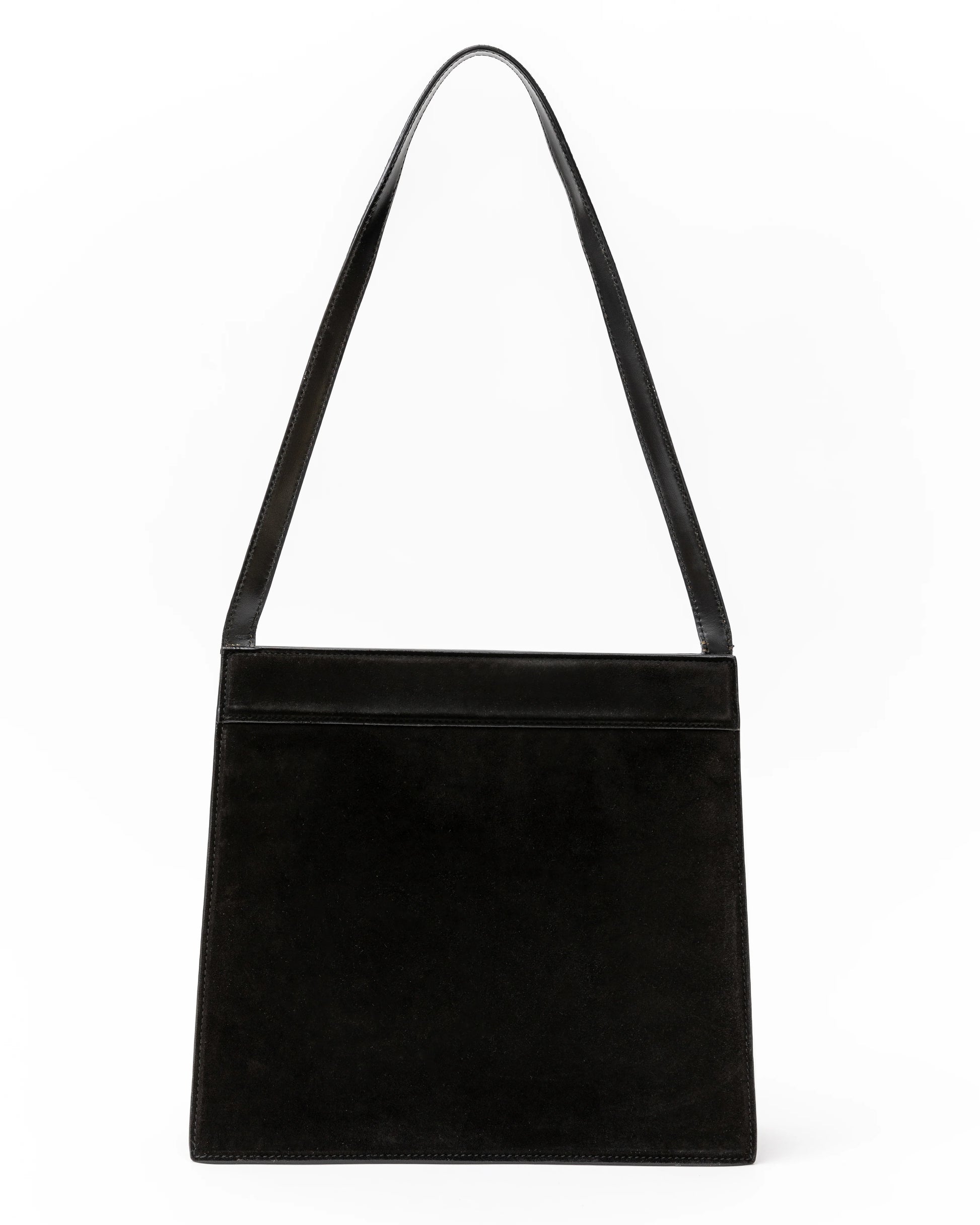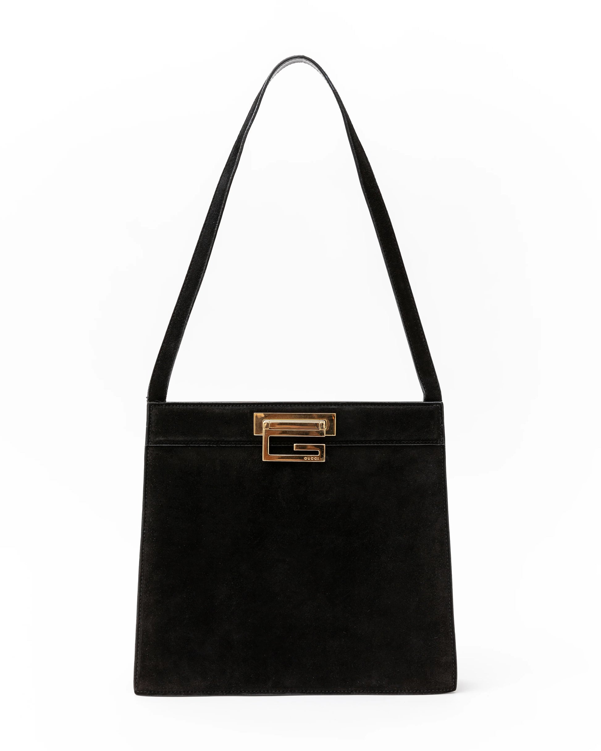 Features sleek design with black suede, iconic G gold logo, and leather shoulder strap.