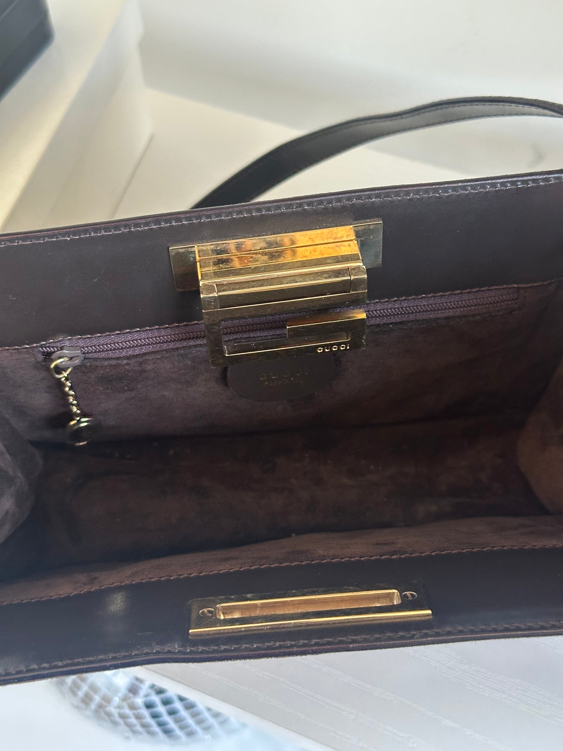 - Suede brown interior is spacious and has zippered pocket with adorable Gucci charm.