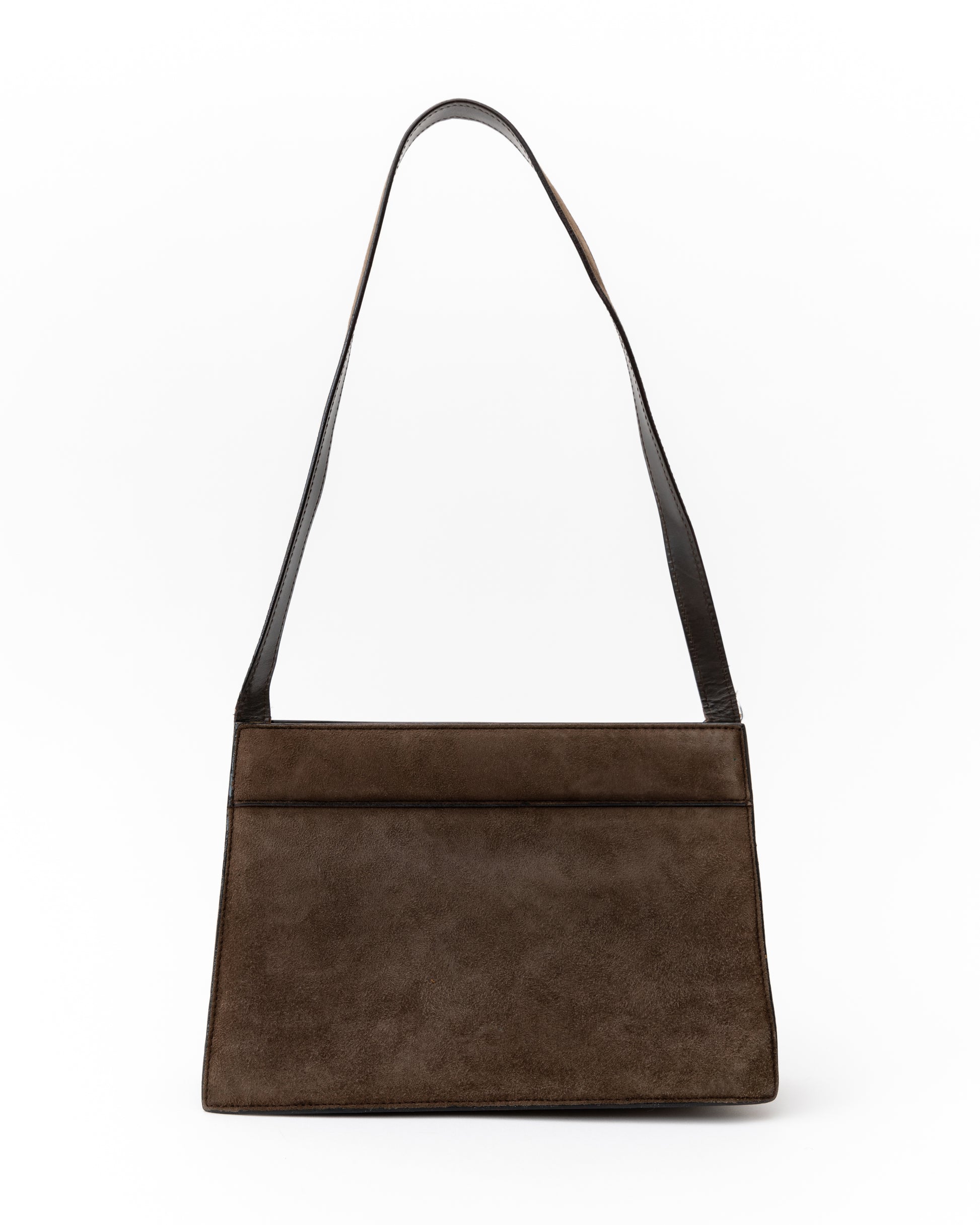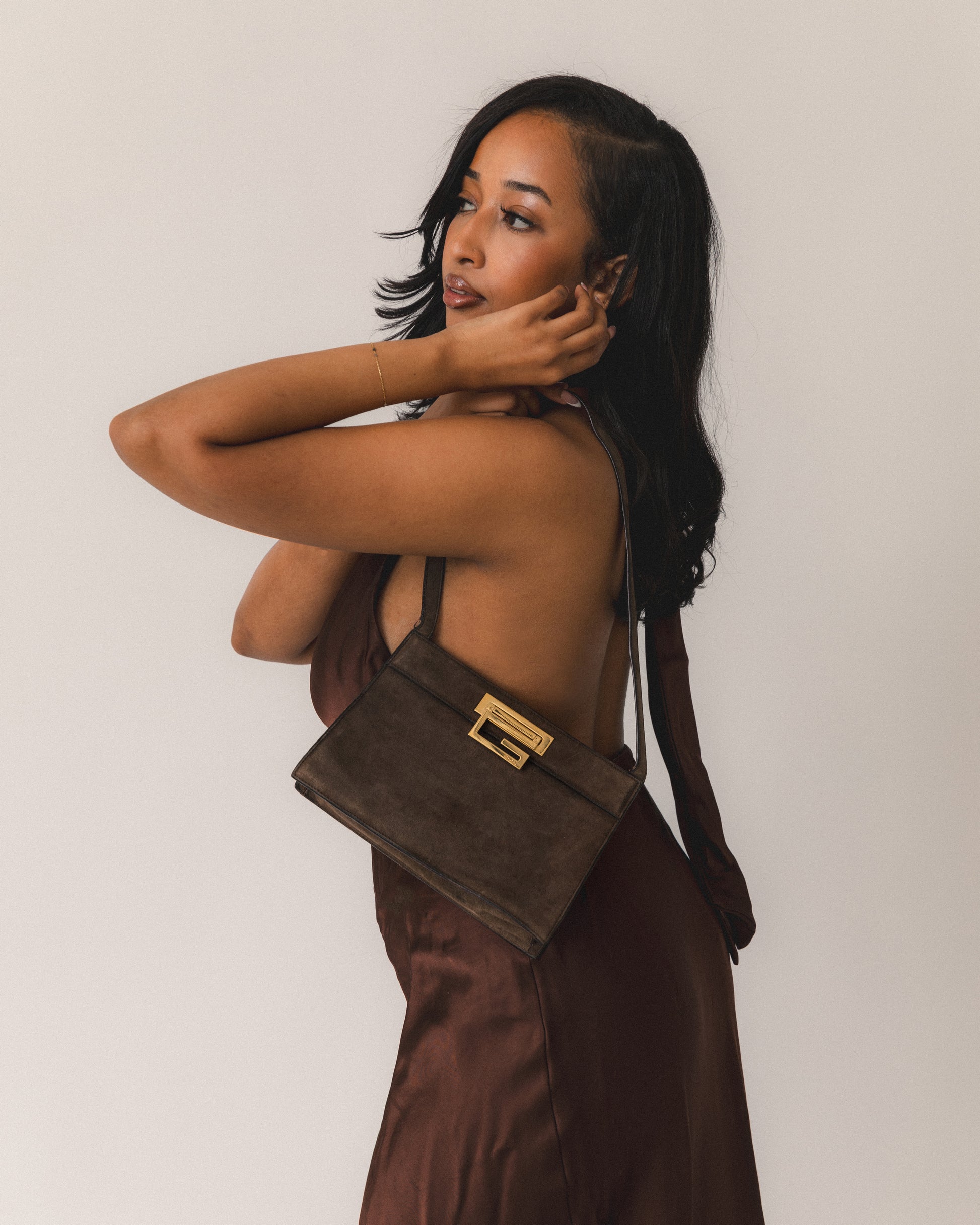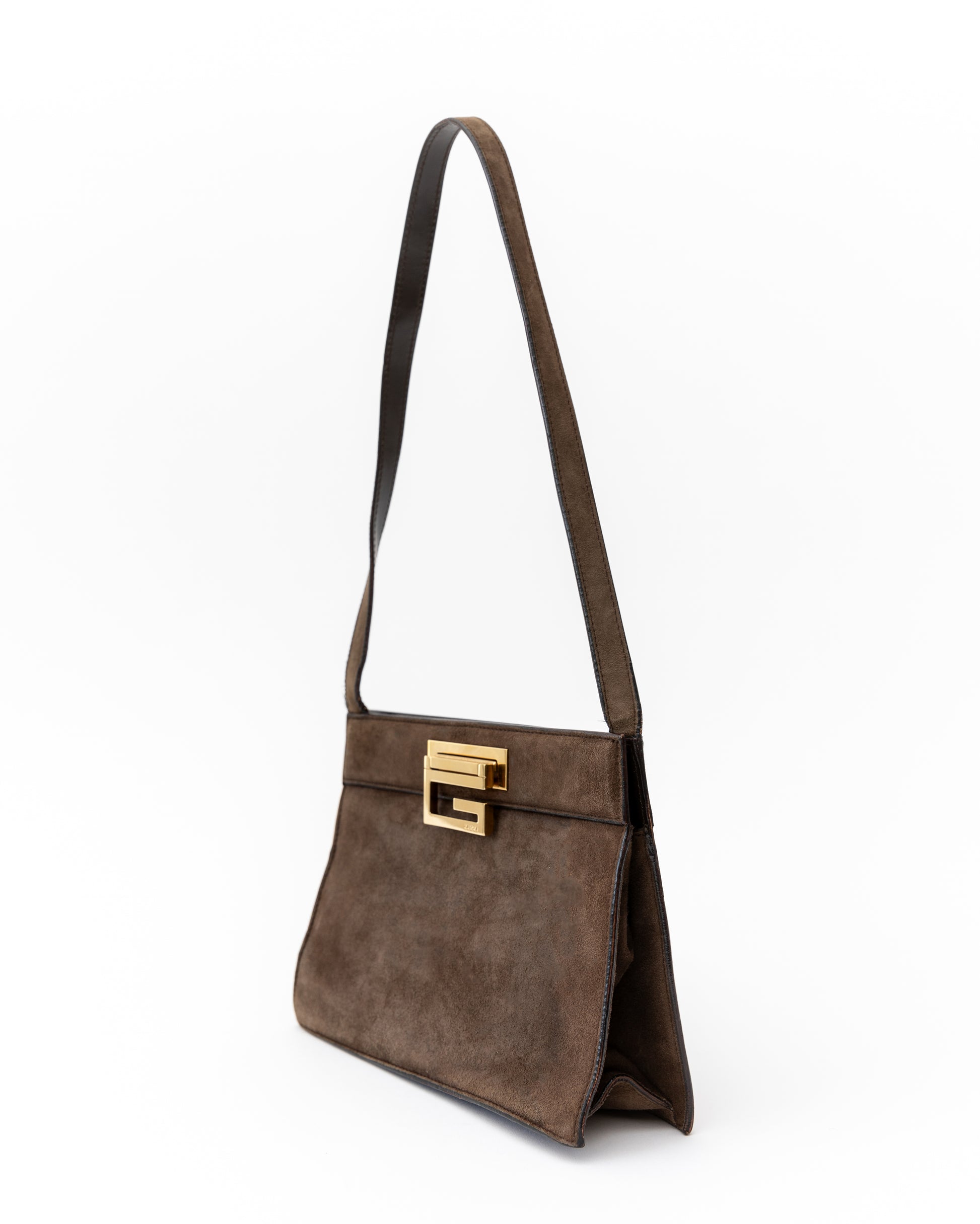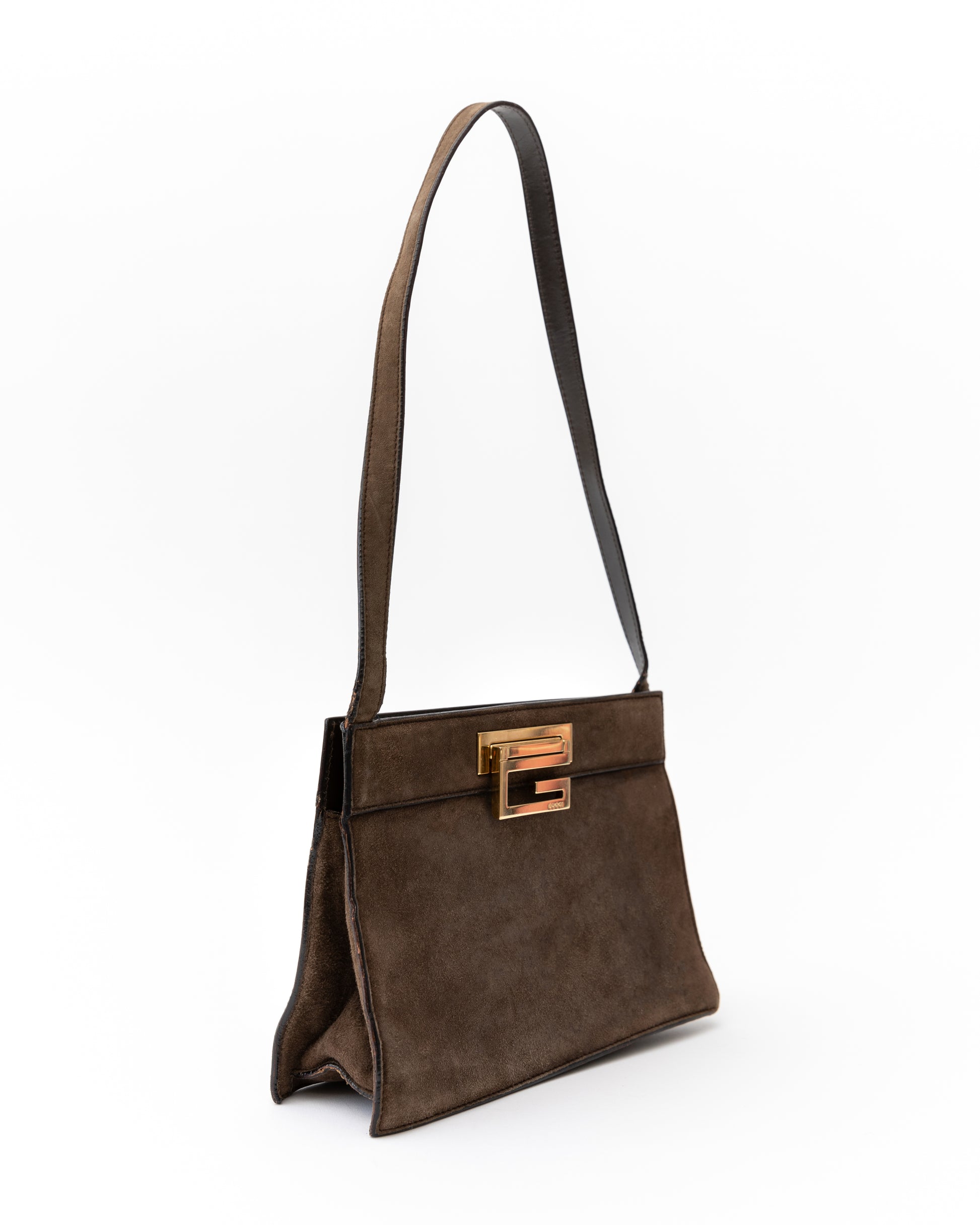 - Features sleek design with brown suede, iconic G gold logo, and leather shoulder strap.