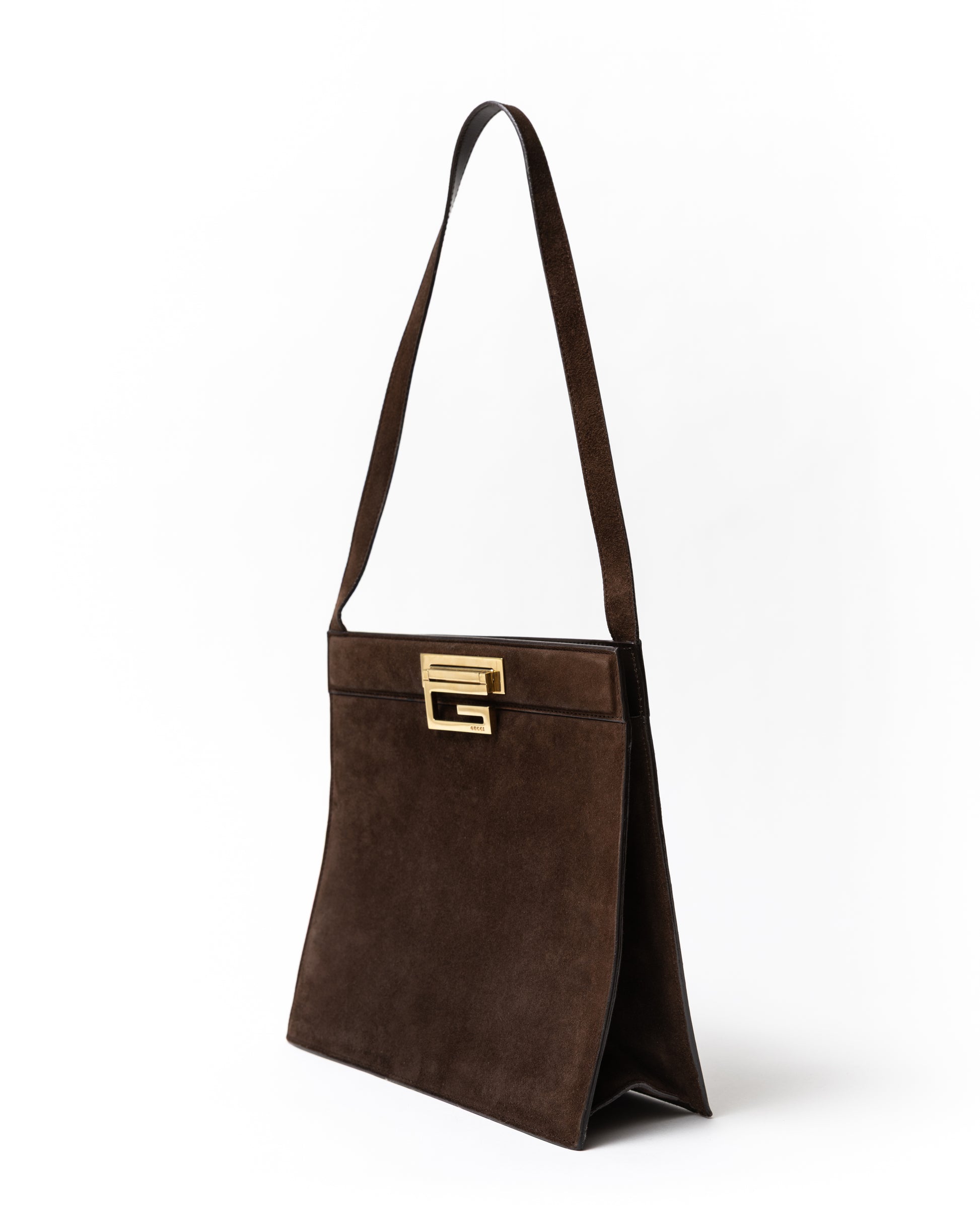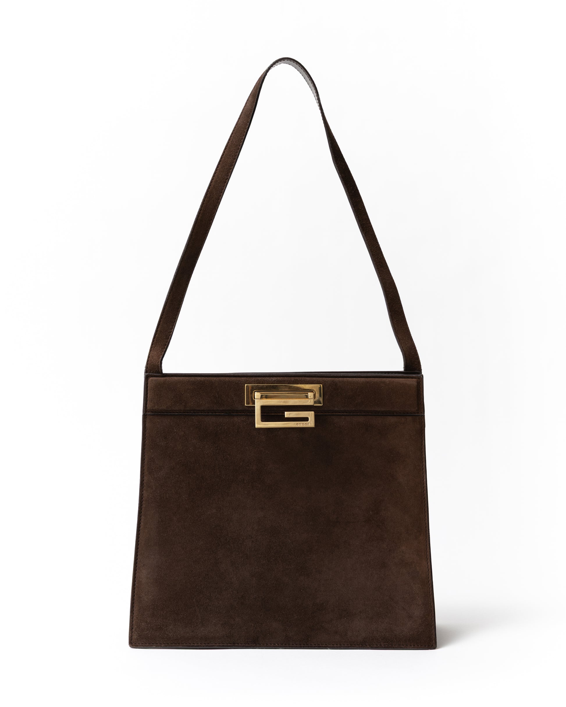 Features sleek design with brown suede, iconic G gold logo, and leather shoulder strap.