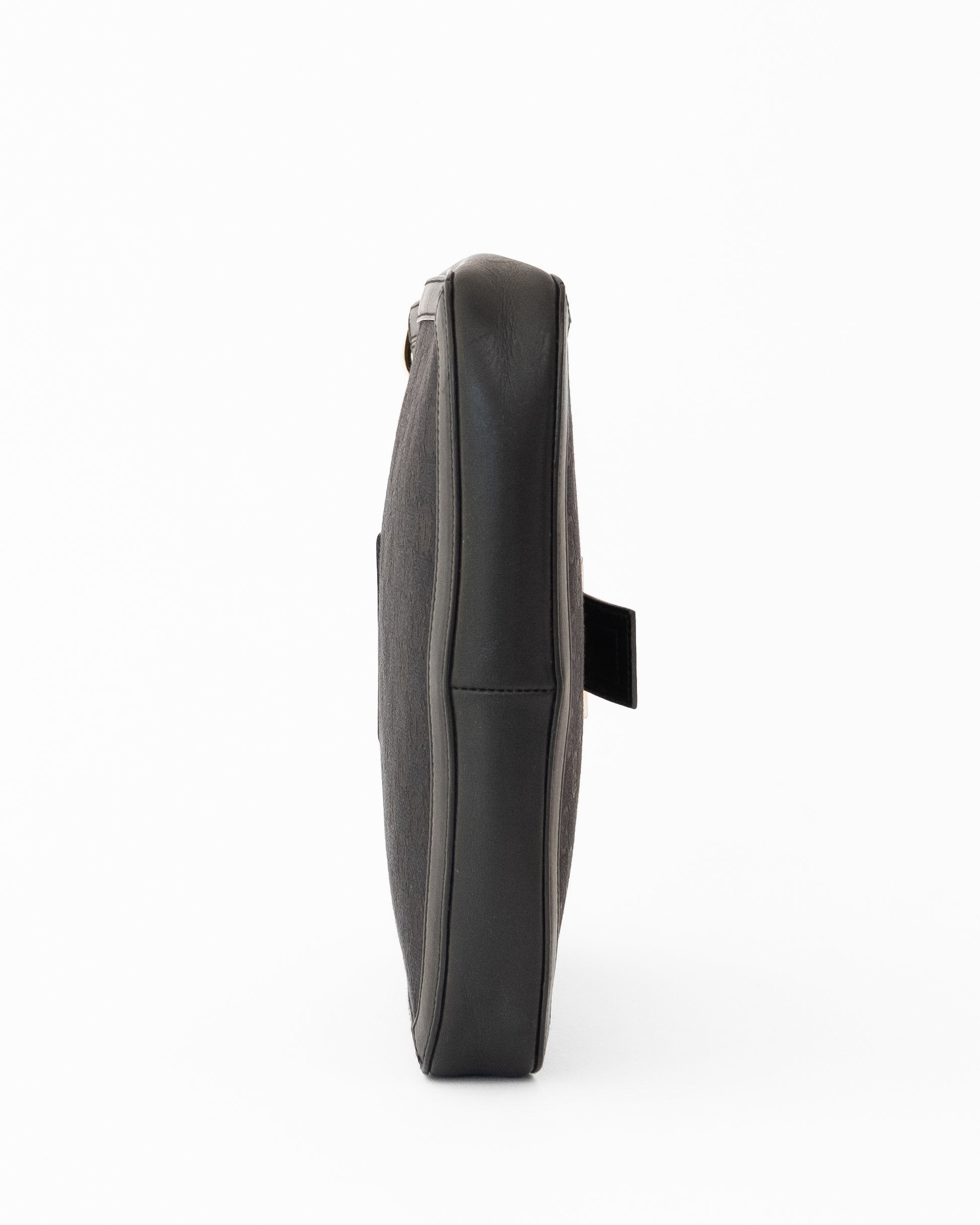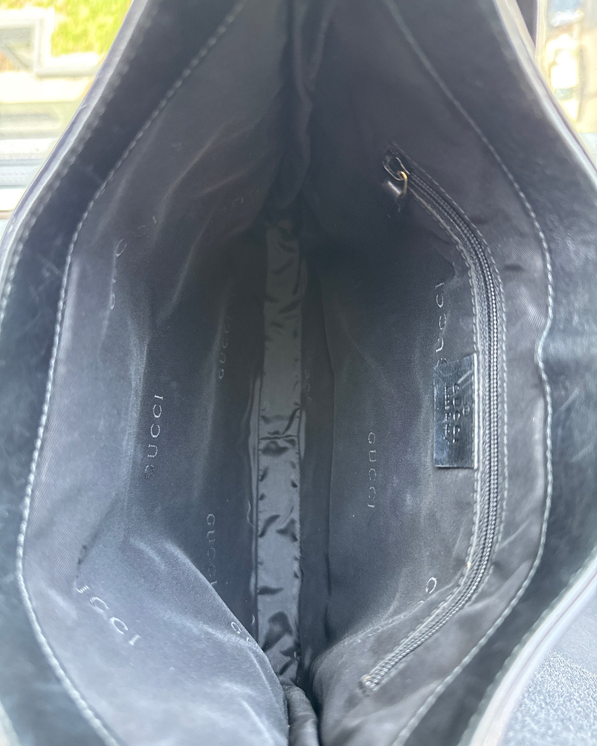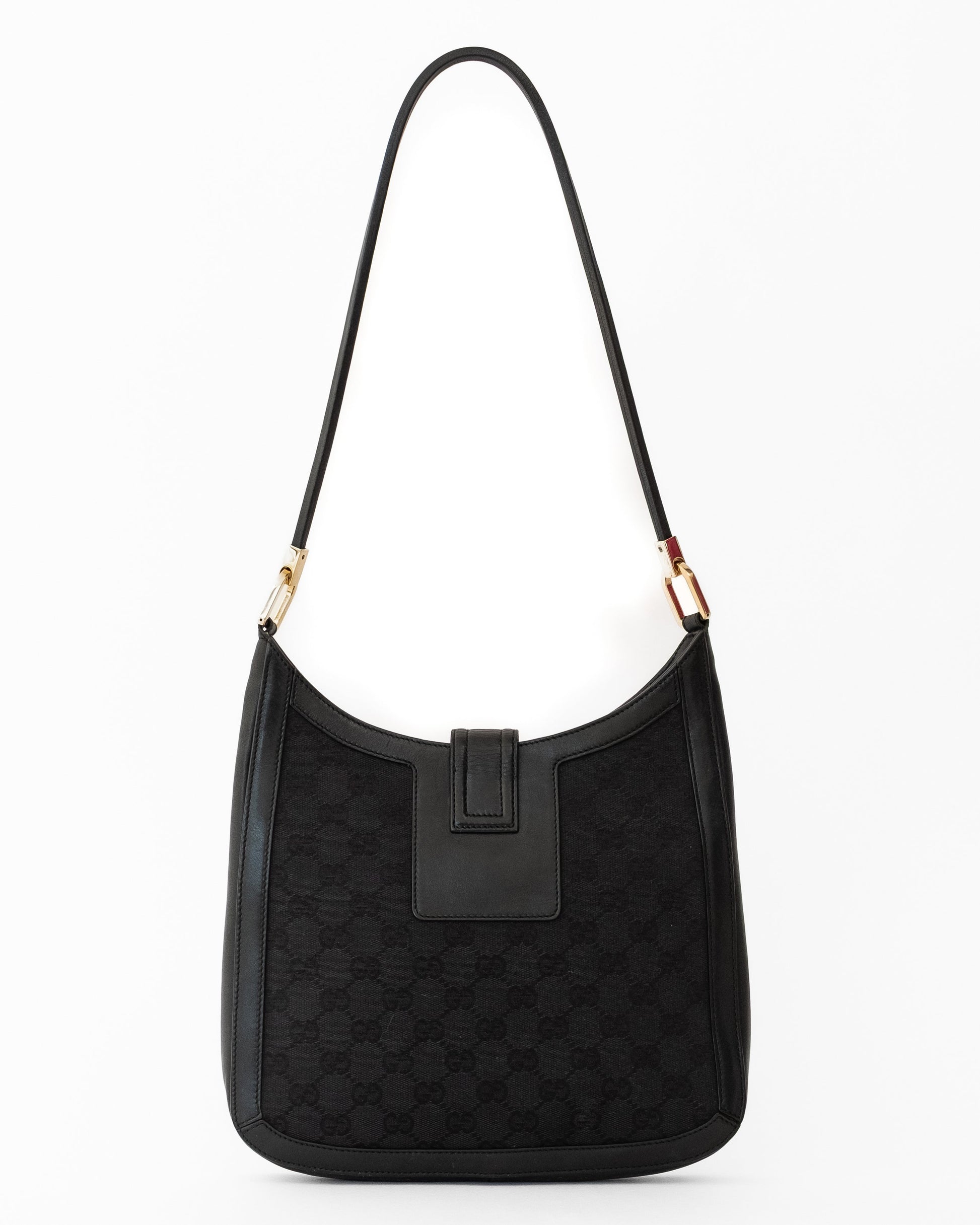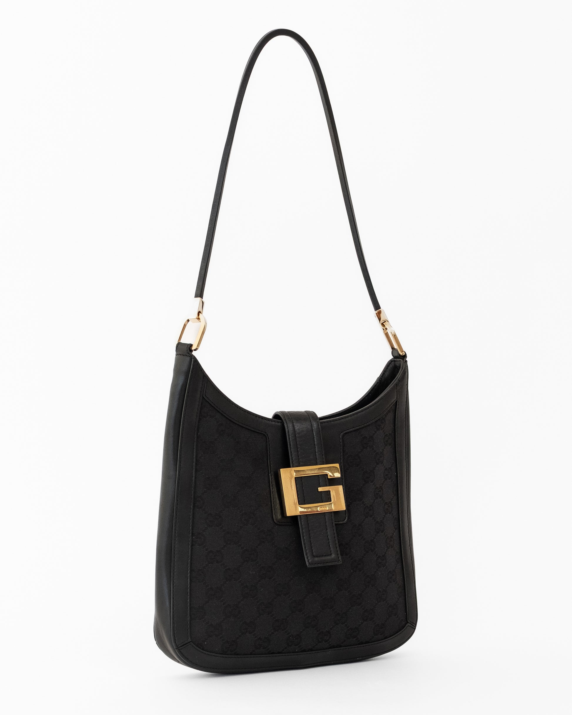 Features a black Gucci monogram canvas with black leather trimming, gold hardware, a thin leather strap, and an iconic G snap-closure on the front.