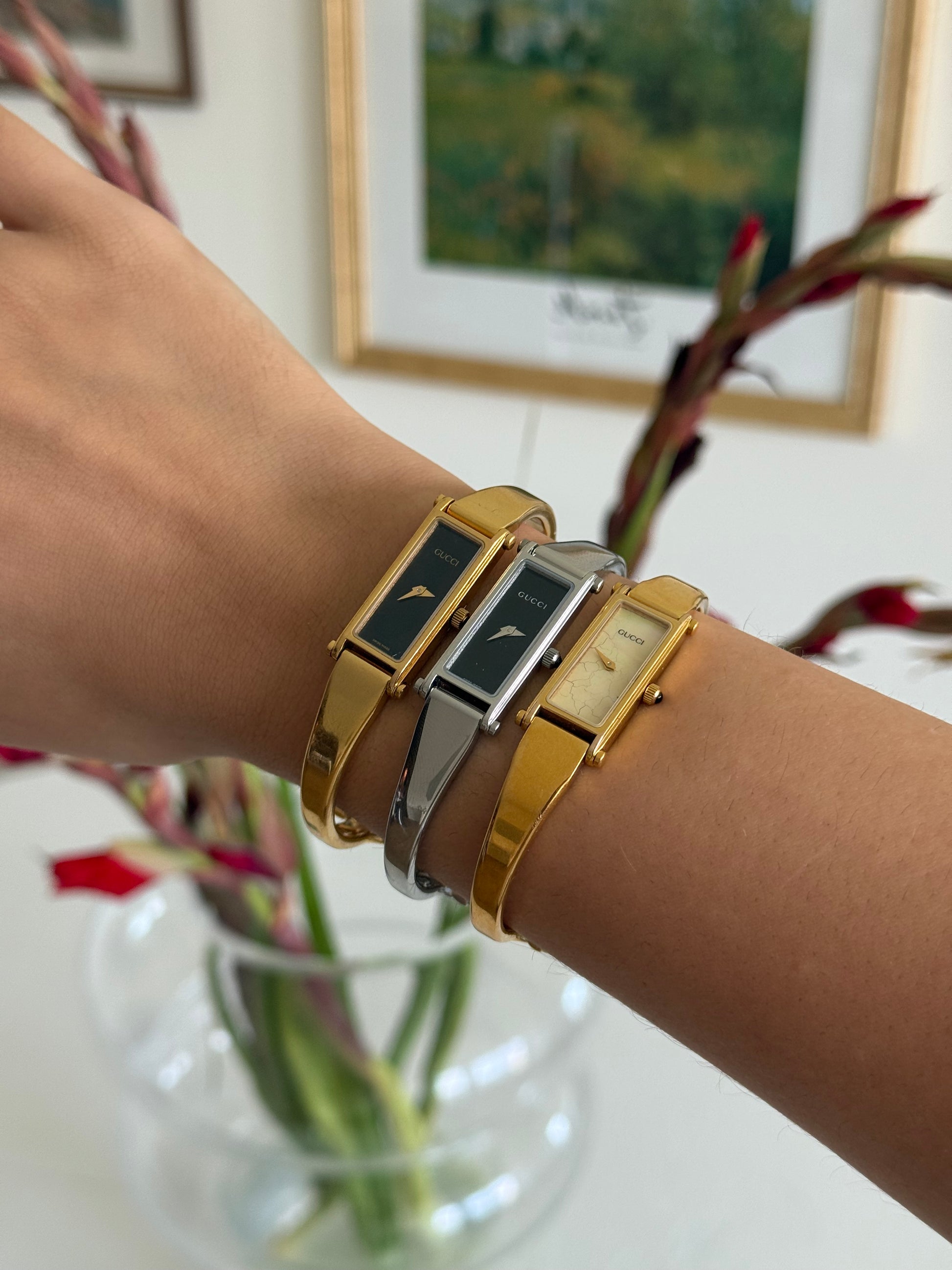 The iconic Tom Ford for Gucci era Gucci horsebit watch. She’s the perfect dainty accessory that will match with all your outfits. Features a gold band (approx 6") with an iconic horsebit clasp.