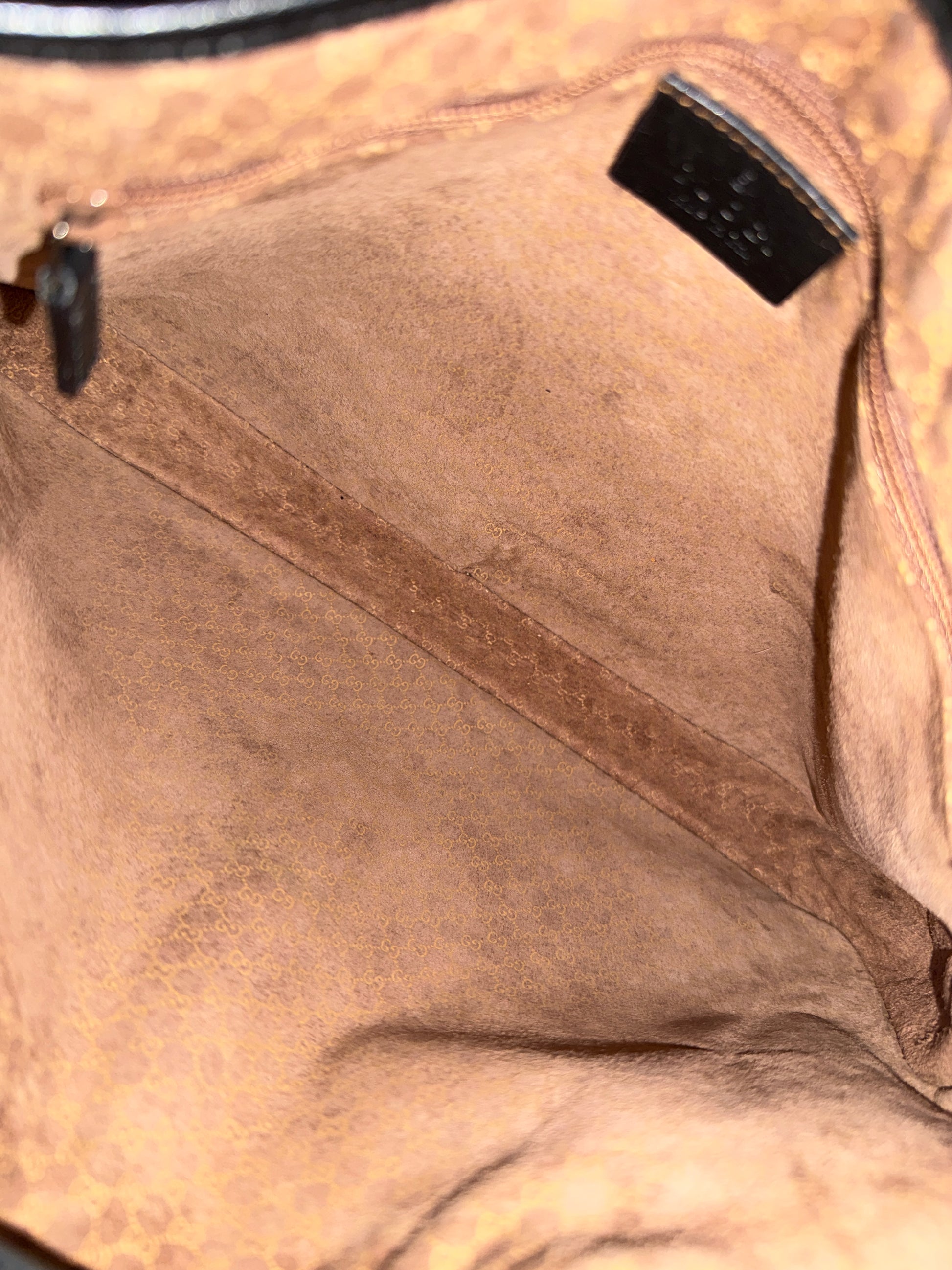 Sleek black leather with Gucci monogram canvas and silver hardware. Comes with the iconic Gucci Jackie clasp on the front.