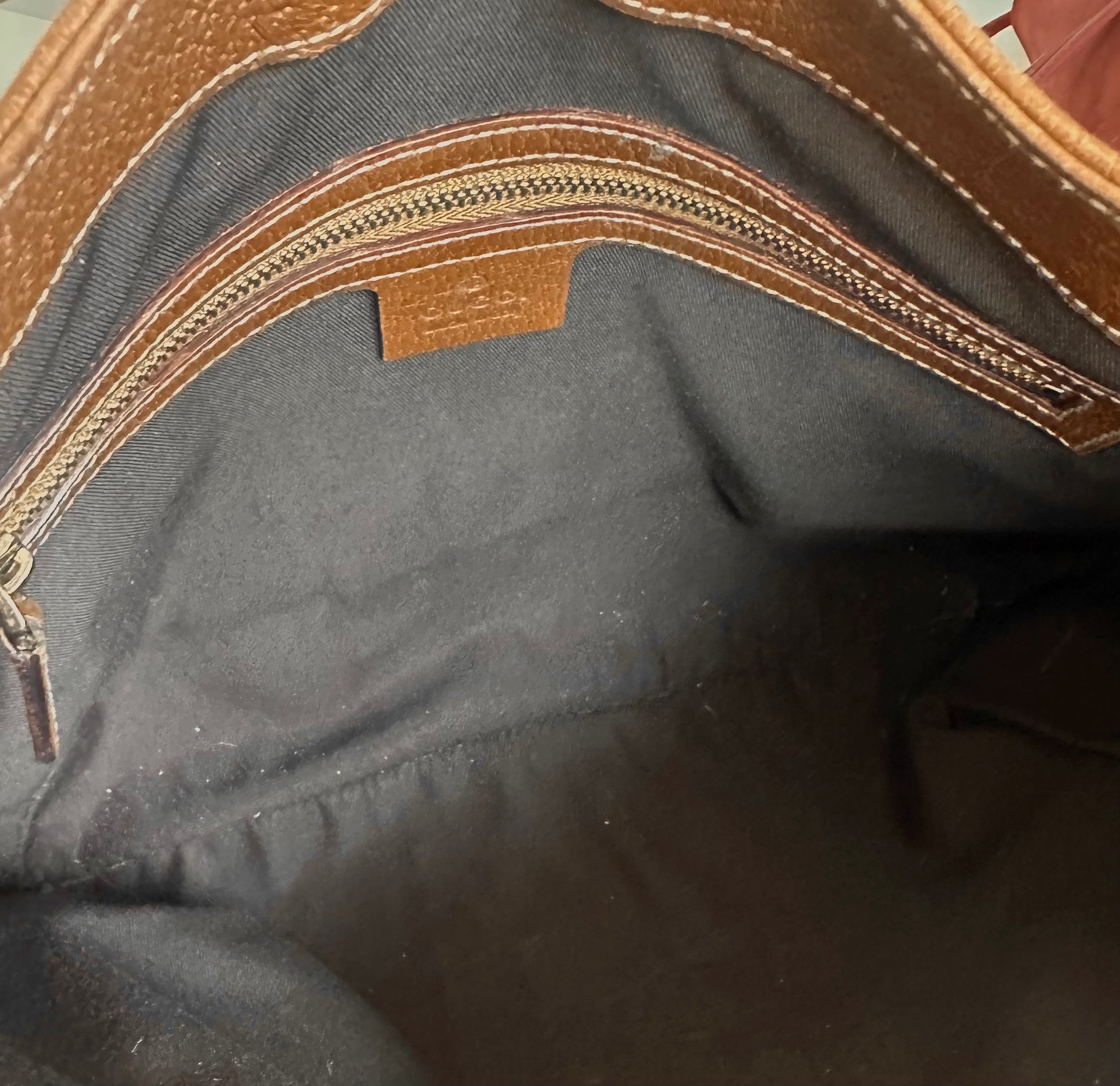 - Very spacious black fabric interior with zippered pocket is in excellent condition.