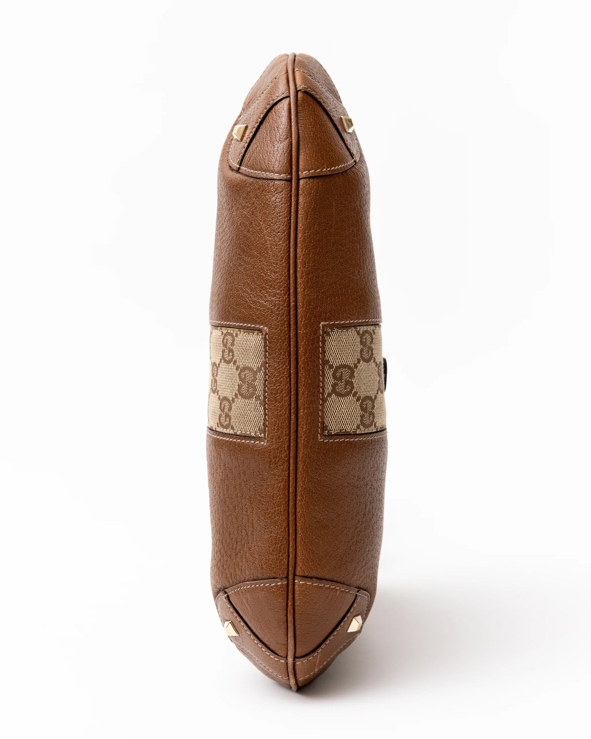 - Brown pebbled leather with Gucci monogram canvas and gold hardware. Has the iconic Gucci Jackie clasp on the front.