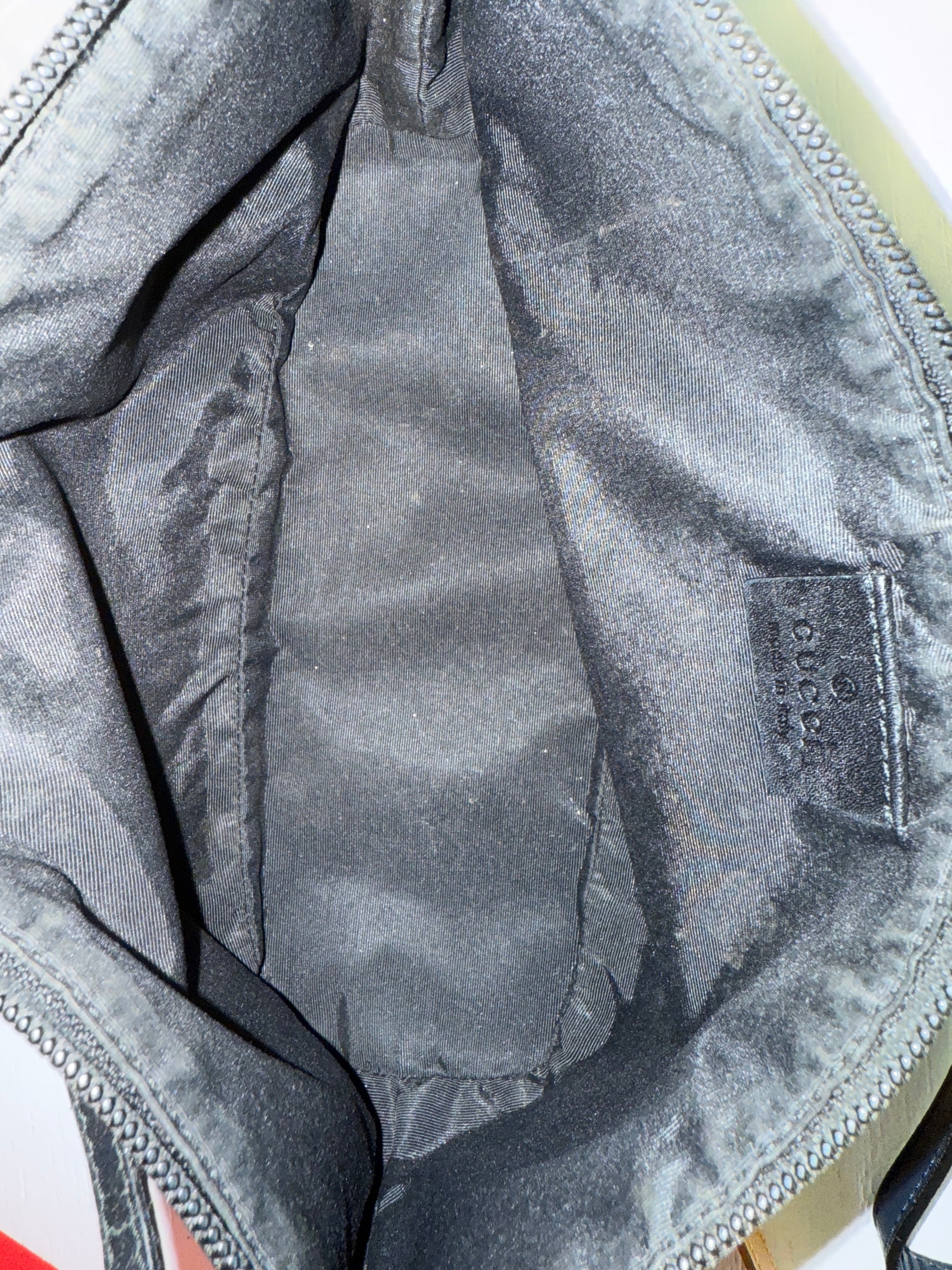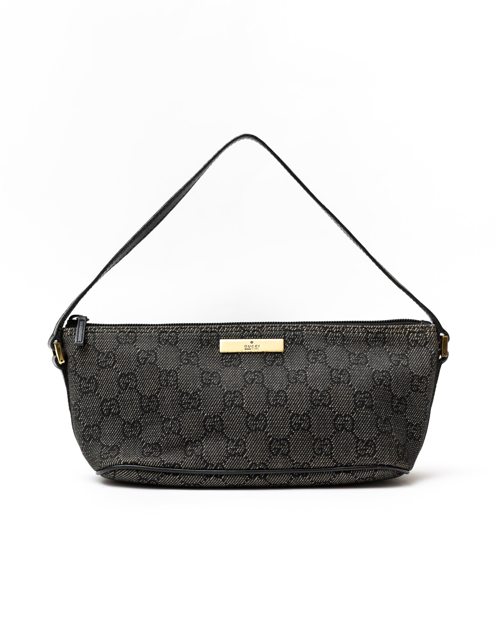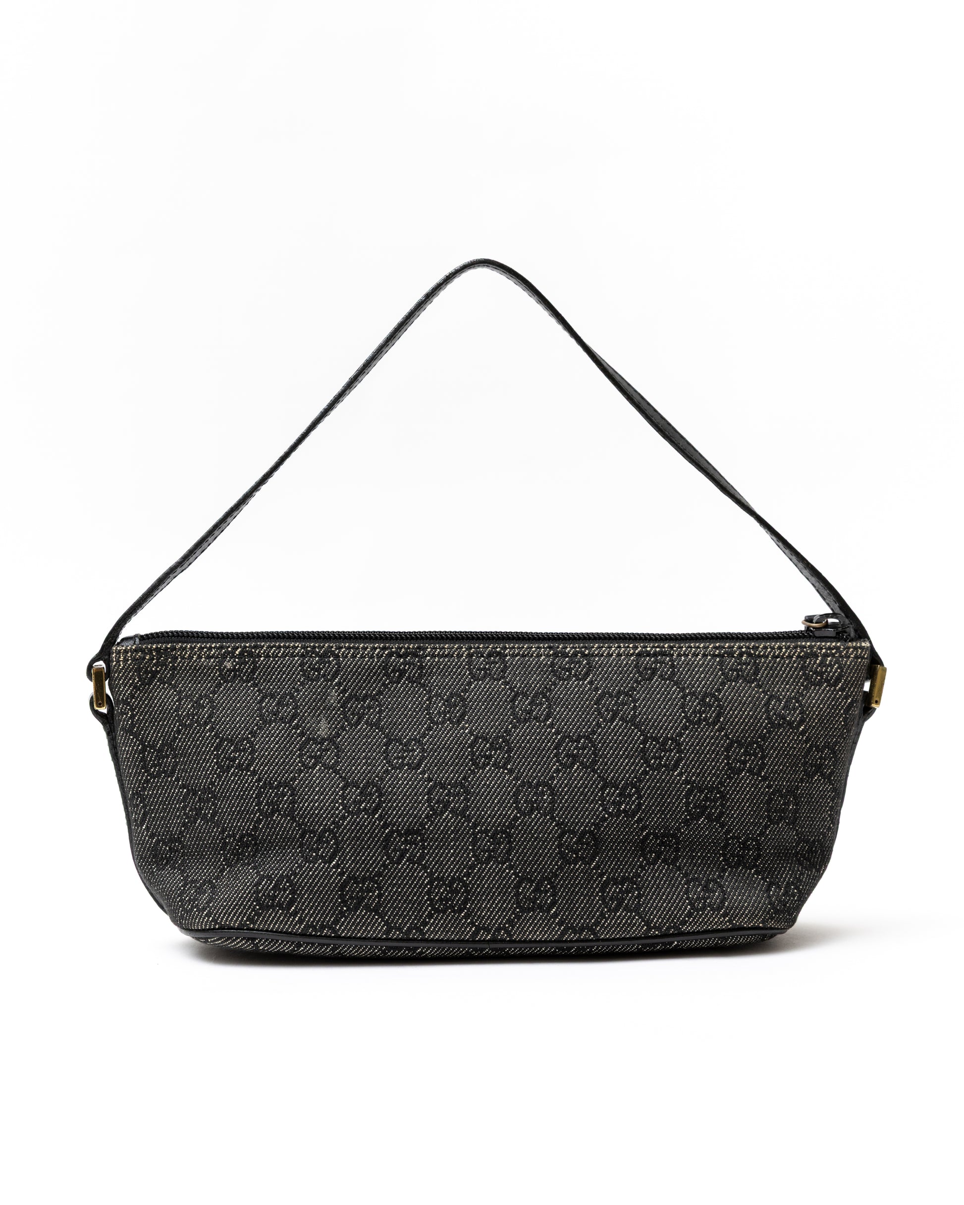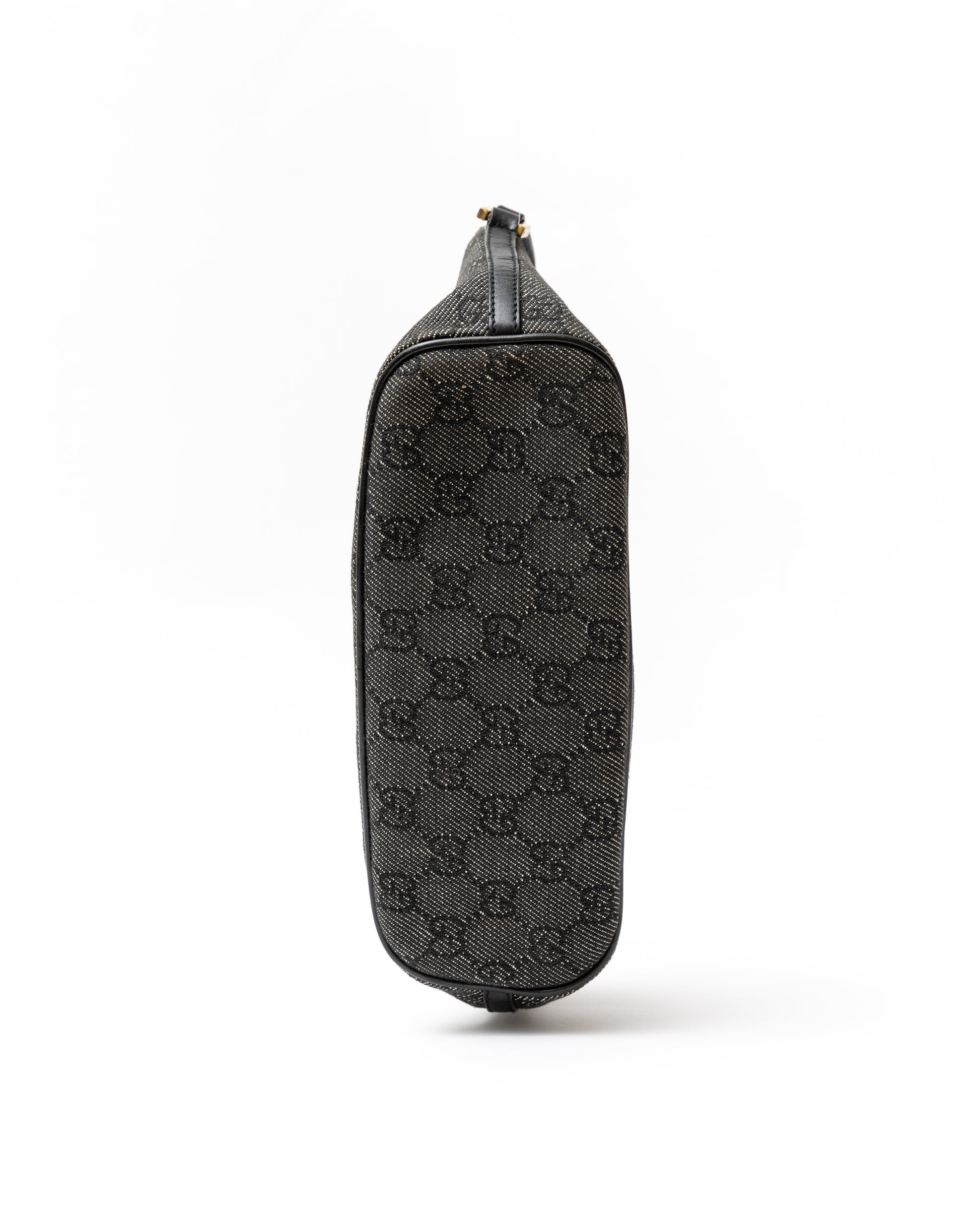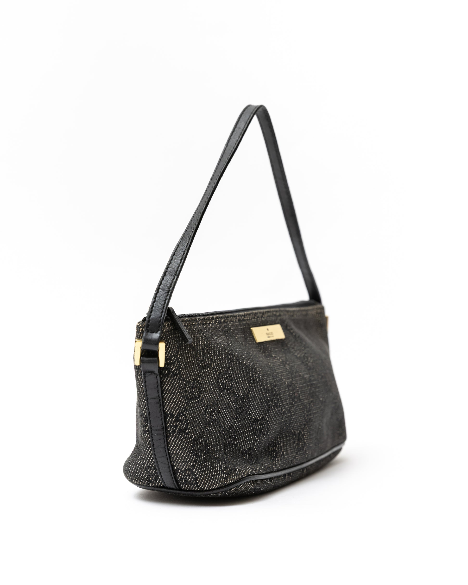 - Black denim monogram canvas with gold hardware and black leather strap.