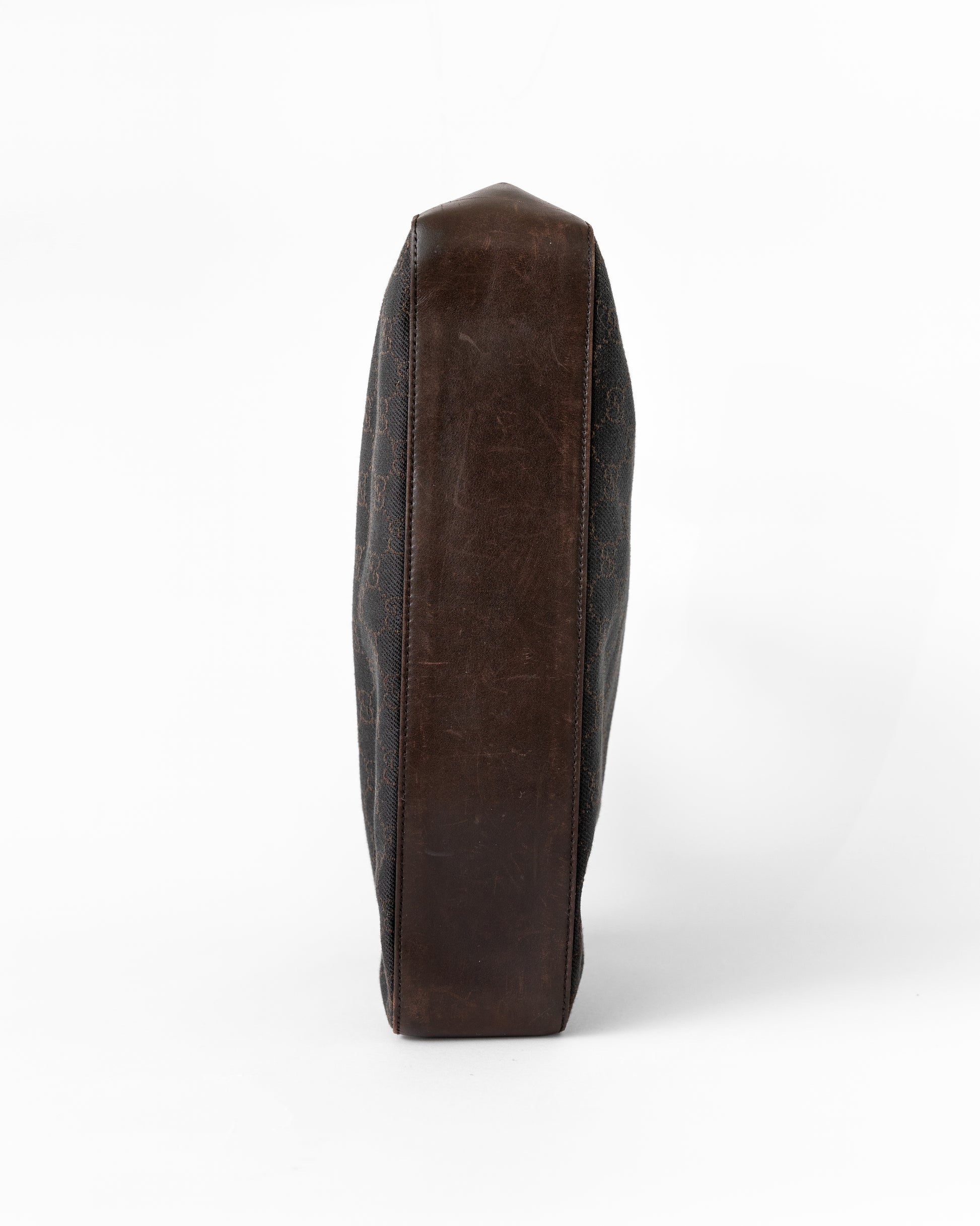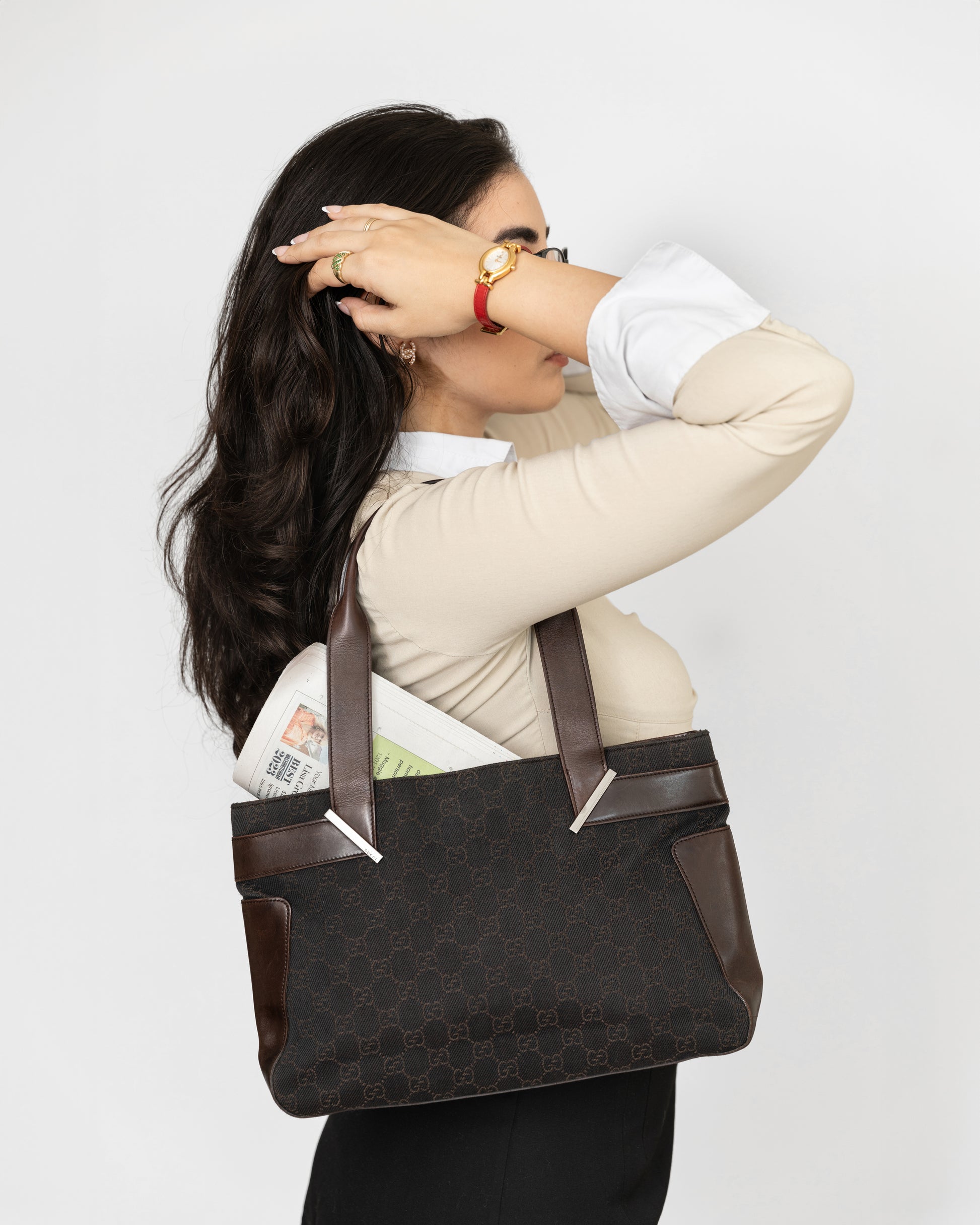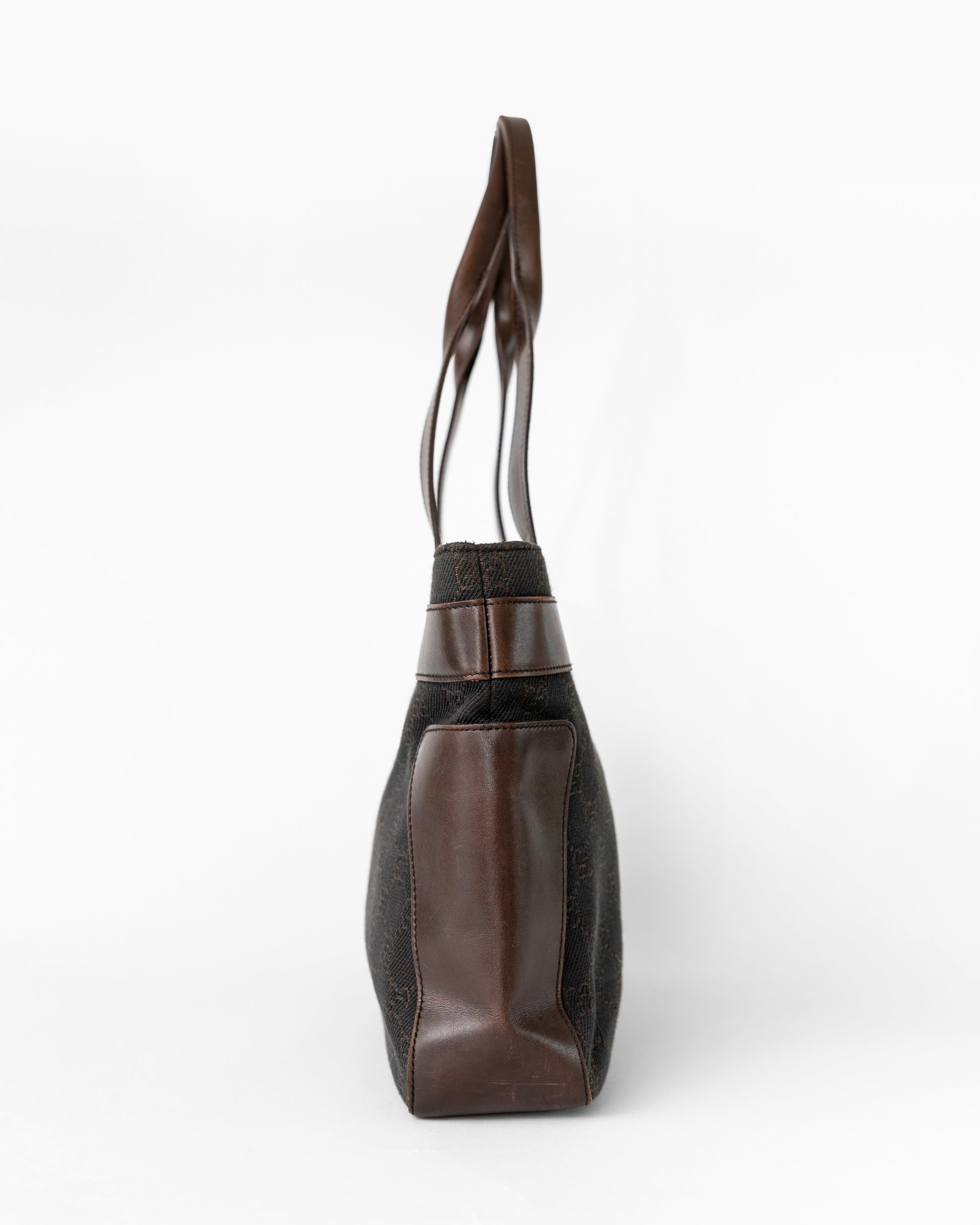 - Brown and black monogram canvas with brown leather trimming and shoulder straps.