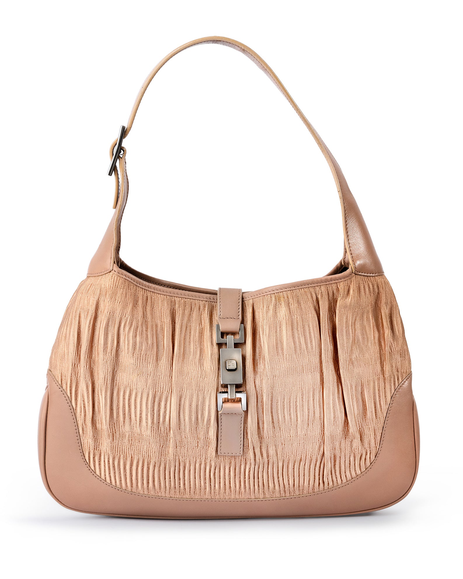 A Tom Ford for Gucci era bag from the late 1990s - this Gucci Jackie features pink pleated satin, pink leather trim, and gold hardware. Perfect for spring!