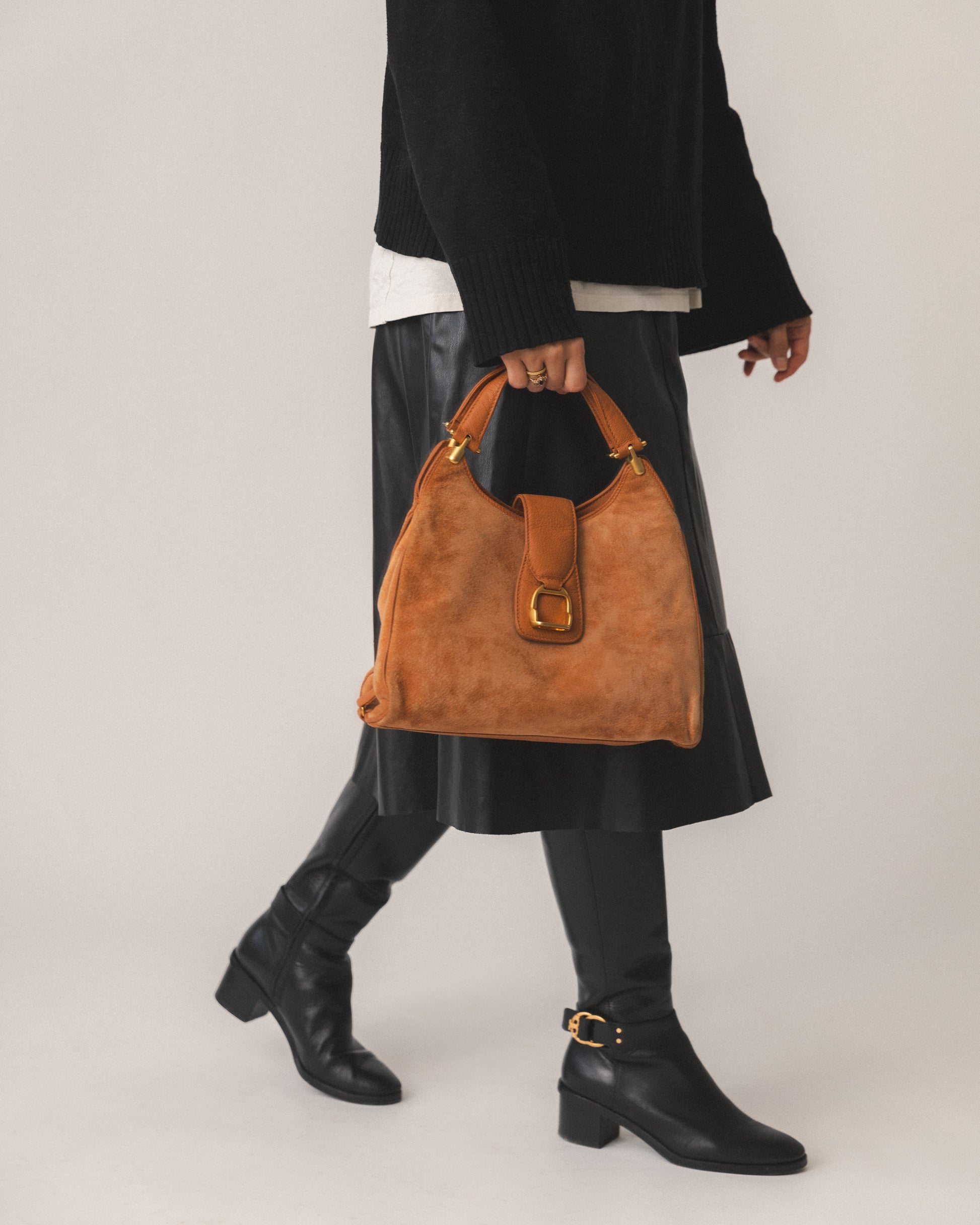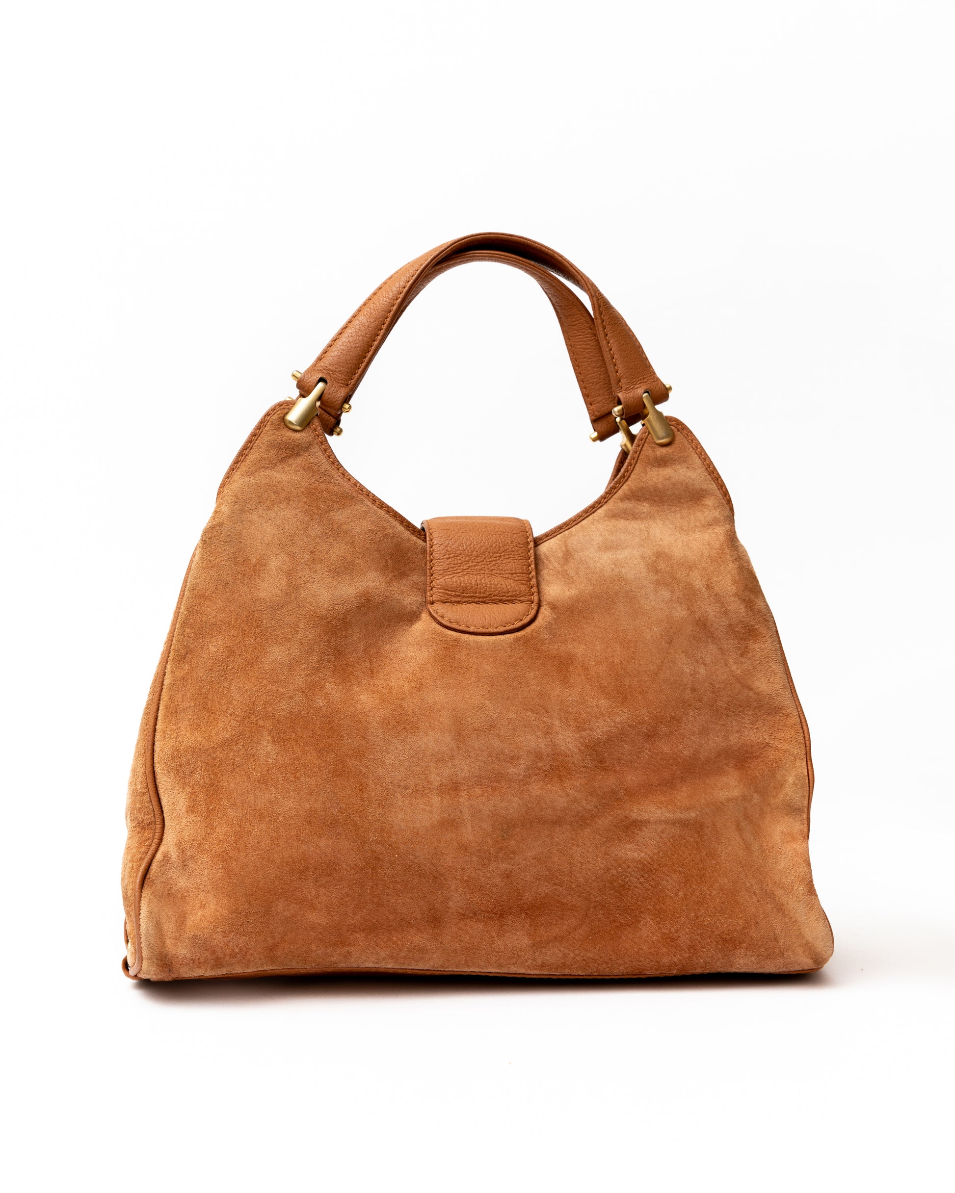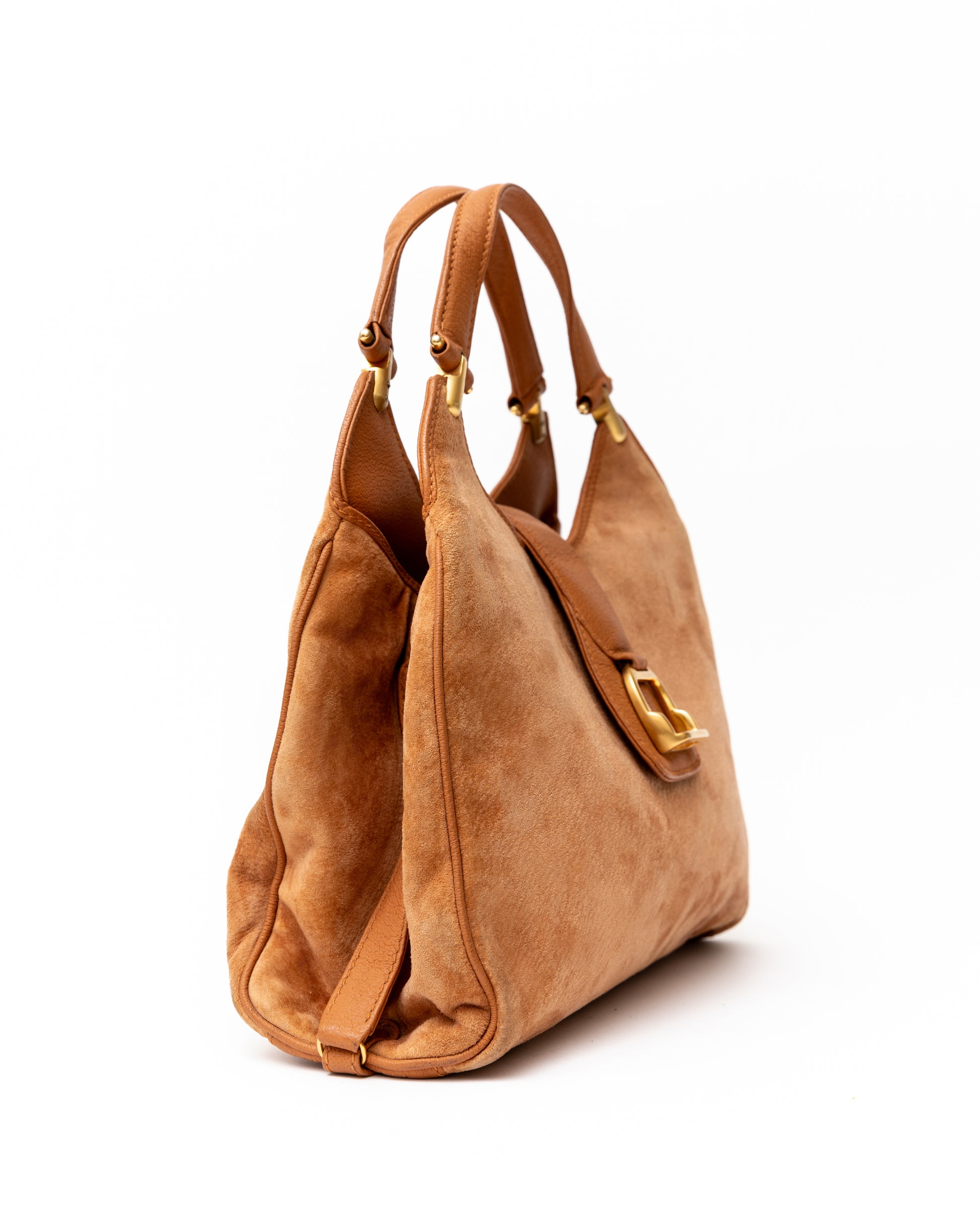 - Smooth tan suede and leather detailing on this iconic Gucci bag from the 90s. Features gold accents and 2 leather handles.