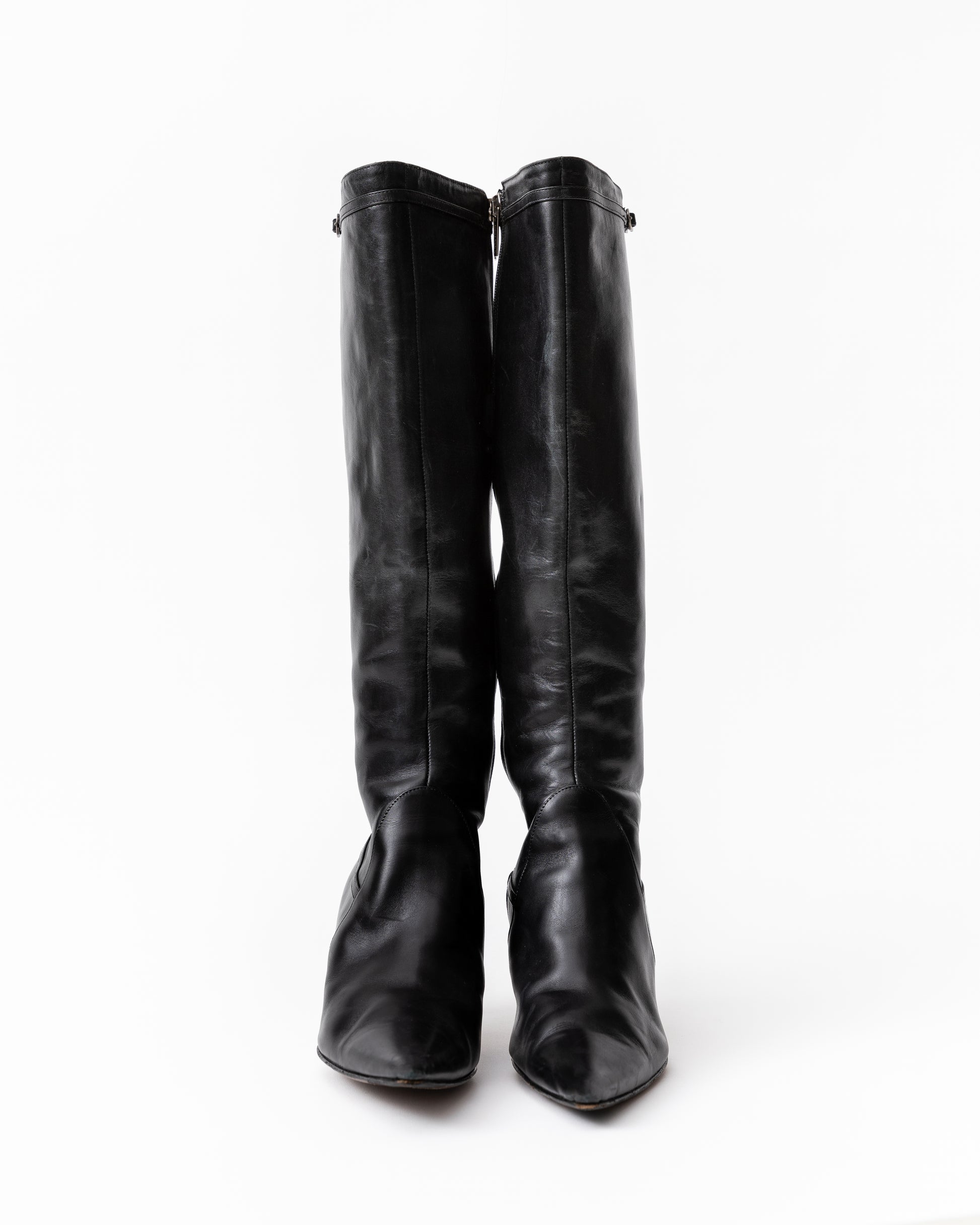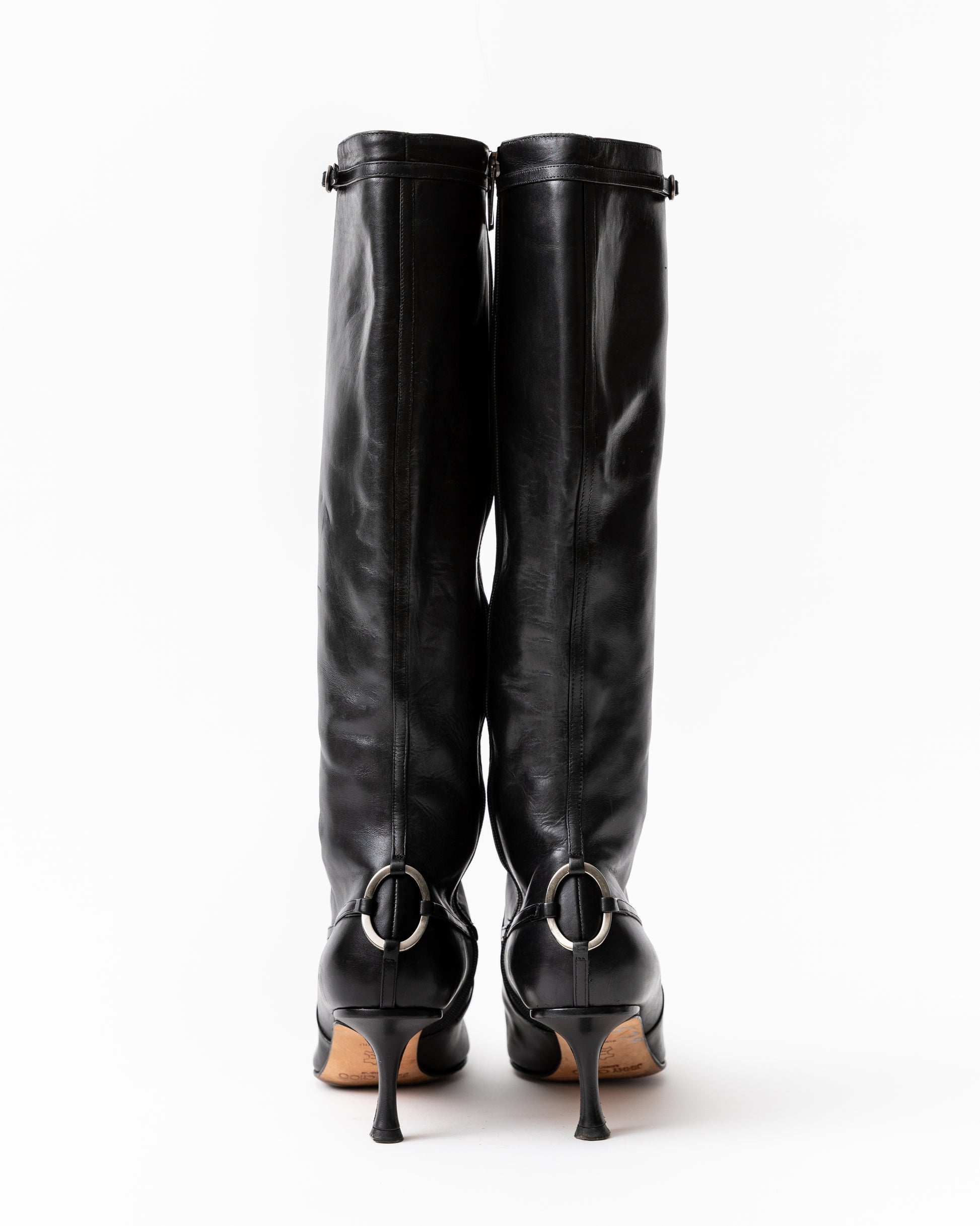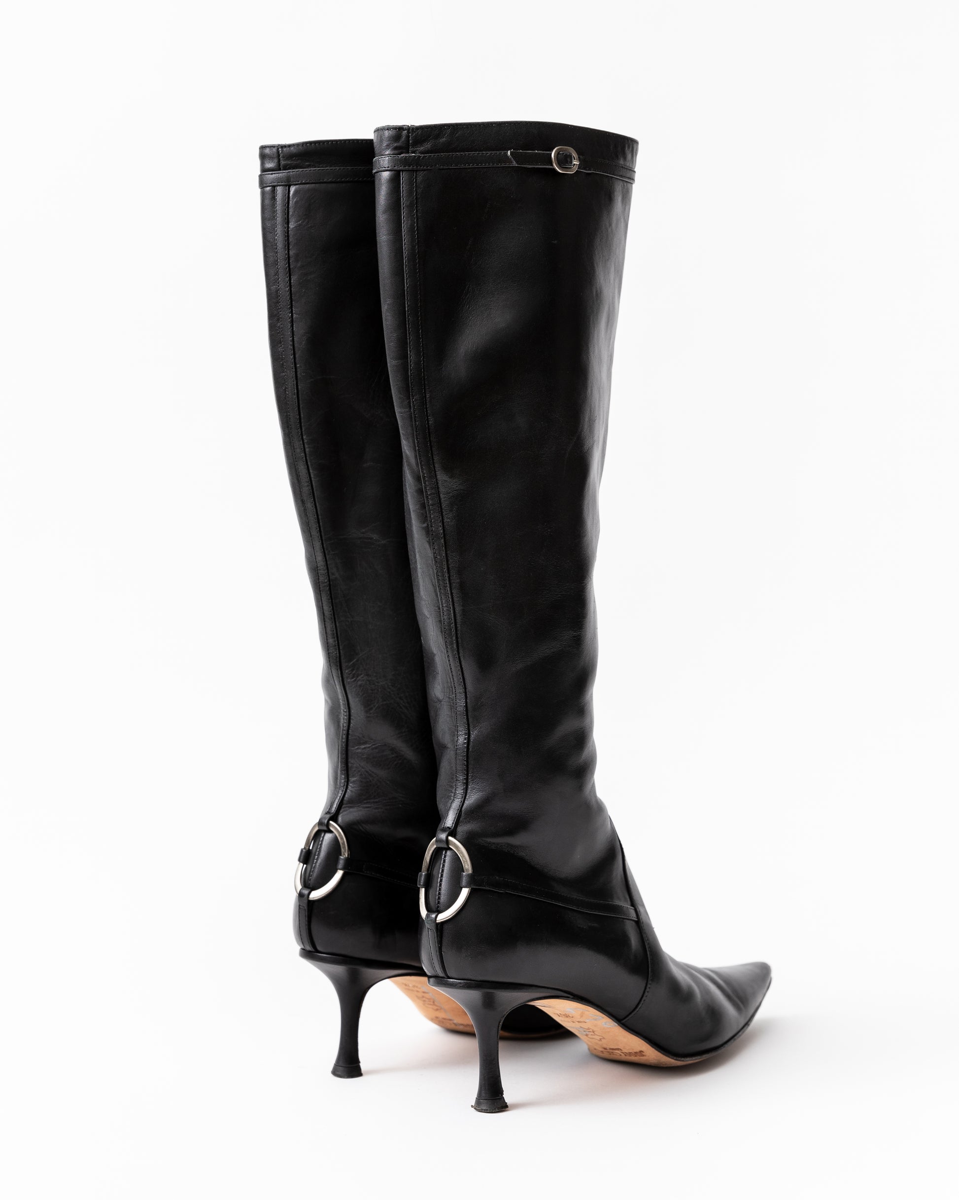 - These boots feature a pointed toe, and siver buckle on the back of the boots.