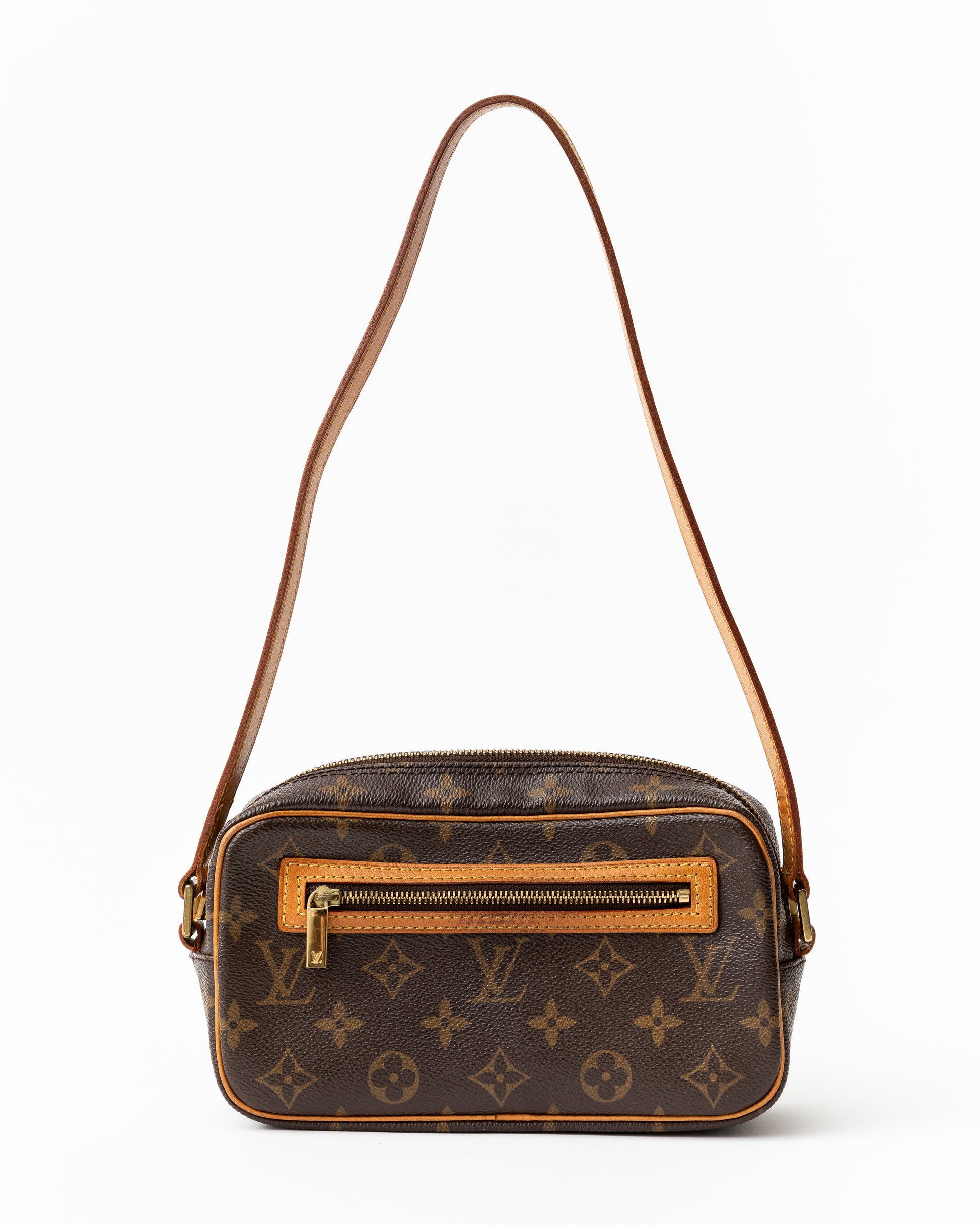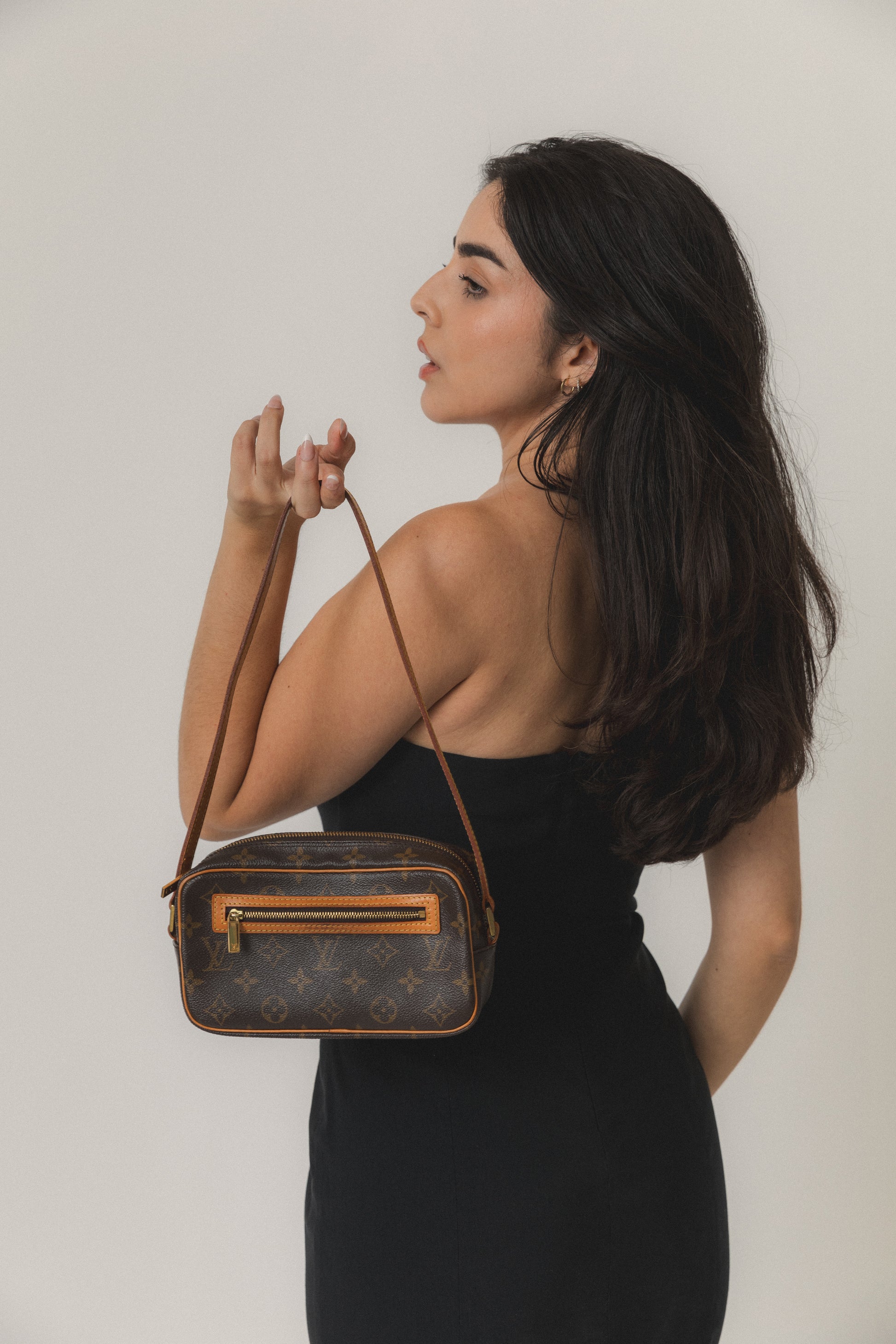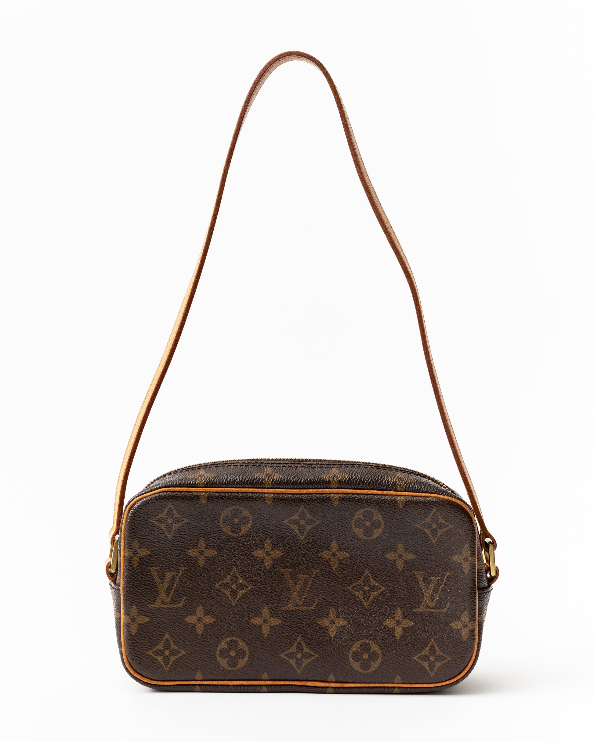 - This rare Louis Vuitton pochette features the classic Louis Vuitton monogram canvas, light honey vachetta shoulder strap, exterior zippered pocket, and a spacious leather interior which fits all the essentials.