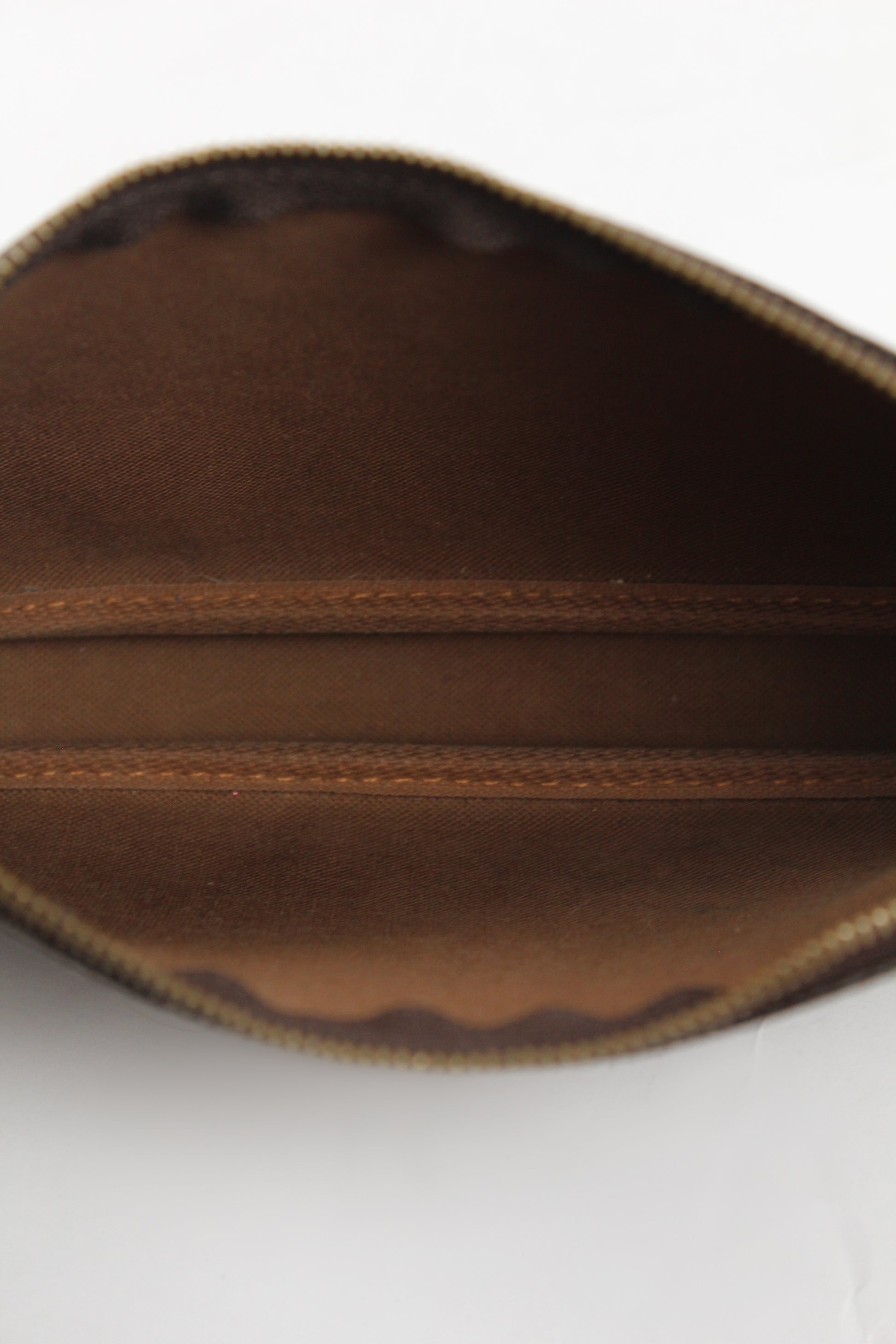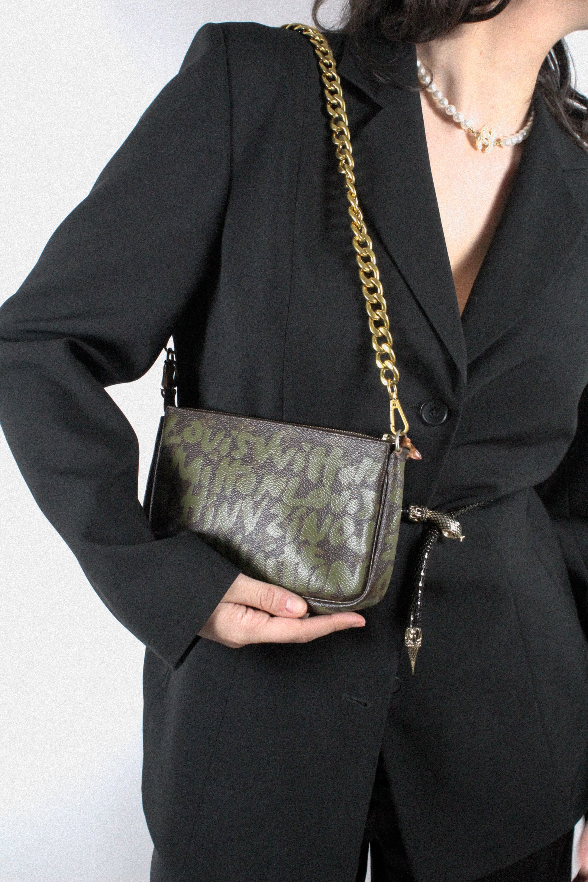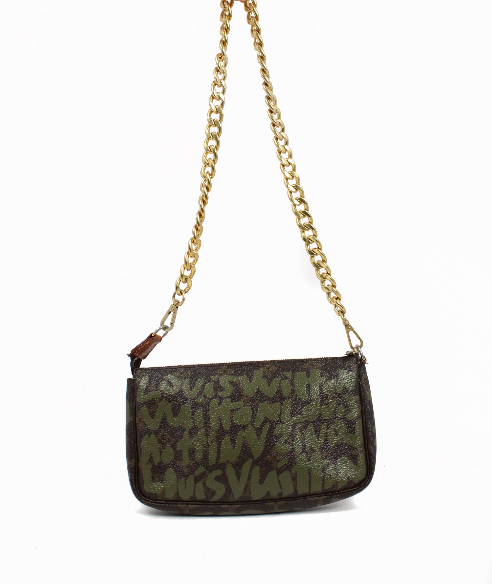 - Louis Vuitton monogram canvas with caramel vachetta strap and an added non-branded chain to wear as a shoulder bag.