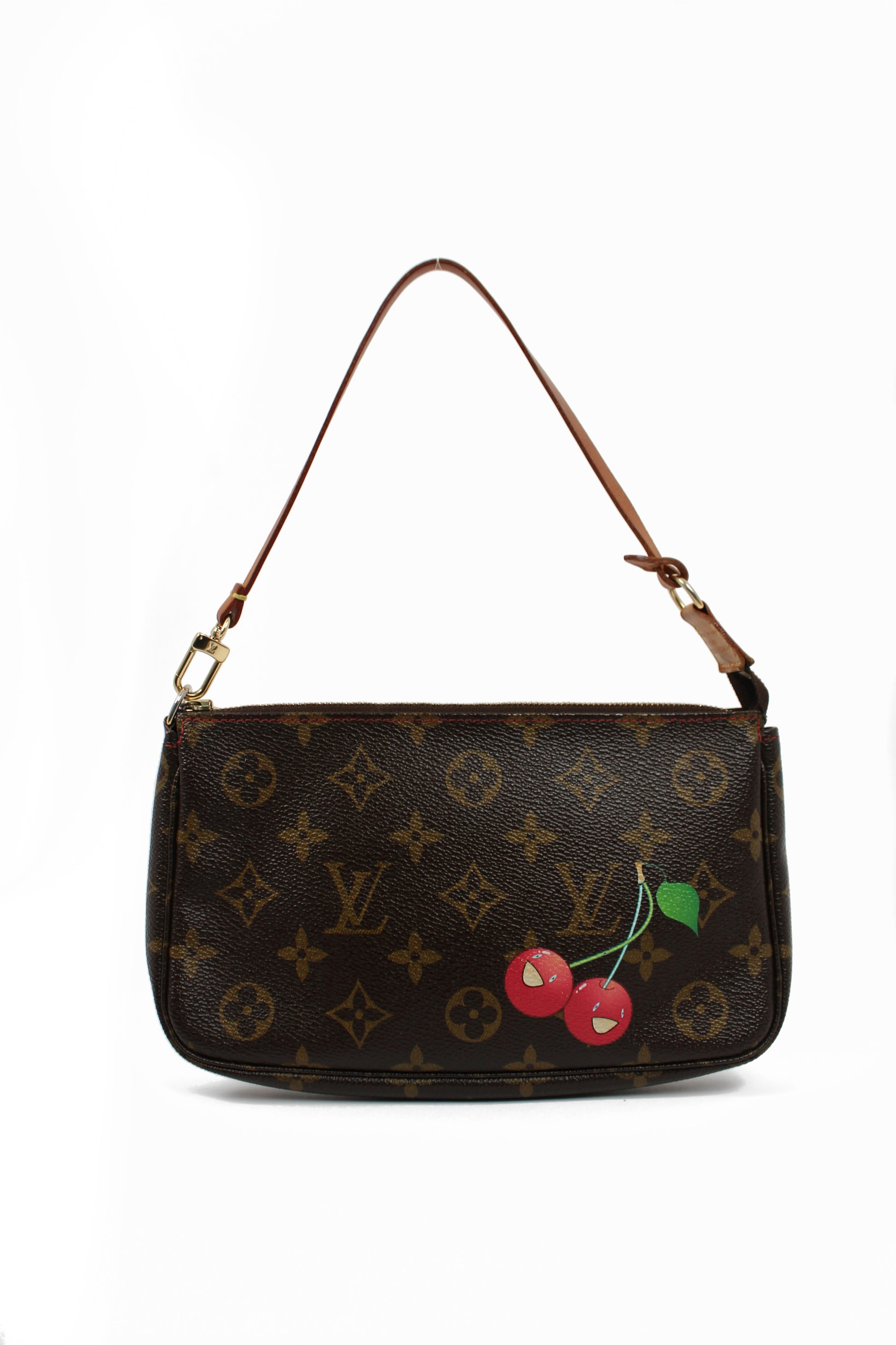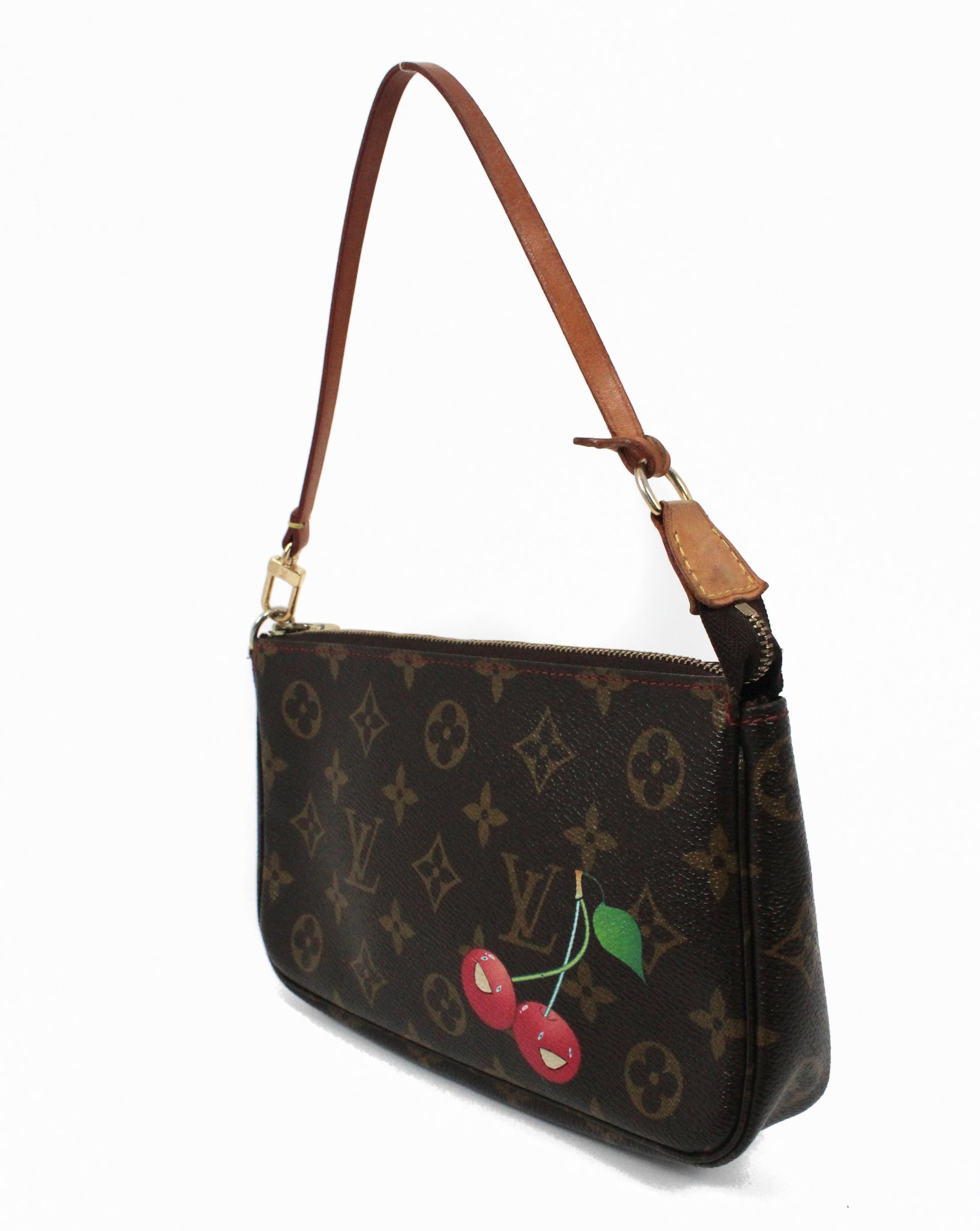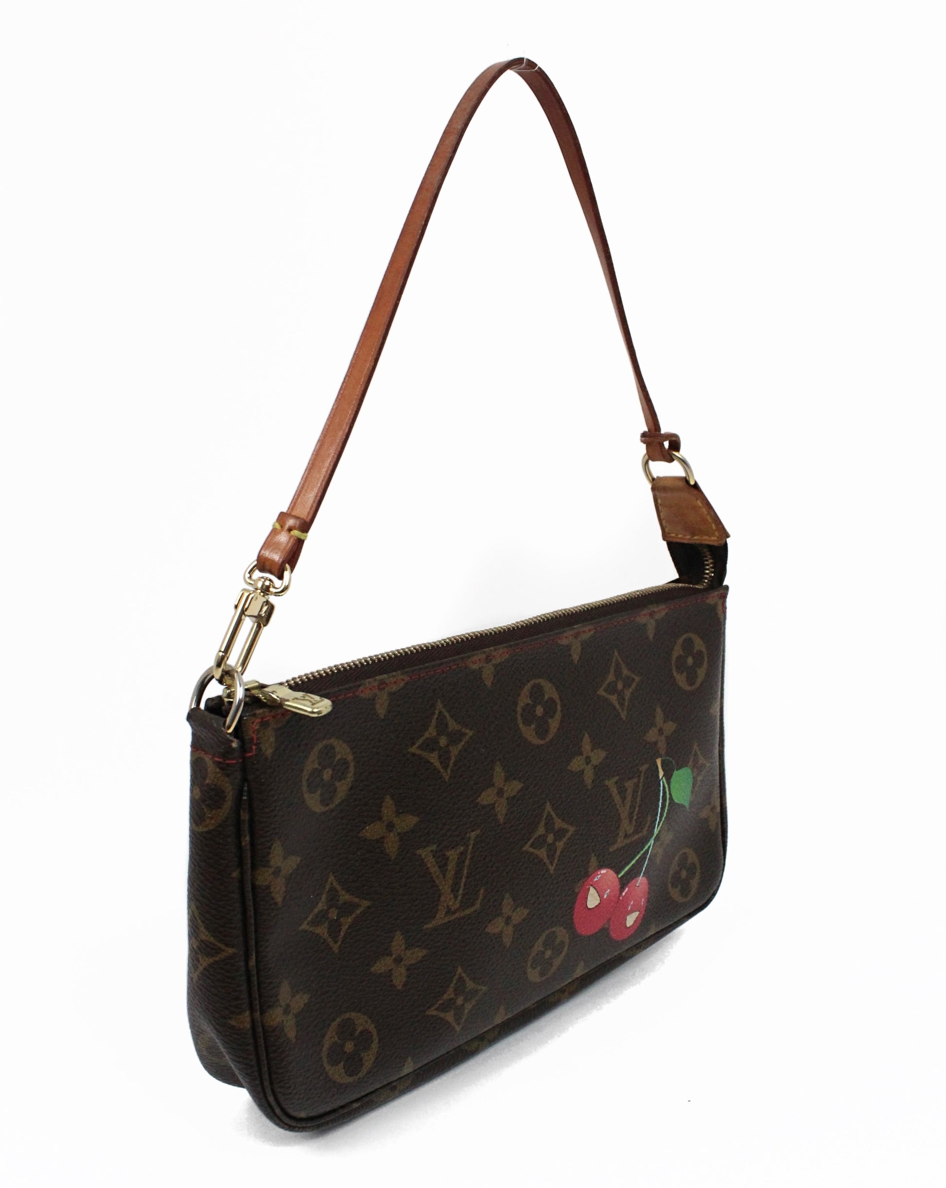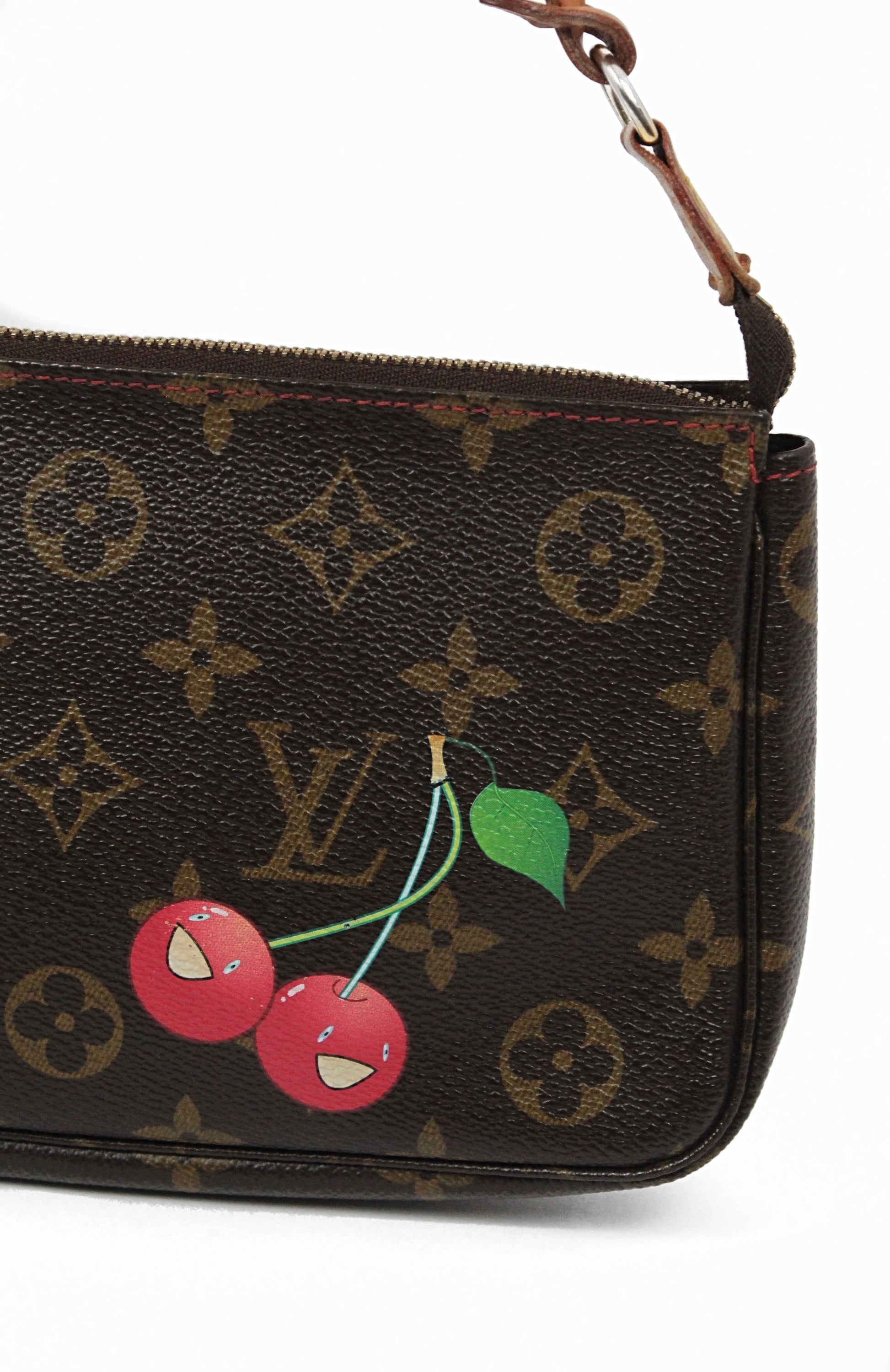 - The limited edition Louis Vuitton x Takashi Murakami Monogram Cherry Pochette with gold hardware is the perfect bag for everyday use. Original strap included with warm honey vachetta. The pochette features the iconic monogram canvas body, top zip closure, and textile lining. What sets this pochette apart are the two vibrant cherrys featured on the front of the bag! Spacious interior is in excellent shape. You can fit your phone, small wallet, keys, and a few other smaller essentials.