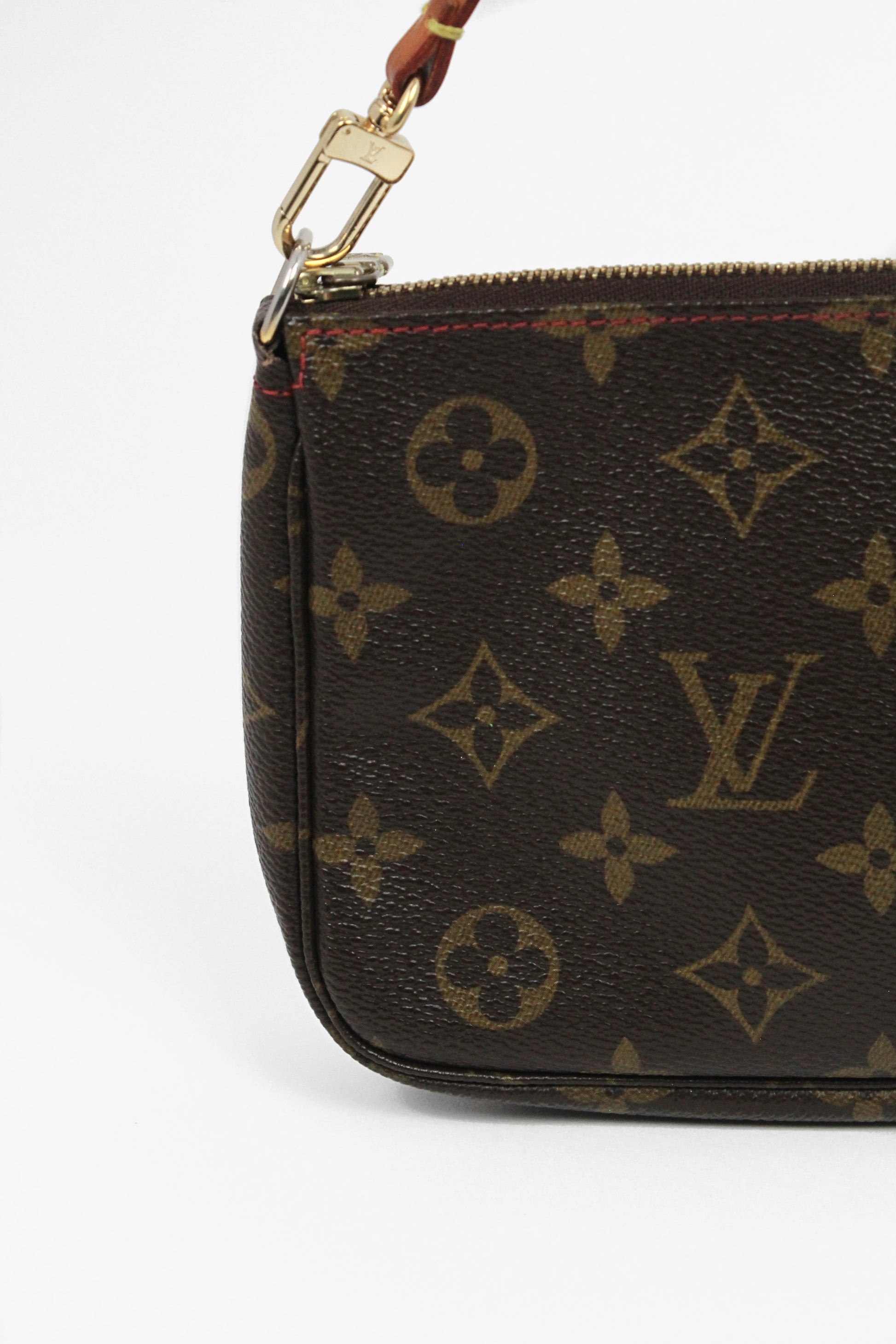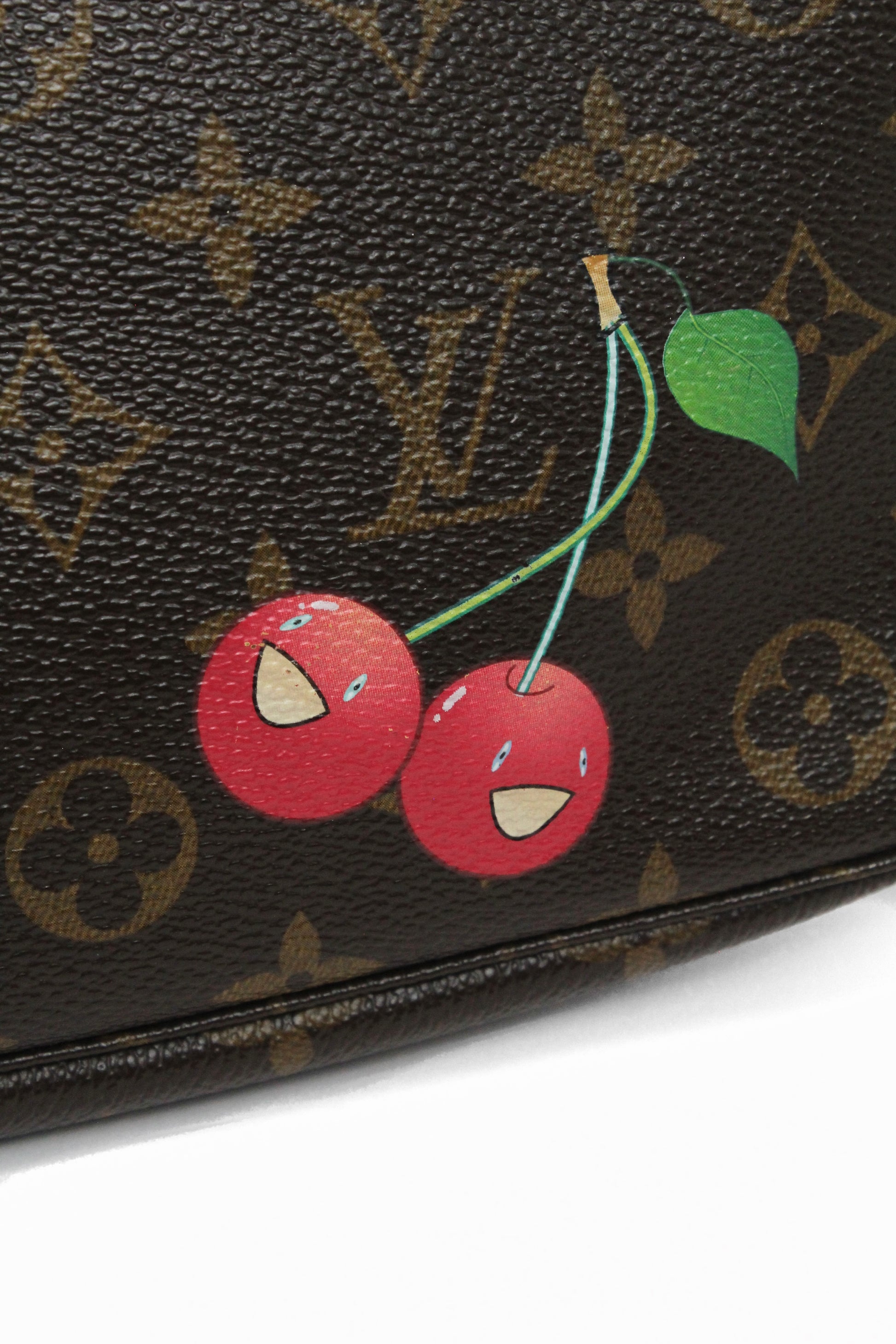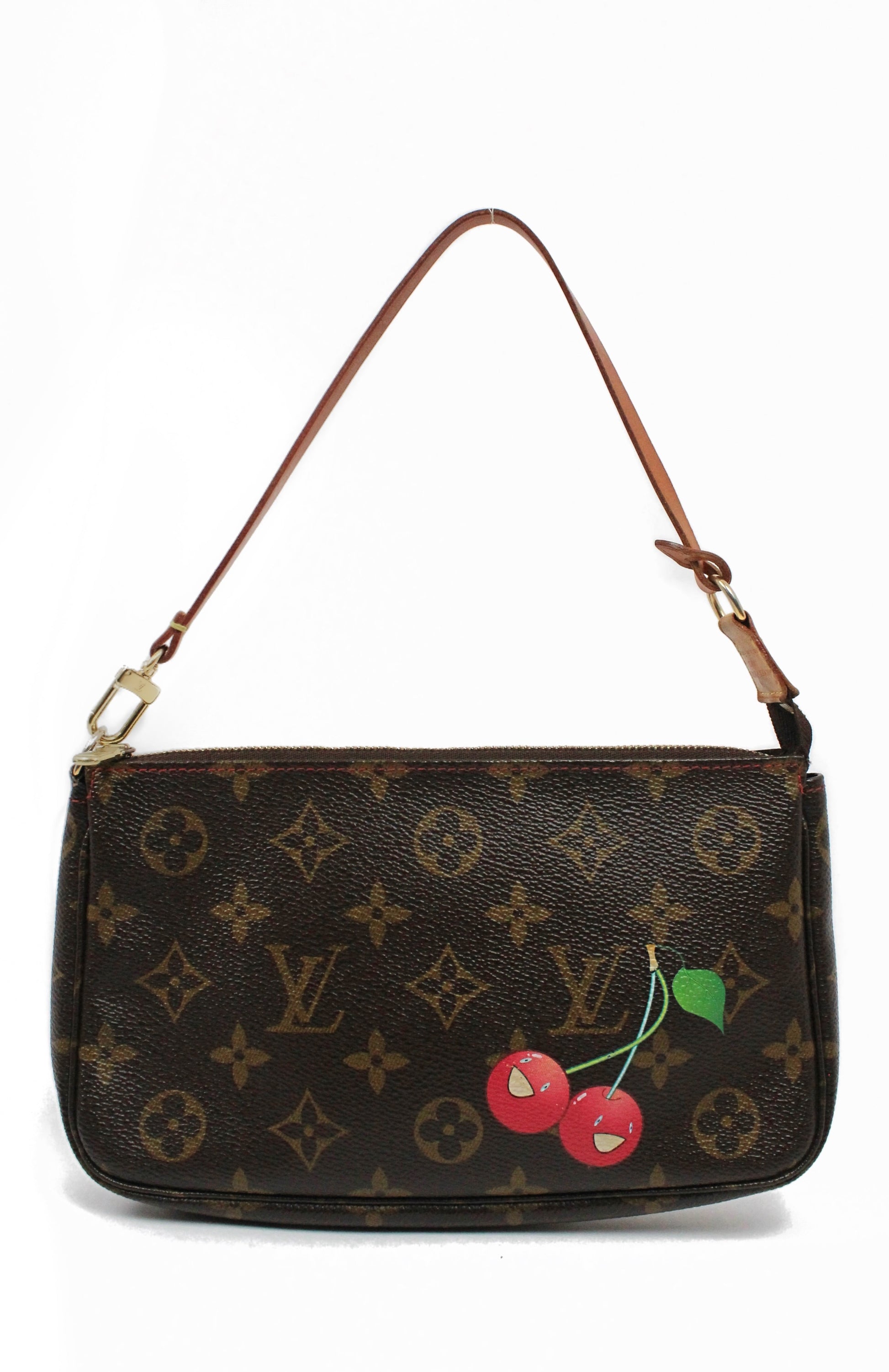 - The limited edition Louis Vuitton x Takashi Murakami Monogram Cherry Pochette with gold hardware is the perfect bag for everyday use. Original strap included with warm honey vachetta. The pochette features the iconic monogram canvas body, top zip closure, and textile lining. What sets this pochette apart are the two vibrant cherrys featured on the front of the bag! Spacious interior is in excellent shape. You can fit your phone, small wallet, keys, and a few other smaller essentials.